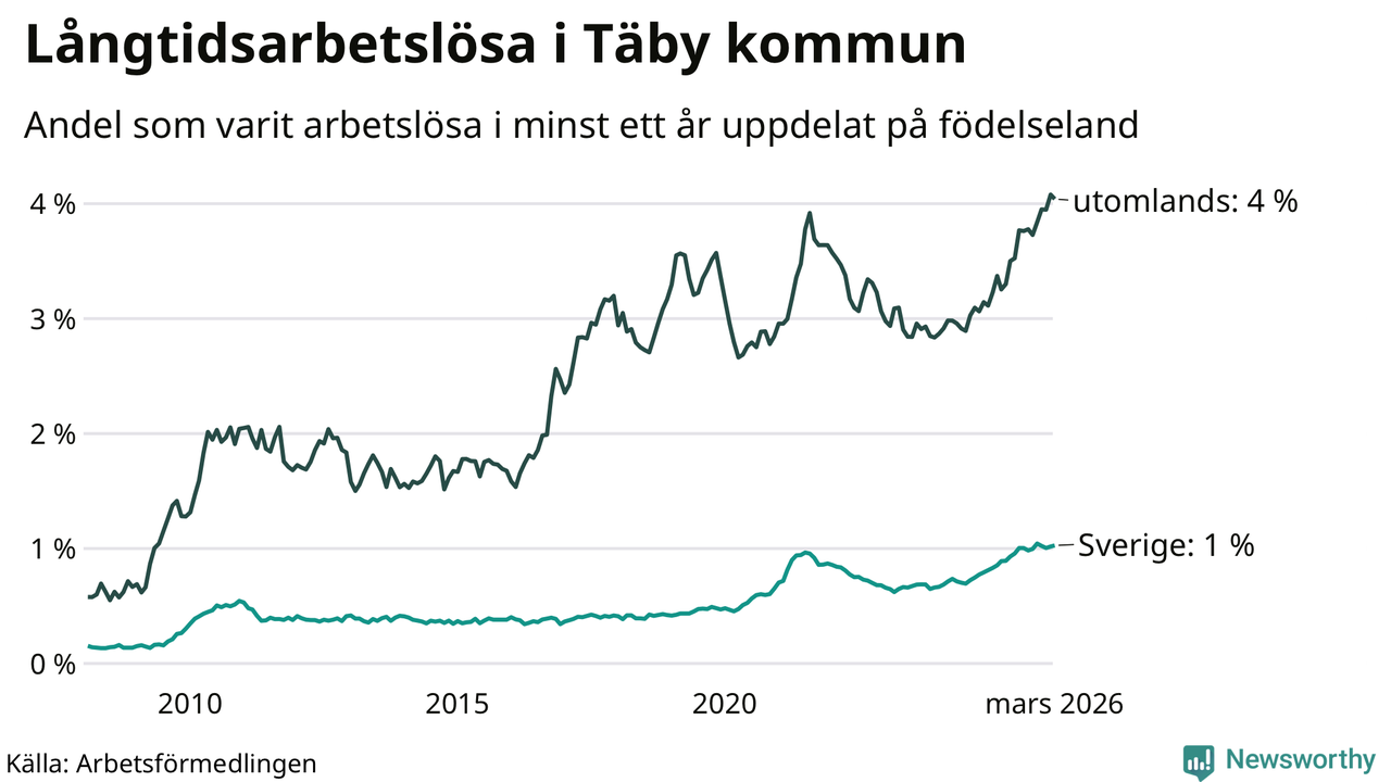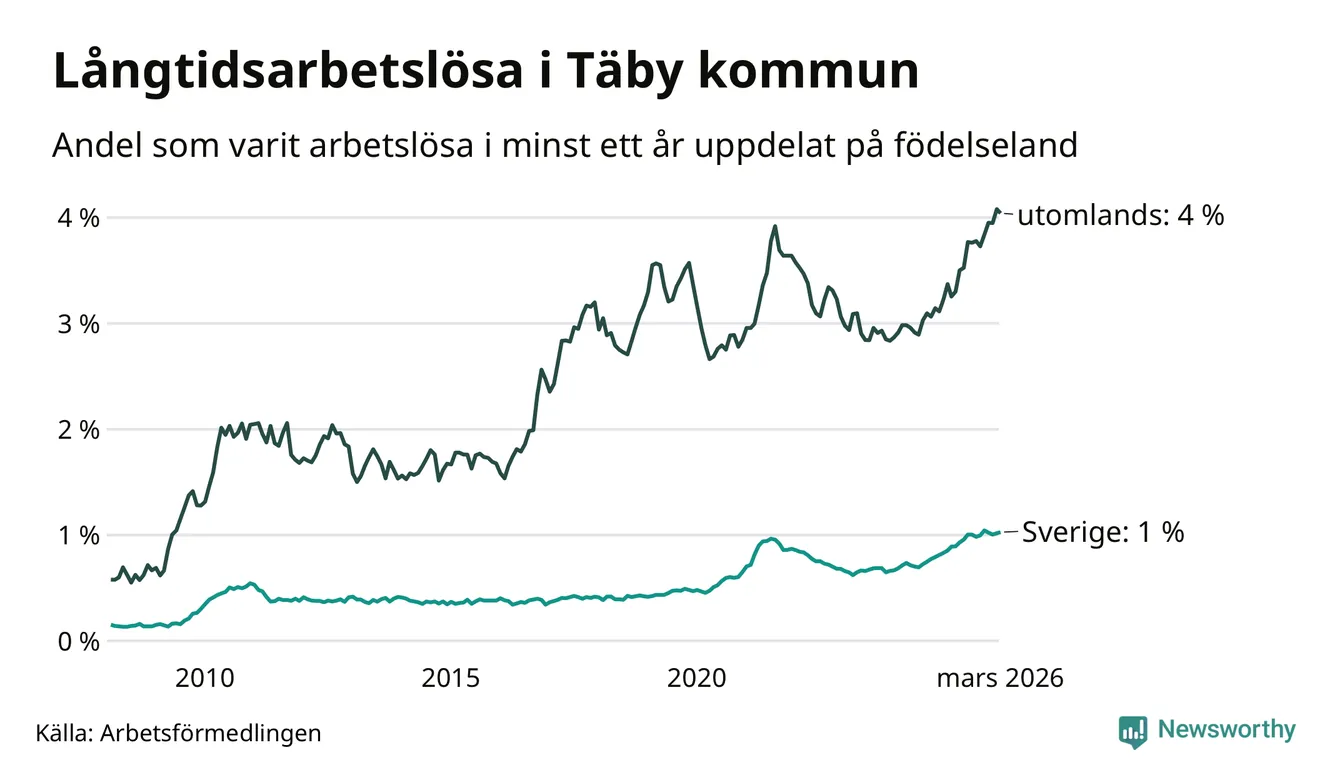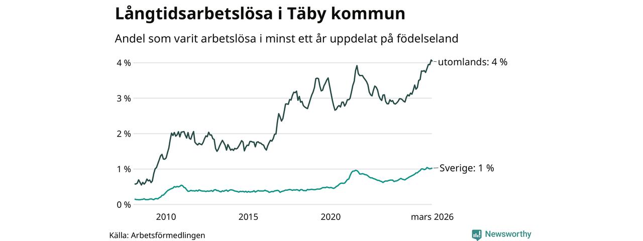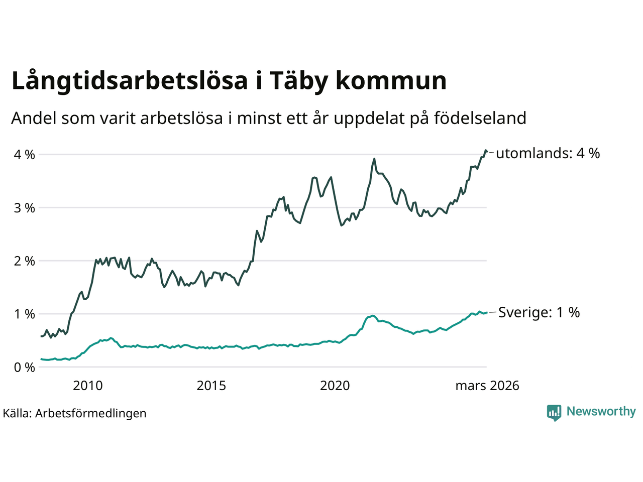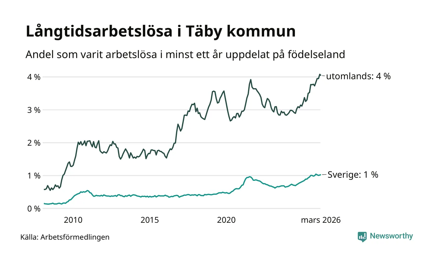 307 av de långtidsarbetslösa i Täby är födda i Sverige, medan 382 är födda utomlands. Det innebär att långtidsarbetslösheten bland Sverigefödda är 1,0 procent, medan den är fyra gånger så hög – 4,0 procent – bland födda utomlands. Även i riket som helhet är arbetslösheten högre bland utrikesfödda.