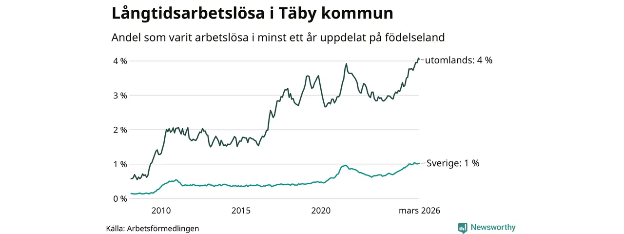 Långtidsarbetslösheten ökar i Täby jämfört med förra året. Samtidigt har andelen som står allra längst från arbetsmarknaden – som varit utan arbete i över två år – inte varit högre på åtminstone 15 år. Det visar Arbetsförmedlingens senaste månadsstatistik.