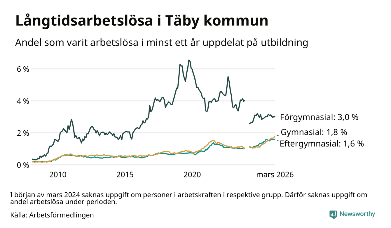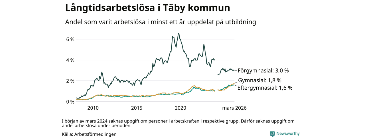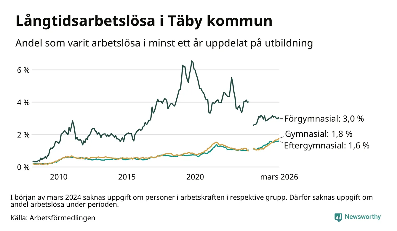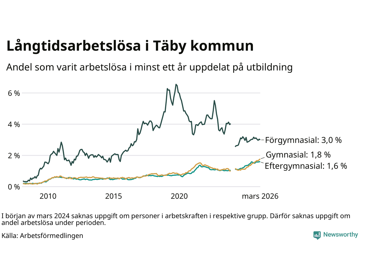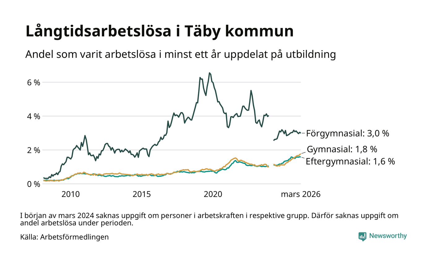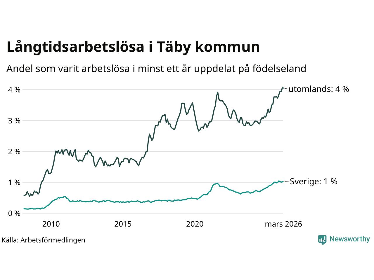 I mars hade 689 Täbybor varit arbetslösa i minst ett år, vilket är lika många som månaden innan. Det är den femte månaden i rad med ökande eller oförändrat antal långtidsarbetslösa. 689 personer motsvarar 1,8 procent av arbetskraften i kommunen – andelen långtidsarbetslösa är 0,3 procentenheter högre än samma månad för ett år sedan. Det är också den den näst högsta andelen långtidsarbetslösa under de senaste 15 åren.