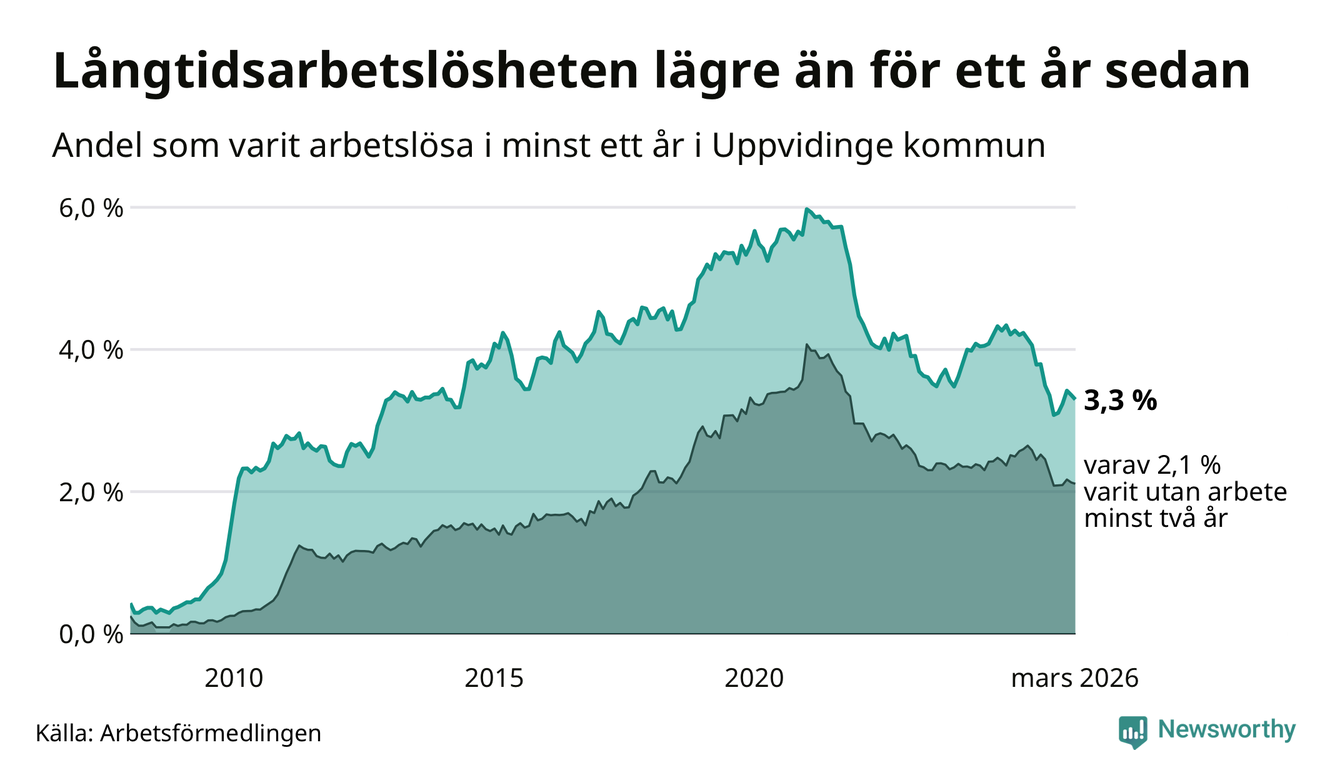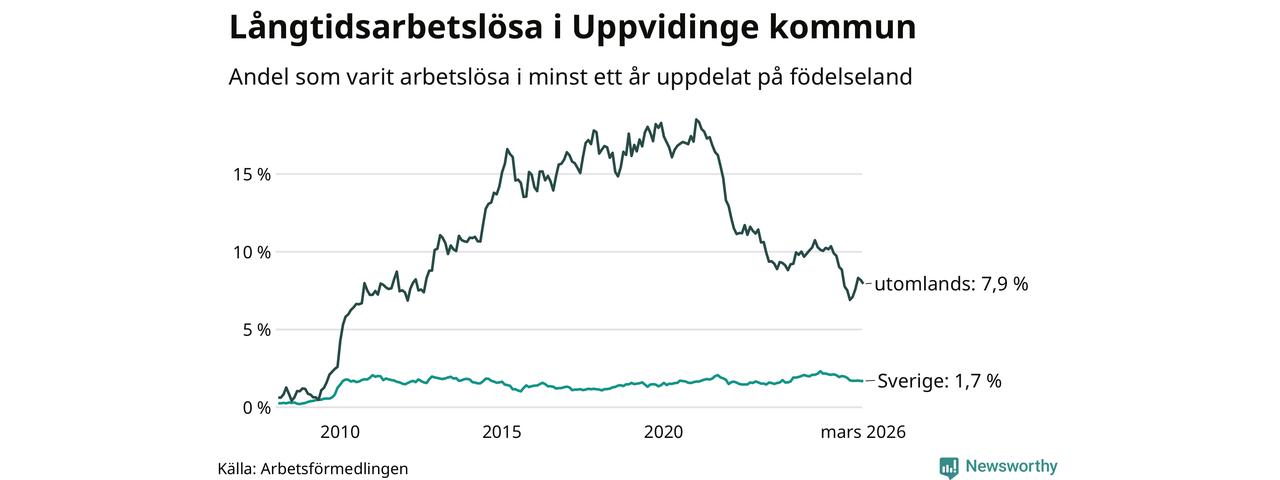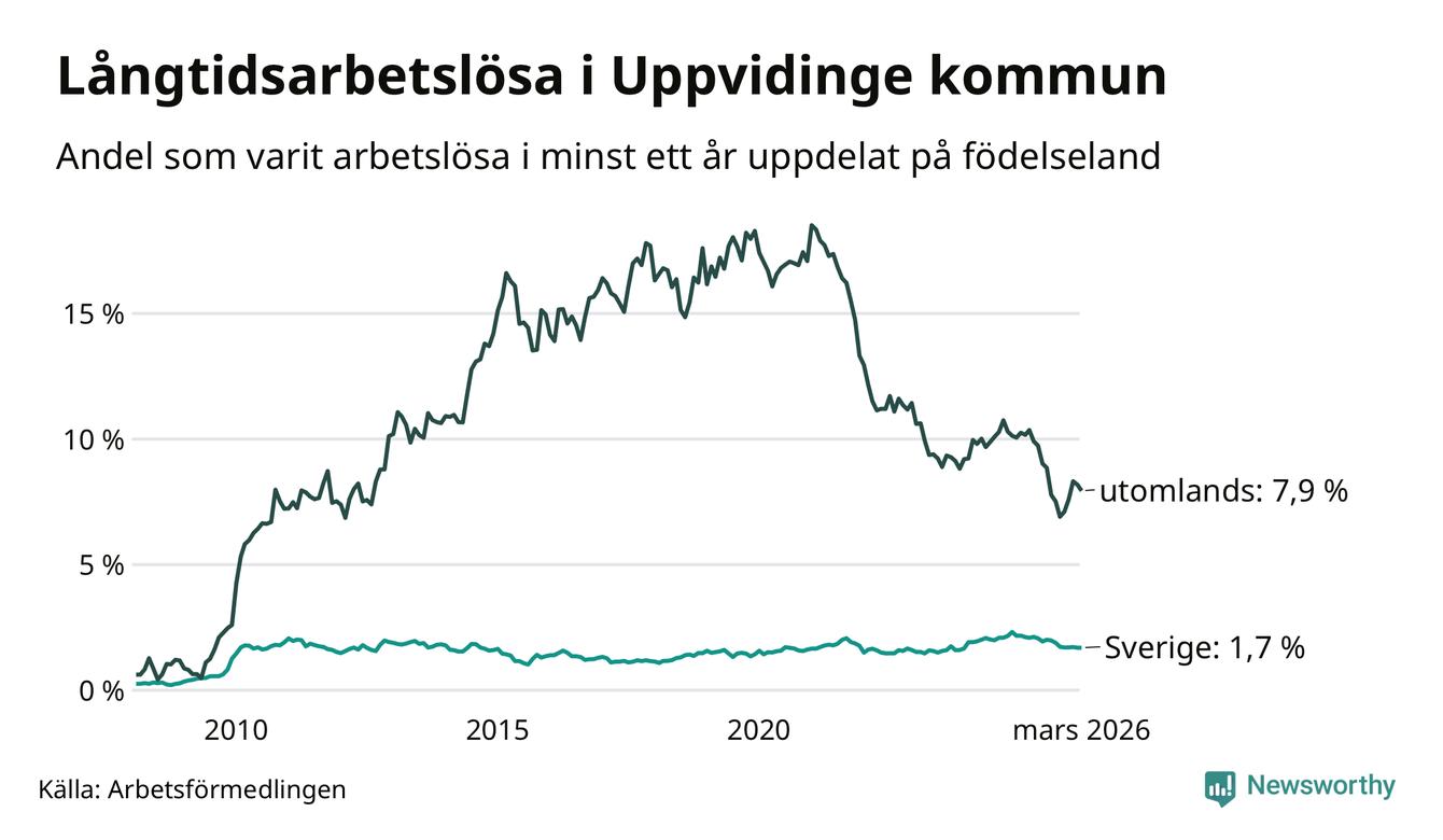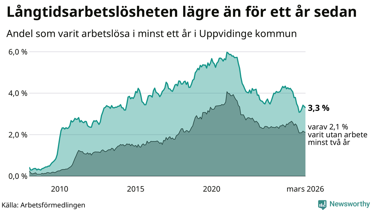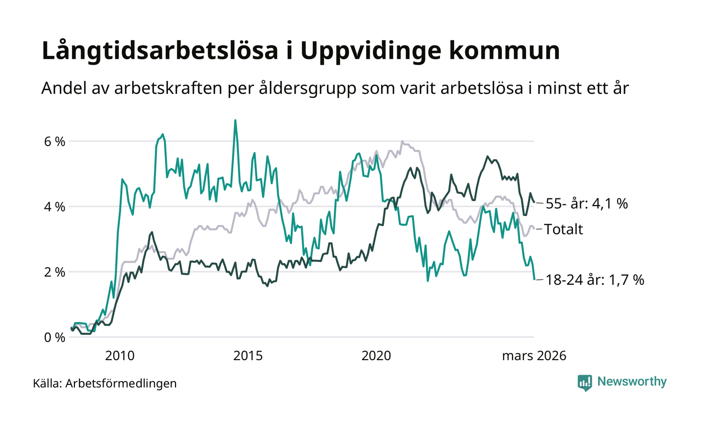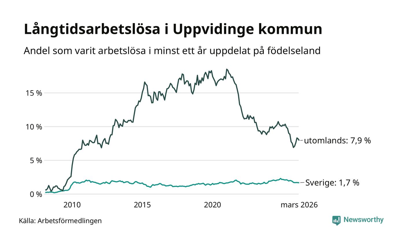 I mars hade 139 Uppvidingebor varit arbetslösa i minst ett år, vilket är tre färre än månaden innan. 139 personer motsvarar 3,3 procent av arbetskraften i kommunen – andelen långtidsarbetslösa är 0,9 procentenheter lägre än samma månad för ett år sedan.