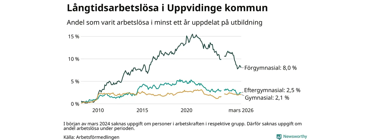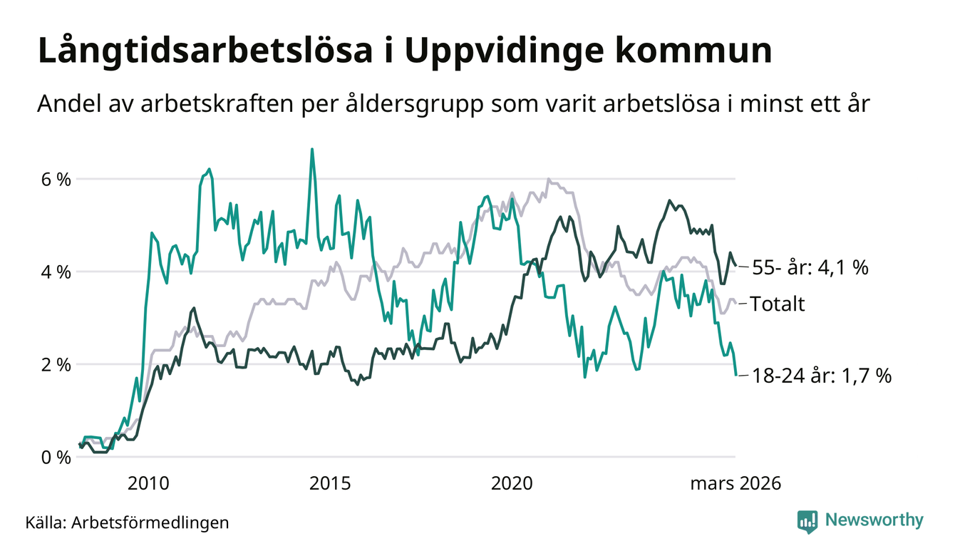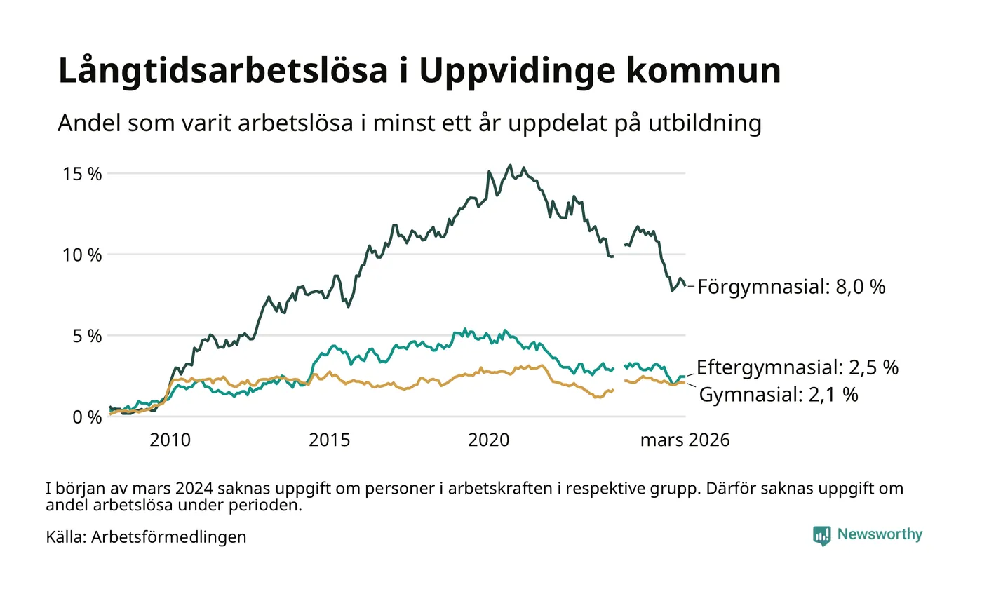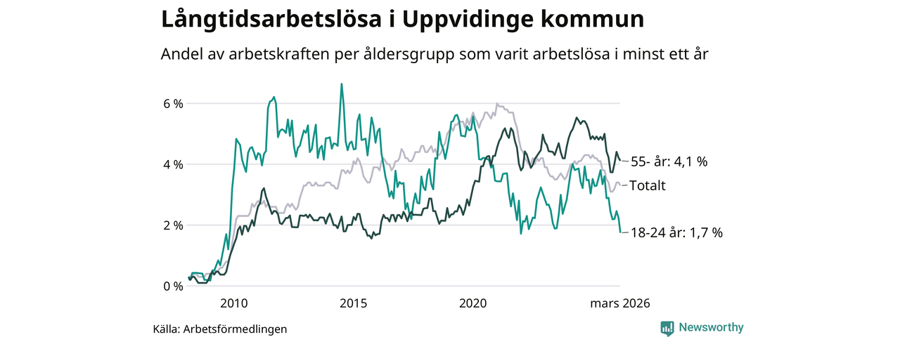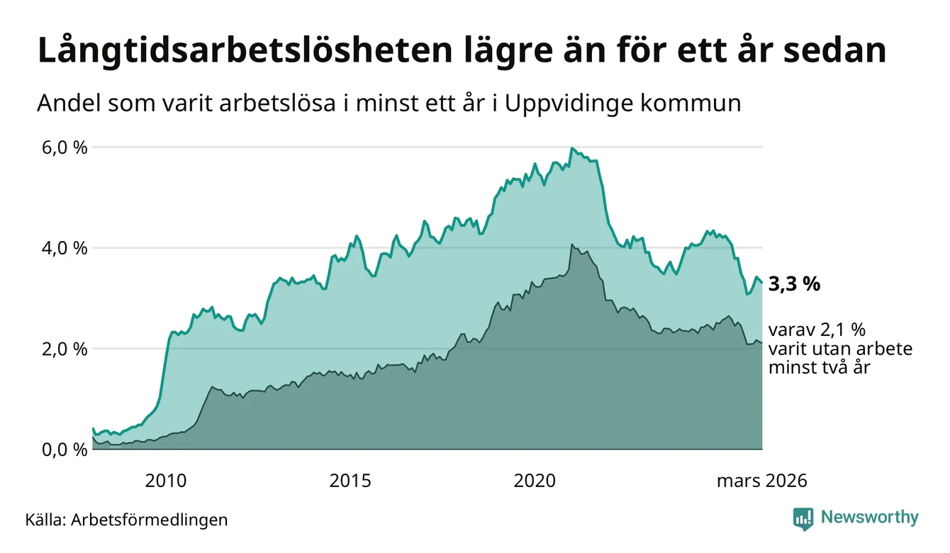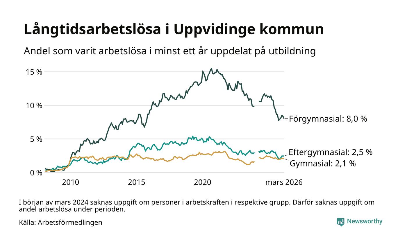 I mars hade 139 Uppvidingebor varit arbetslösa i minst ett år, vilket är tre färre än månaden innan. 139 personer motsvarar 3,3 procent av arbetskraften i kommunen – andelen långtidsarbetslösa är 0,9 procentenheter lägre än samma månad för ett år sedan.
