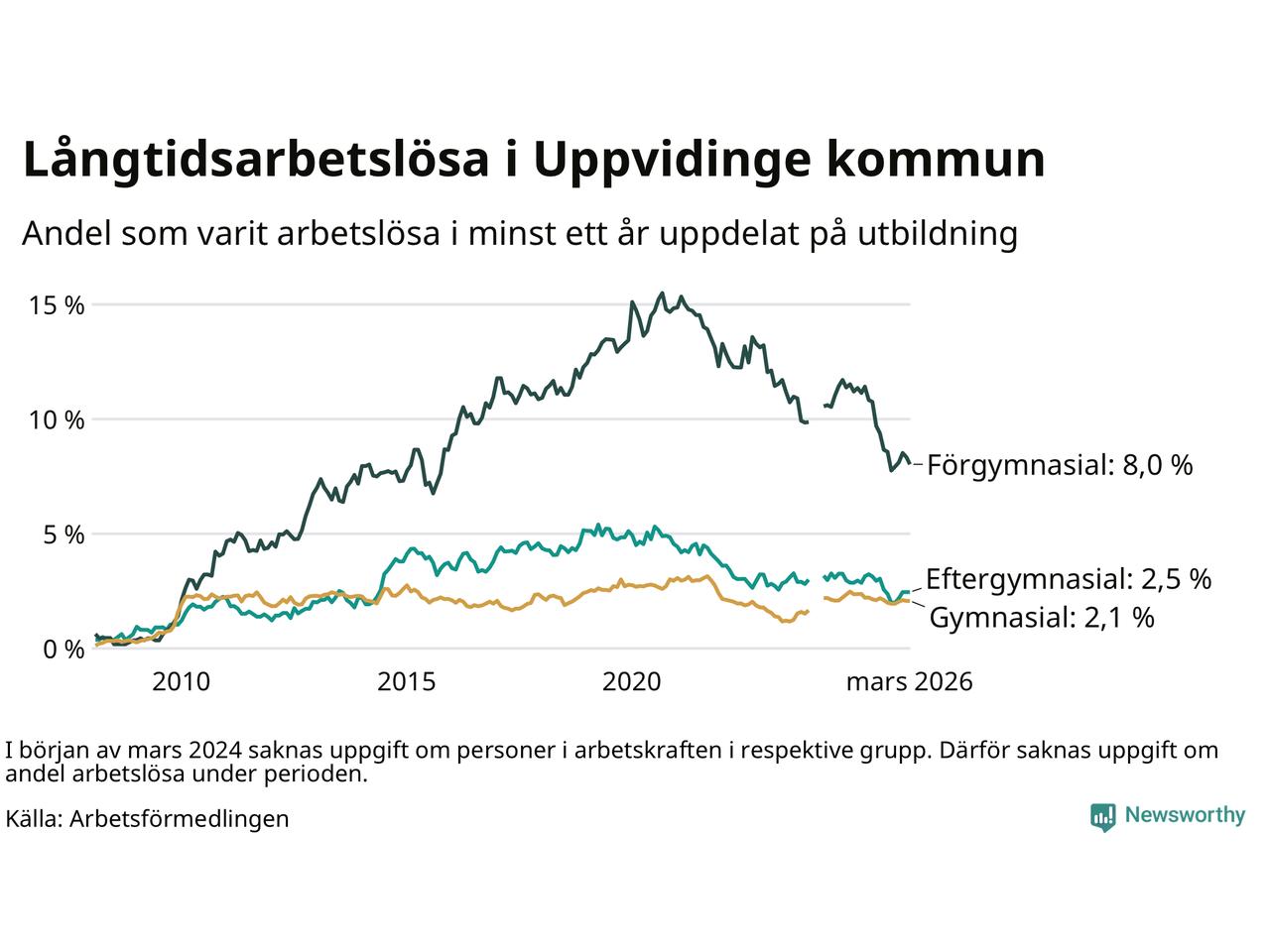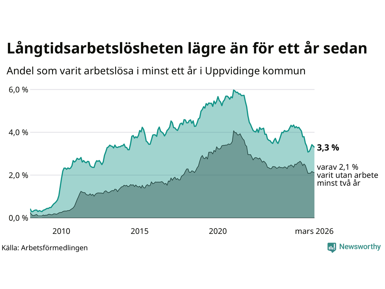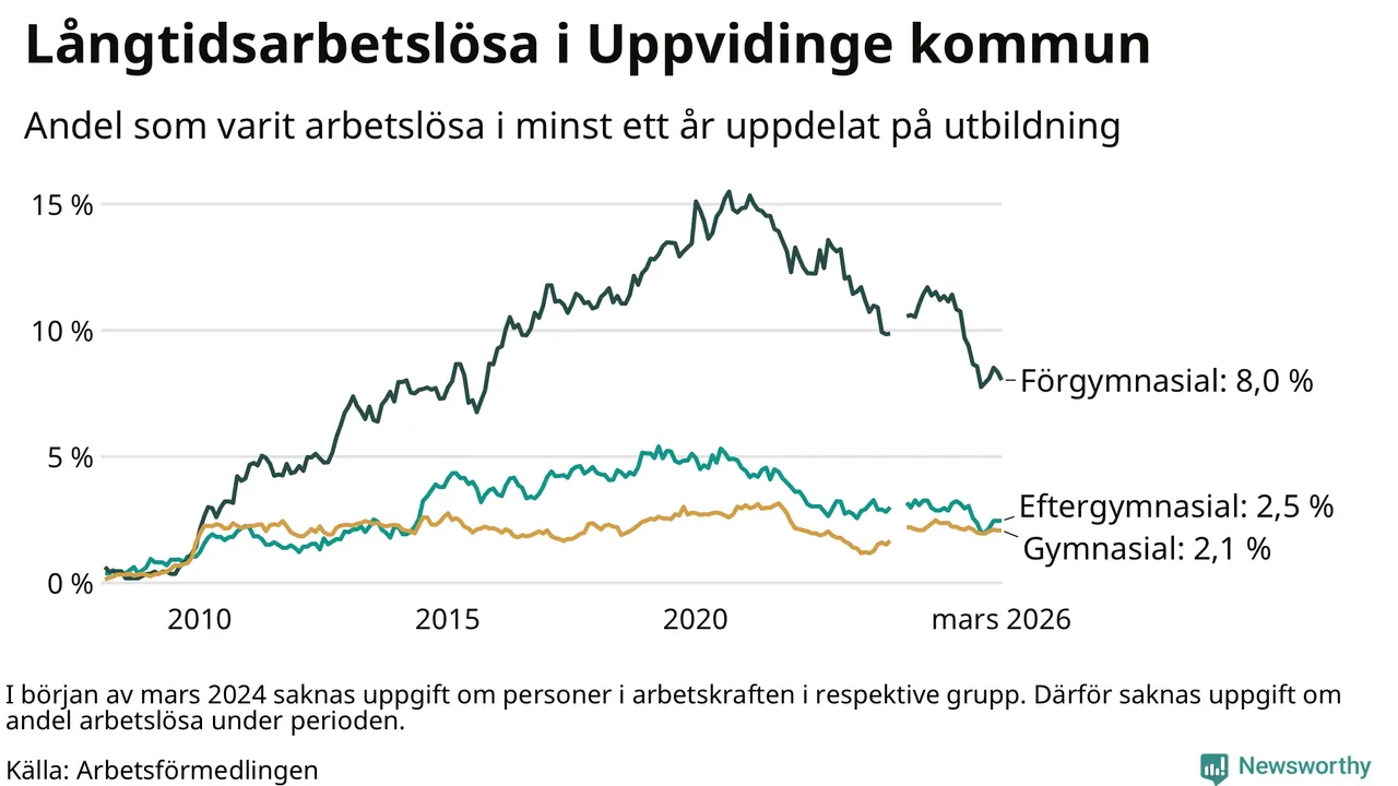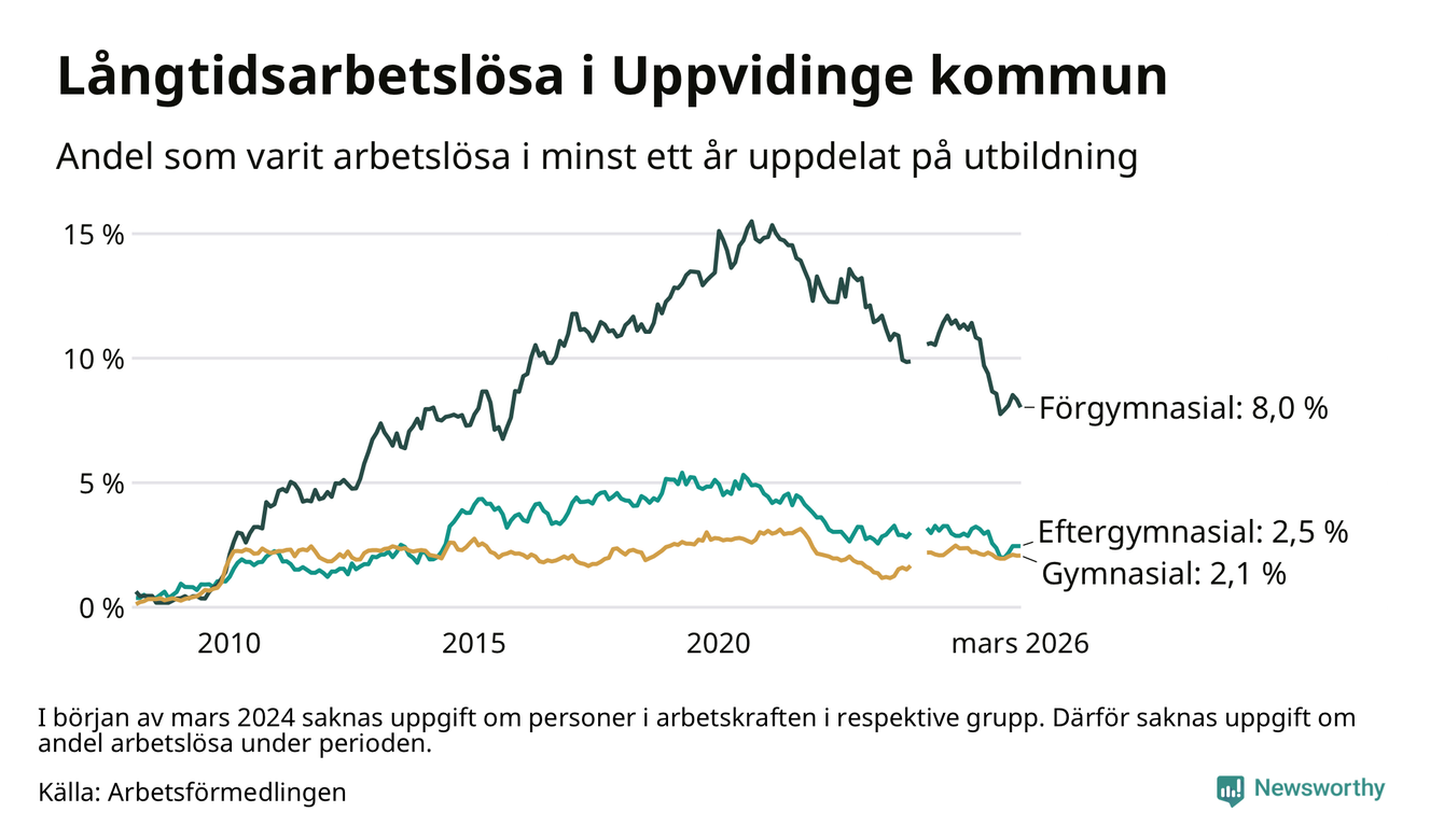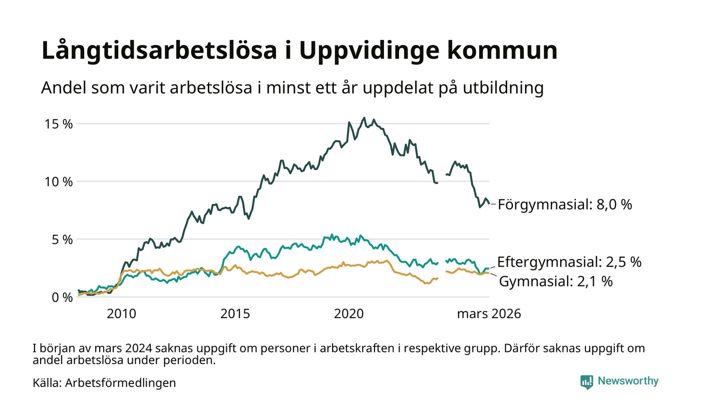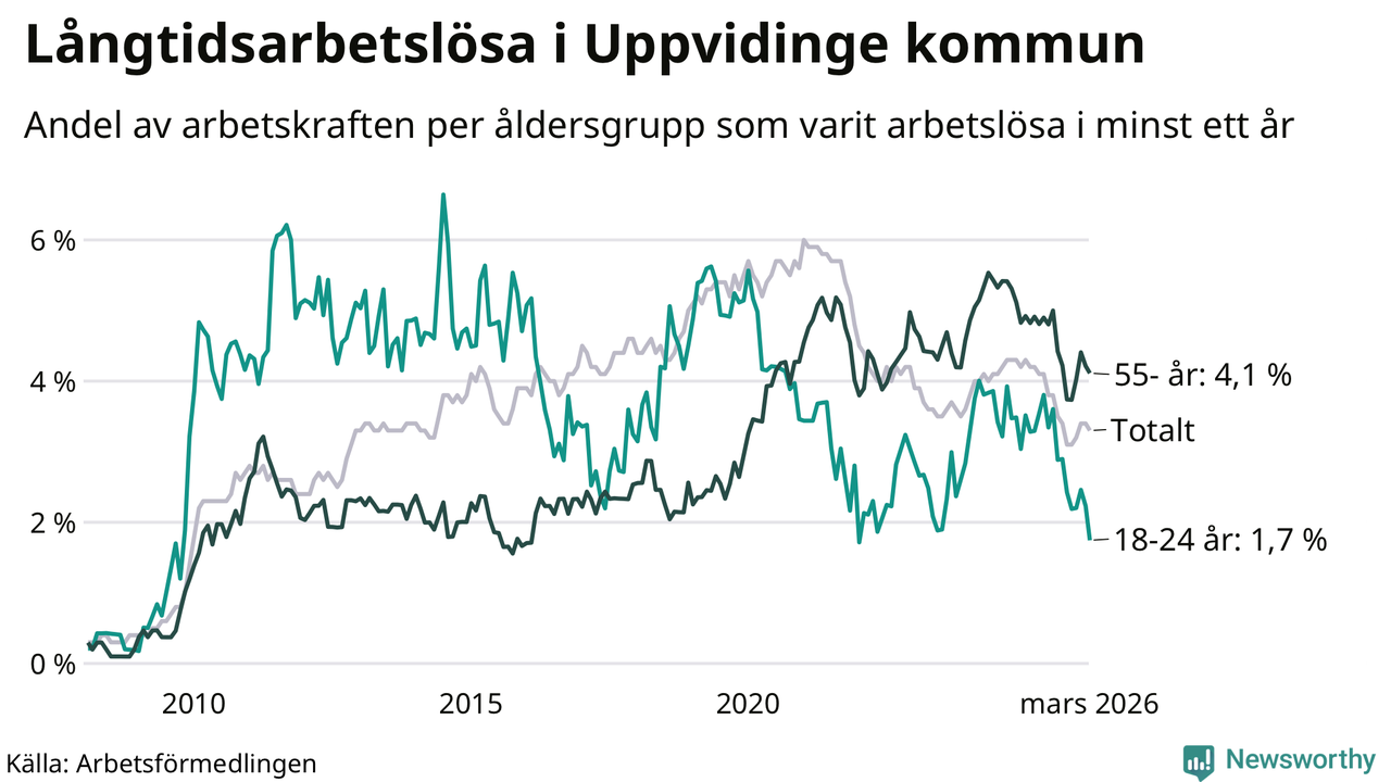 I mars hade 139 Uppvidingebor varit arbetslösa i minst ett år, vilket är tre färre än månaden innan. 139 personer motsvarar 3,3 procent av arbetskraften i kommunen – andelen långtidsarbetslösa är 0,9 procentenheter lägre än samma månad för ett år sedan.