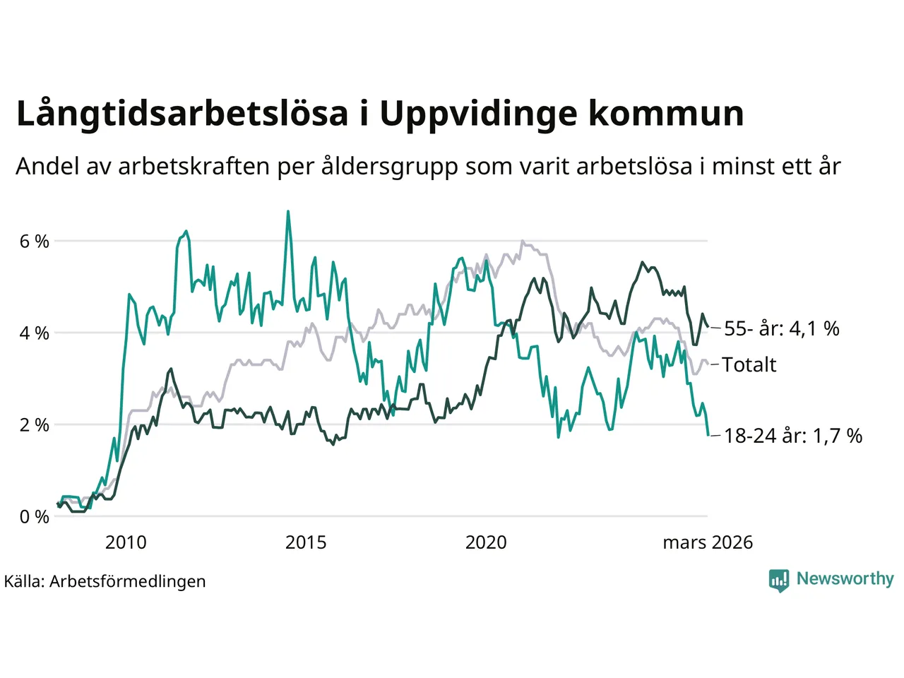 Av de 139 personerna som varit arbetslösa i mer än ett år i Uppvidinge kommun är 43 personer mellan 55 och 661 år och sju är mellan 18 och 24 år. För den äldre gruppen är andelen arbetslösa 4,1 procent medan den i den yngre gruppen är 1,7 procent. Även i riket som helhet är långtidsarbetslösheten högre i gruppen äldre.