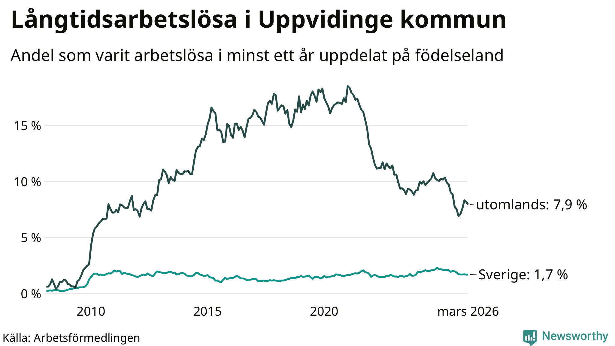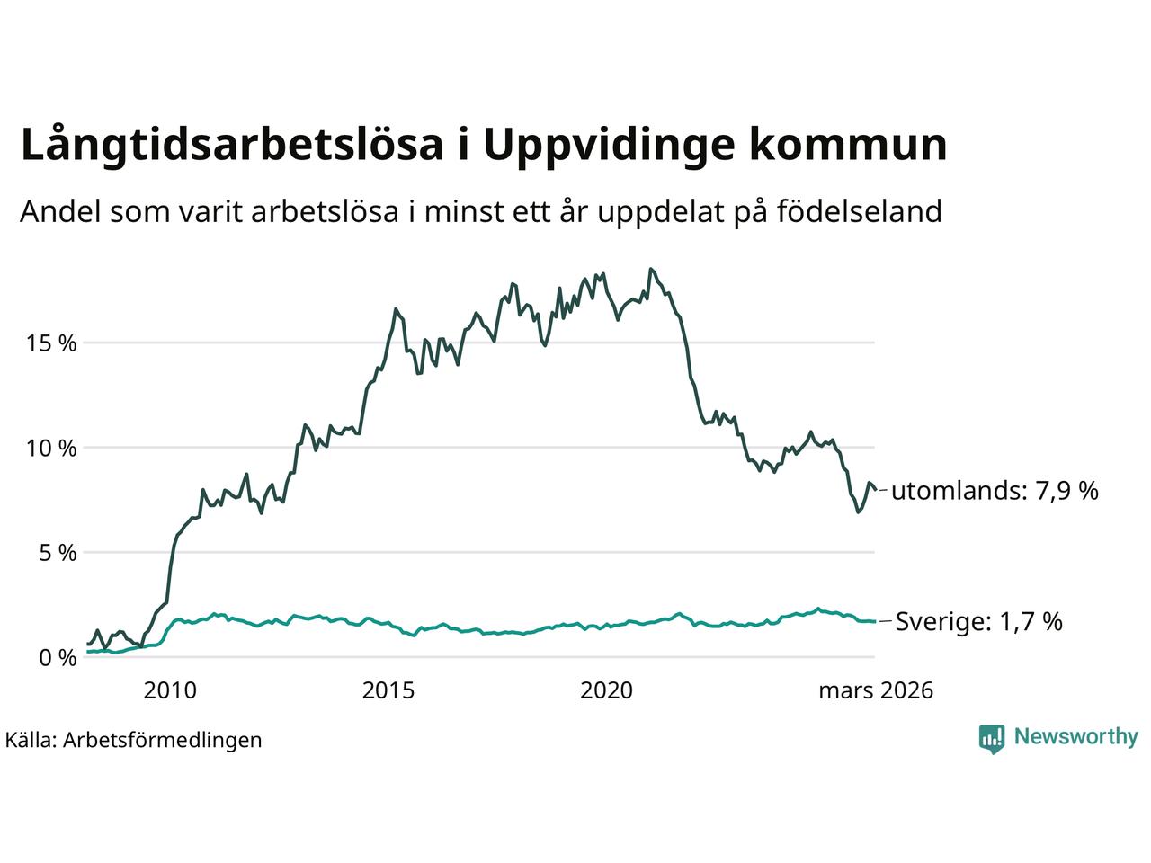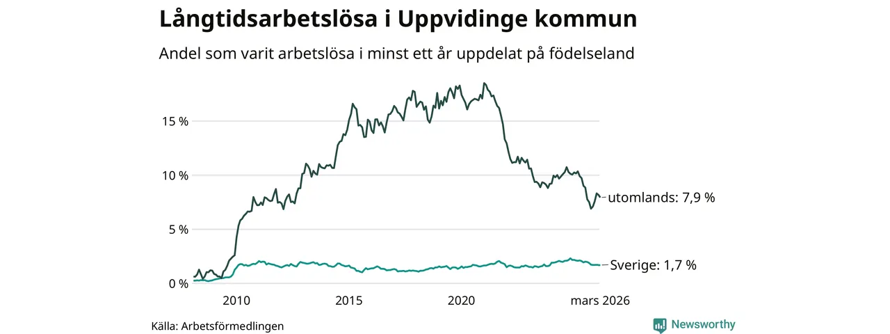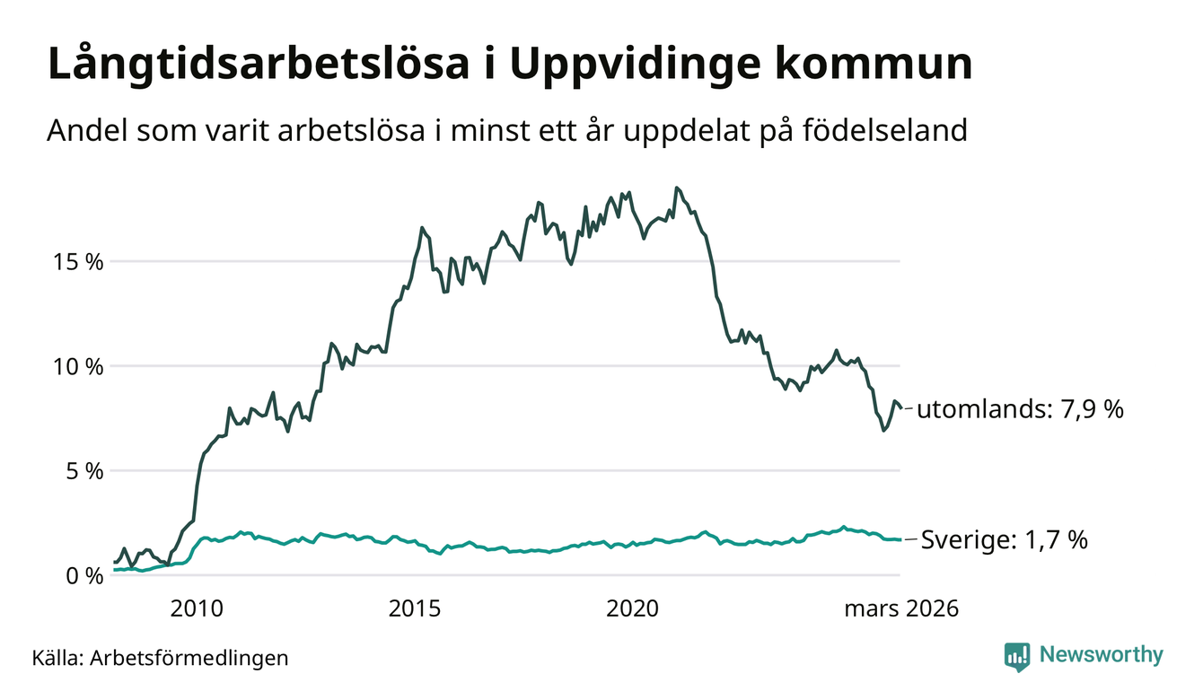 53 av de långtidsarbetslösa i Uppvidinge är födda i Sverige, medan 86 är födda utomlands. Det innebär att långtidsarbetslösheten bland Sverigefödda är 1,7 procent, medan den är fem gånger så hög – 7,9 procent – bland födda utomlands. Även i riket som helhet är arbetslösheten högre bland utrikesfödda.