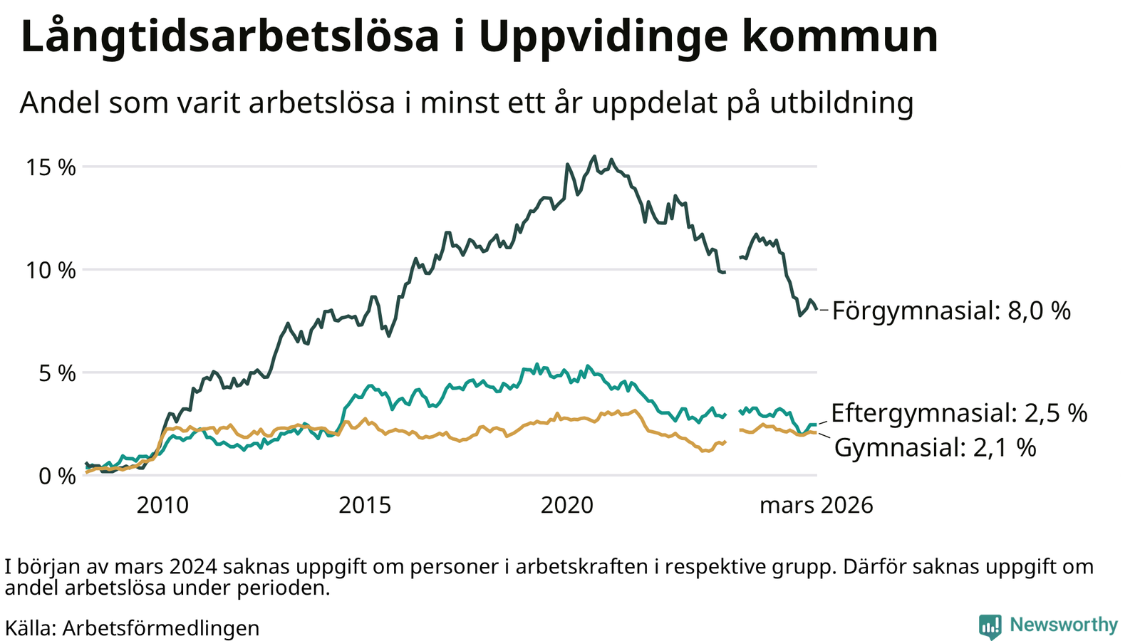 Totalt i riket hade omkring 152 000 personer varit utan arbete i minst ett år i mars. Det motsvarar 2,9 procent av arbetskraften, vilket är ungefär lika stor andel som för ett år sedan.