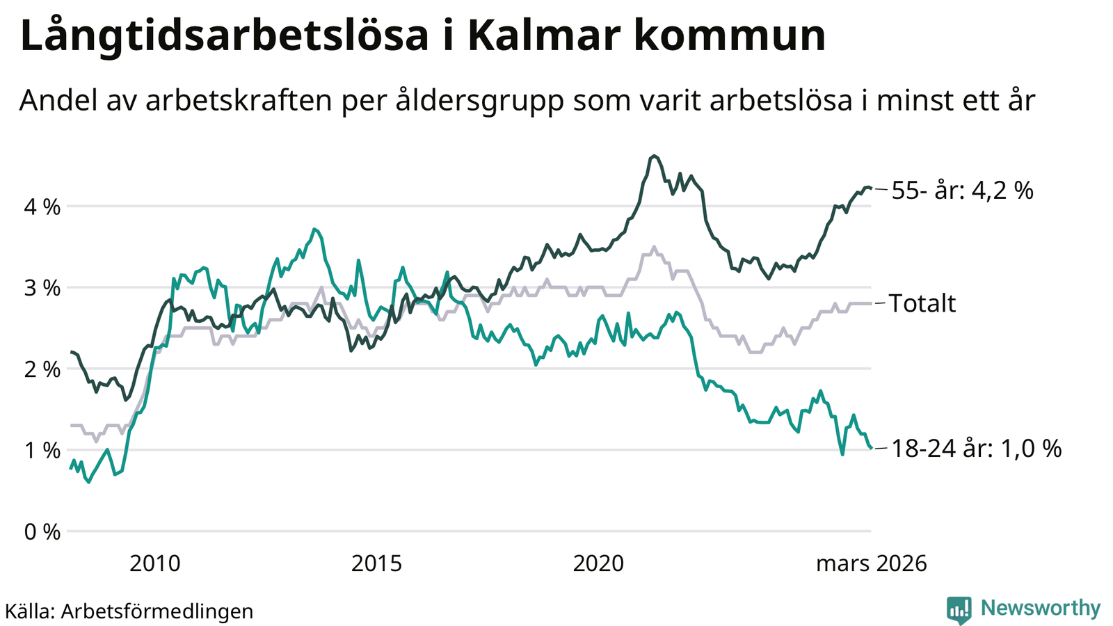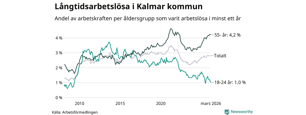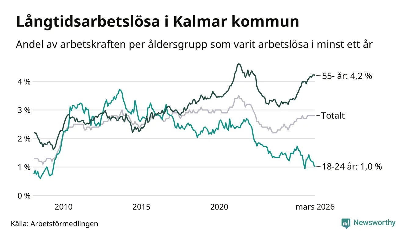 Av de 1 038 personerna som varit arbetslösa i mer än ett år i Kalmar kommun är 318 personer mellan 55 och 661 år och 43 är mellan 18 och 24 år. För den äldre gruppen är andelen arbetslösa 4,2 procent medan den i den yngre gruppen är 1,0 procent. Även i riket som helhet är långtidsarbetslösheten högre i gruppen äldre.