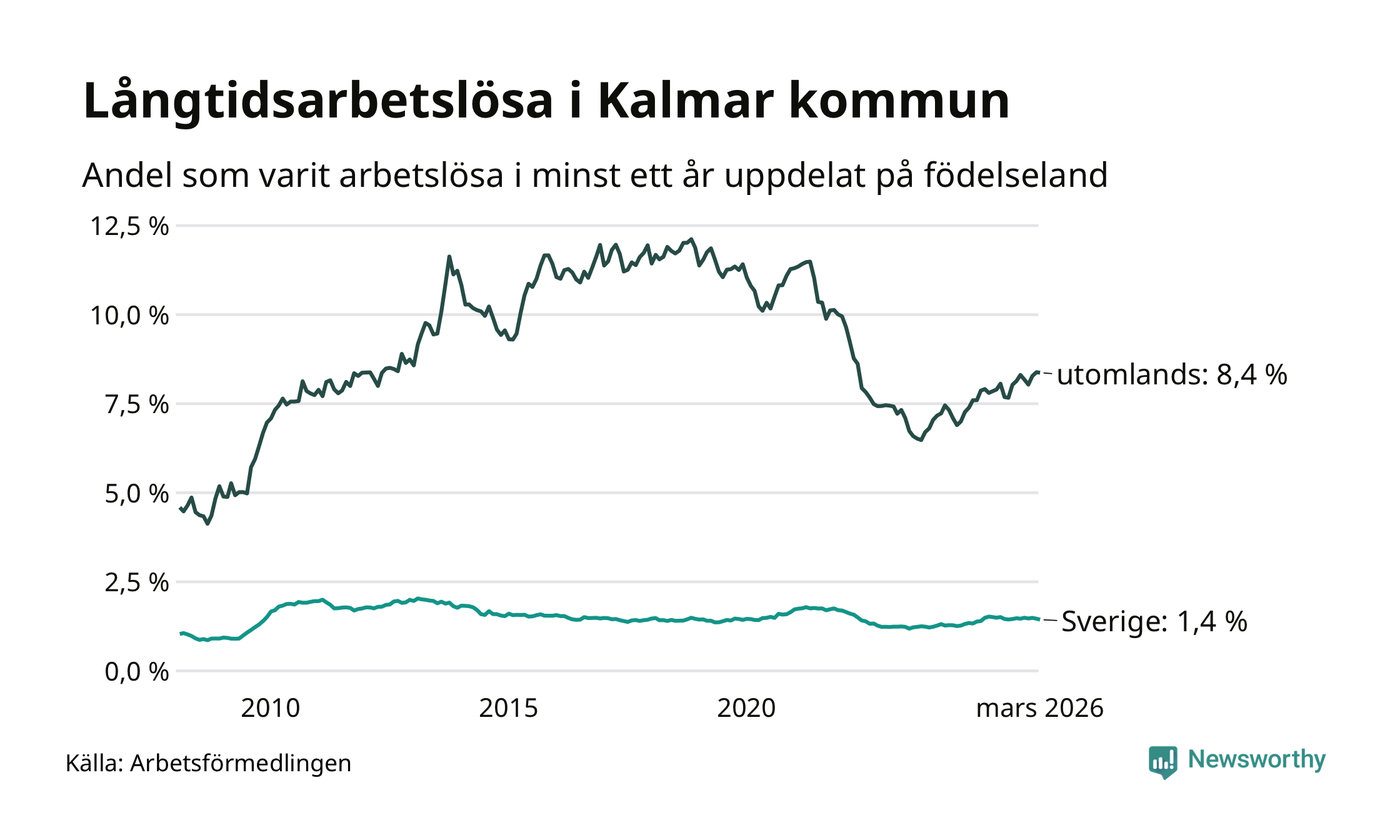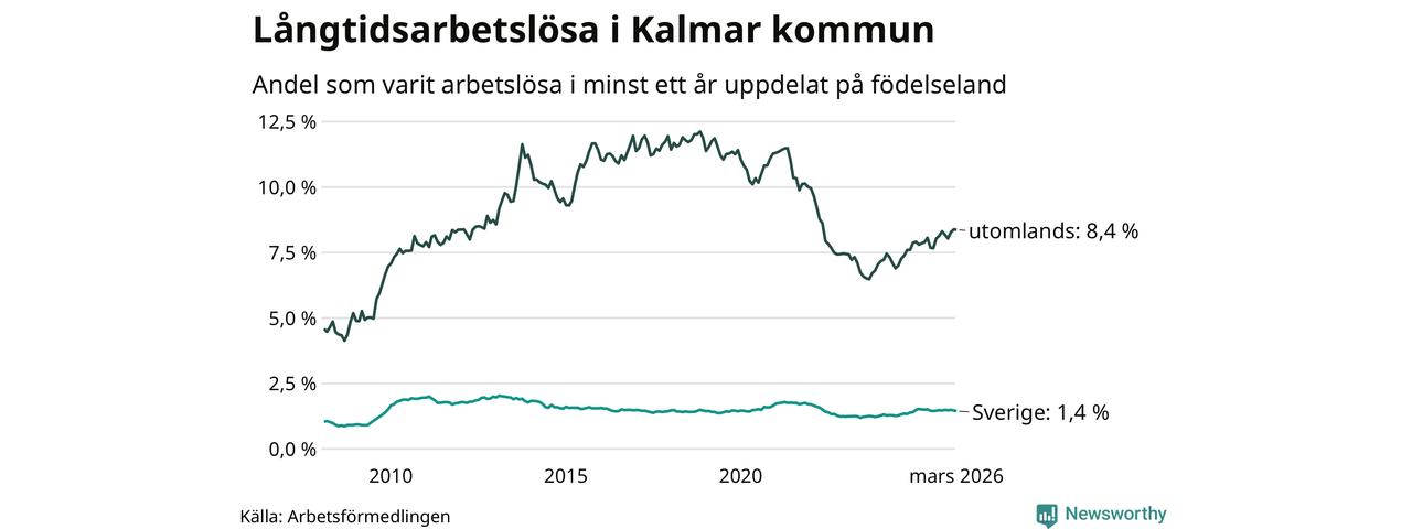 431 av de långtidsarbetslösa i Kalmar kommun är födda i Sverige, medan 607 är födda utomlands. Det innebär att långtidsarbetslösheten bland Sverigefödda är 1,4 procent, medan den är sex gånger så hög – 8,4 procent – bland födda utomlands. Även i riket som helhet är arbetslösheten högre bland utrikesfödda.