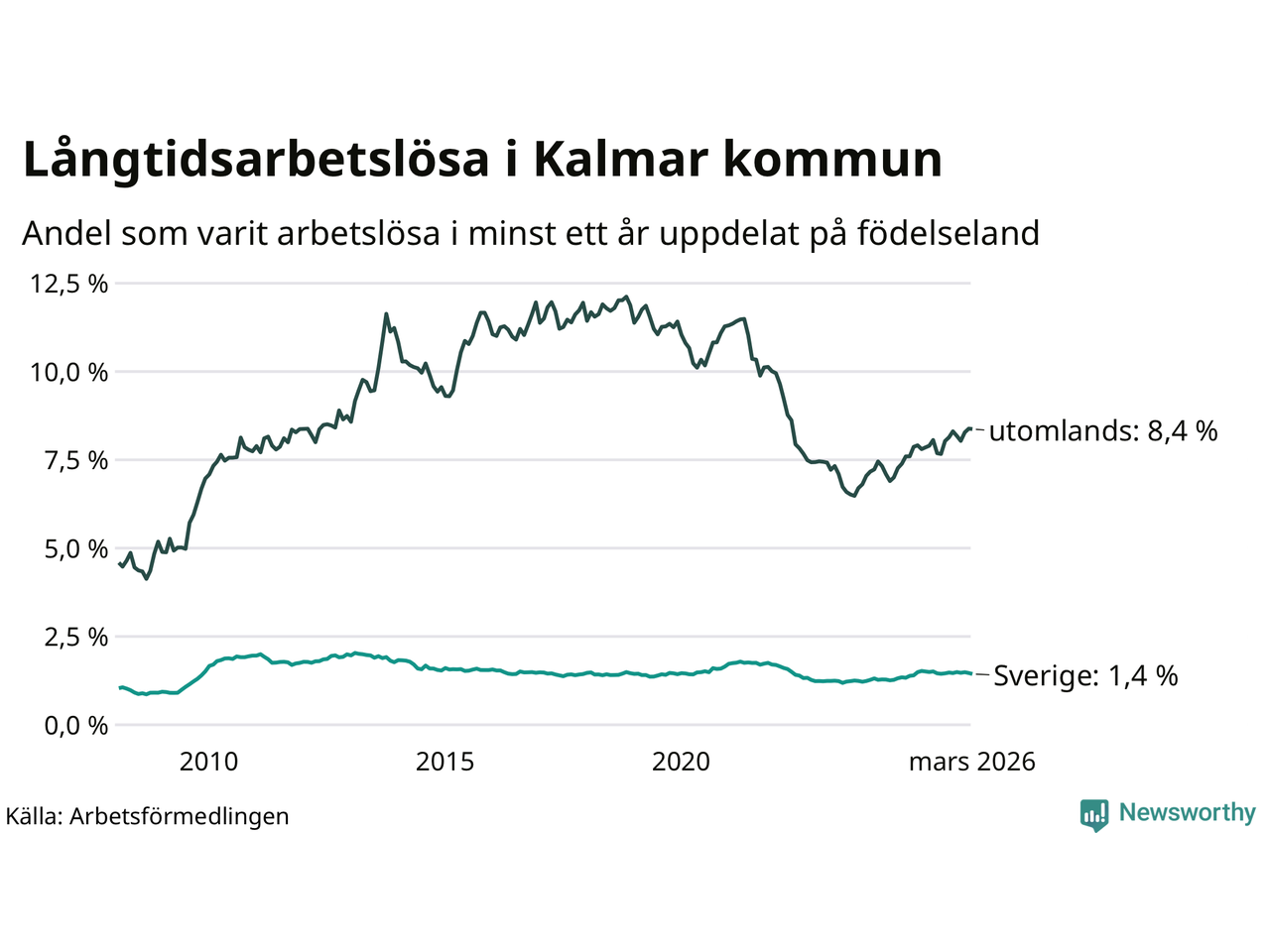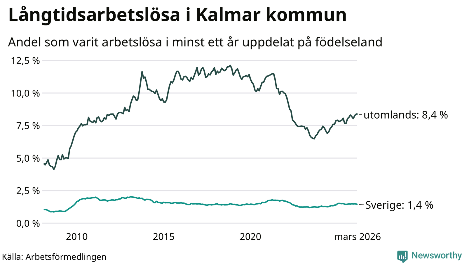 Graf: Andel arbetslösa uppdelat på födelseland i Kalmar kommun