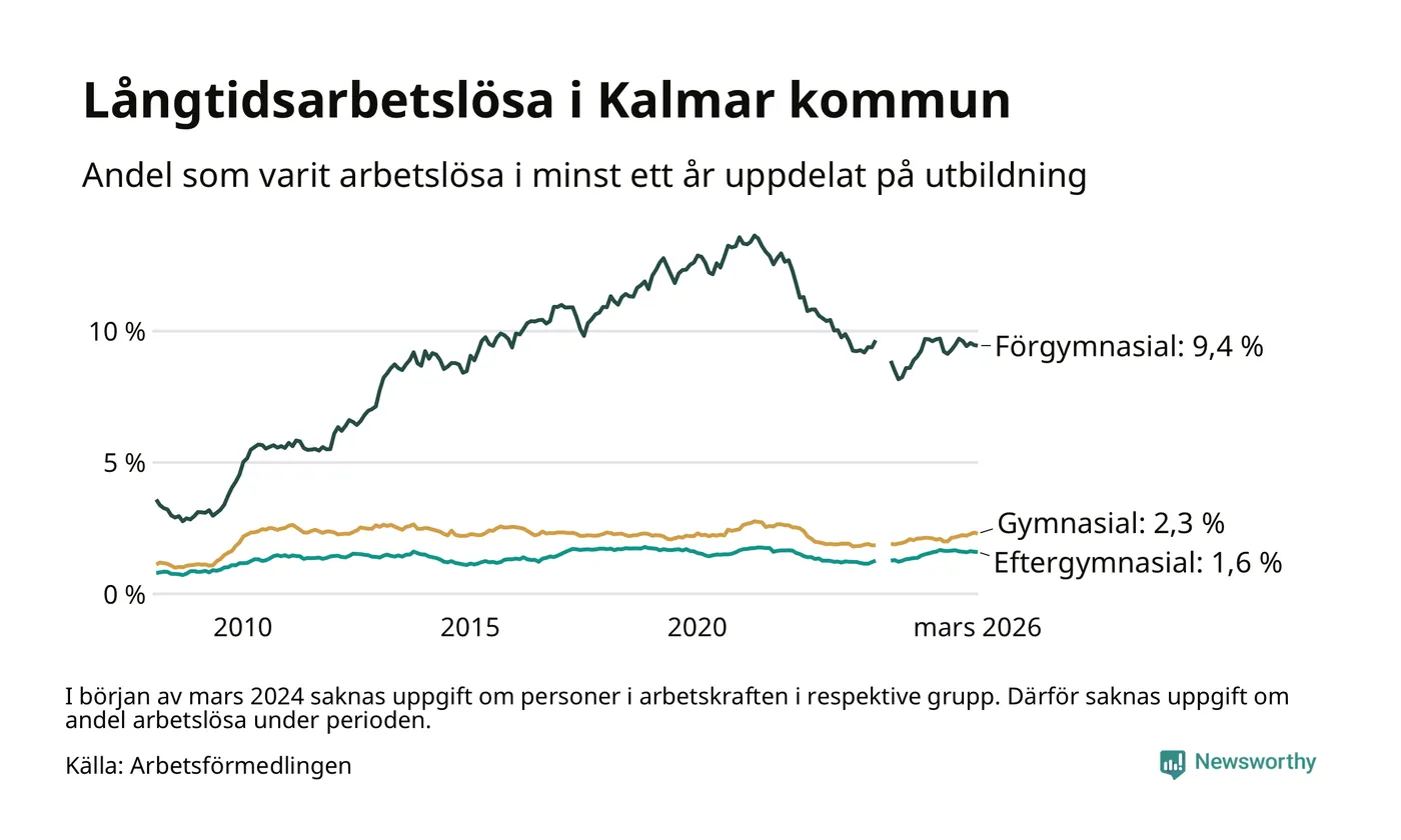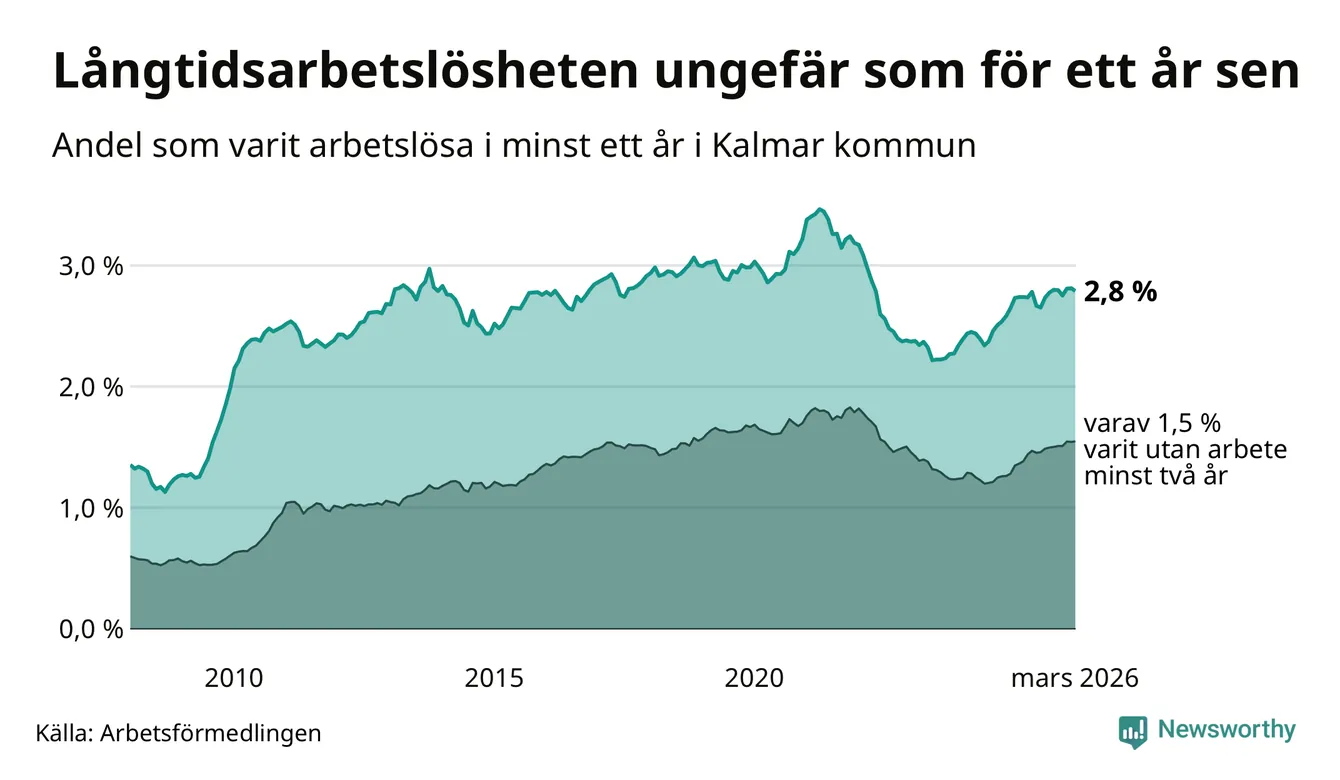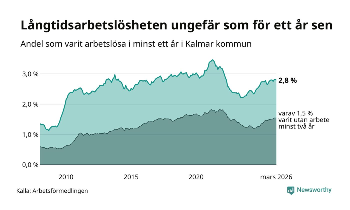 I mars hade 1 038 Kalmarbor varit arbetslösa i minst ett år, vilket är åtta färre än månaden innan. 1 038 personer motsvarar 2,8 procent av arbetskraften i kommunen – andelen långtidsarbetslösa är ungefär på samma nivå som för ett år sedan.
