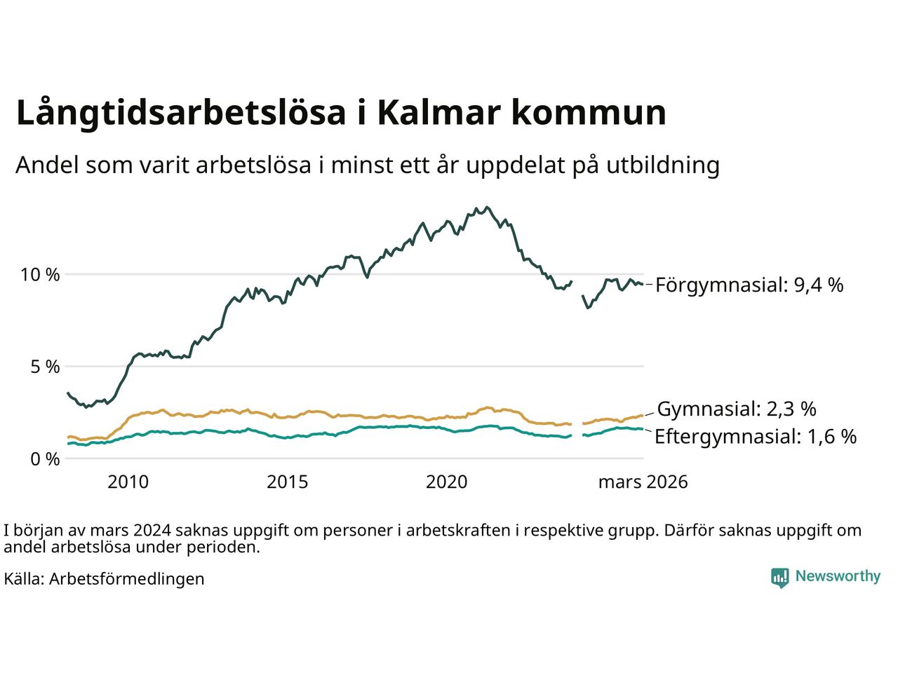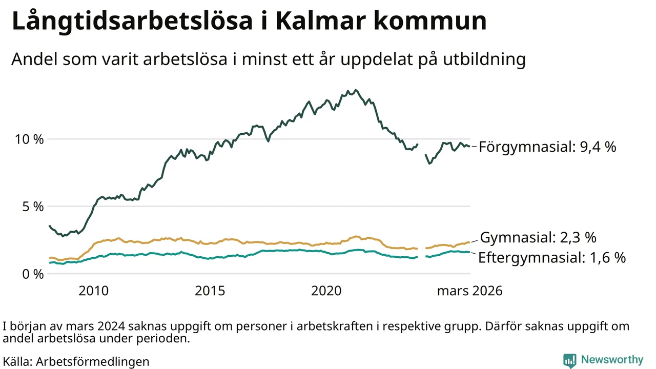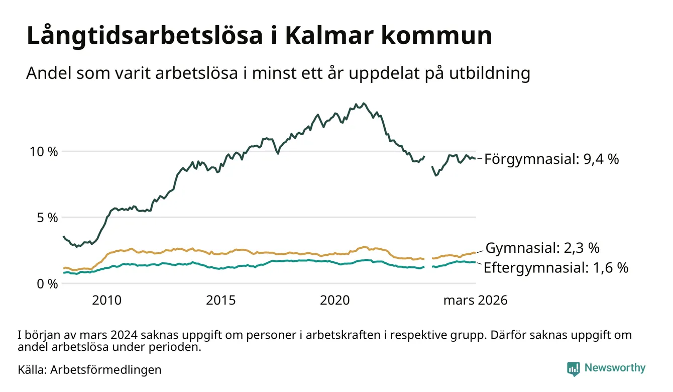 I mars hade 1 038 Kalmarbor varit arbetslösa i minst ett år, vilket är åtta färre än månaden innan. 1 038 personer motsvarar 2,8 procent av arbetskraften i kommunen – andelen långtidsarbetslösa är ungefär på samma nivå som för ett år sedan.