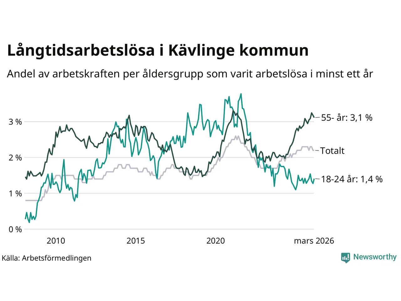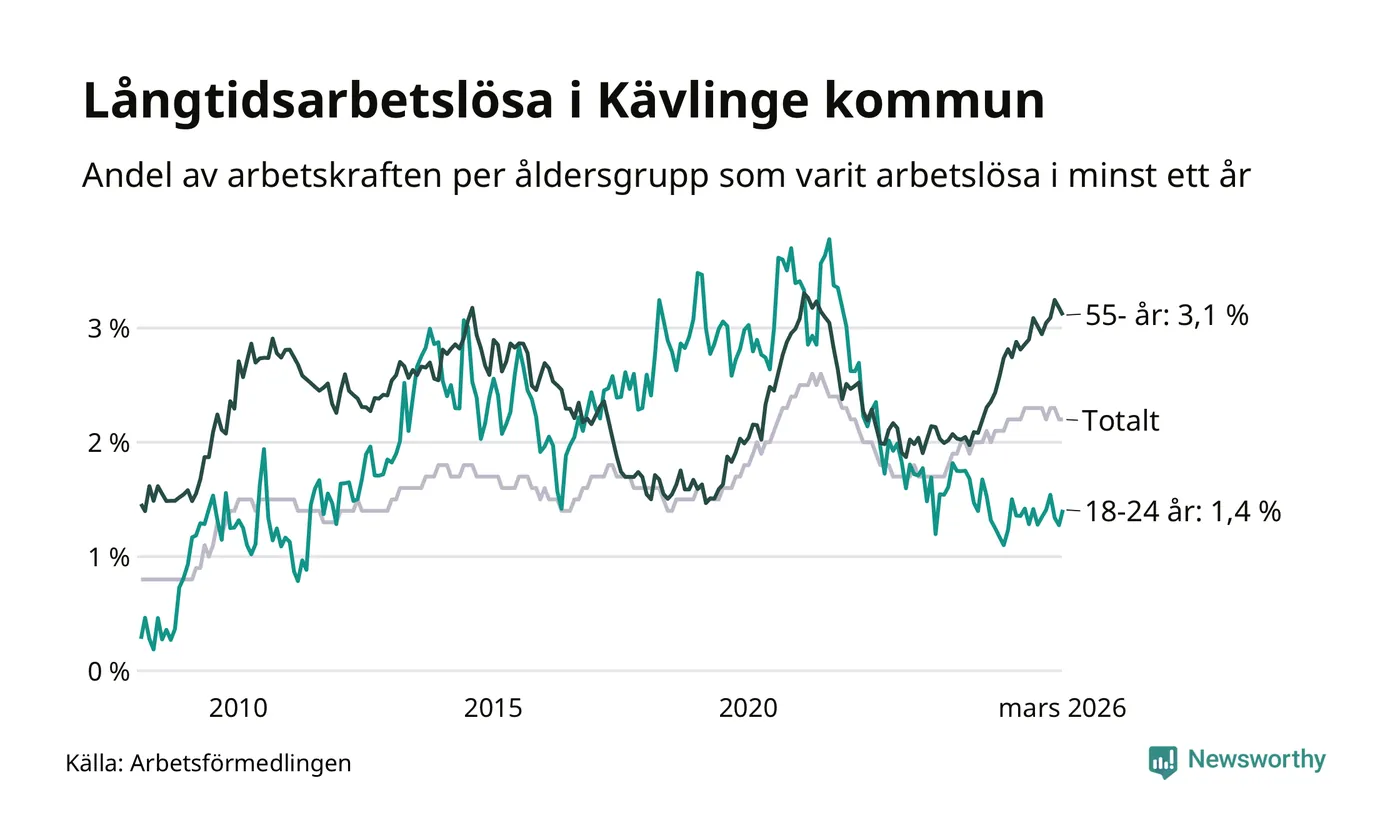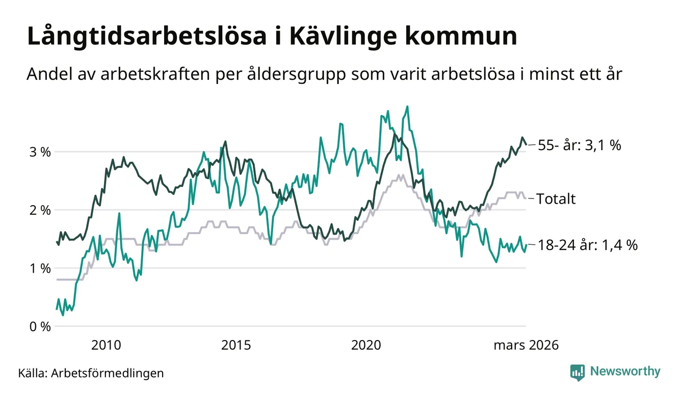 Av de 363 personerna som varit arbetslösa i mer än ett år i Kävlinge kommun är 112 personer mellan 55 och 661 år och 21 är mellan 18 och 24 år. För den äldre gruppen är andelen arbetslösa 3,1 procent medan den i den yngre gruppen är 1,4 procent. Även i riket som helhet är långtidsarbetslösheten högre i gruppen äldre.