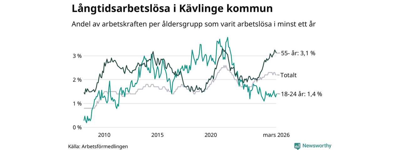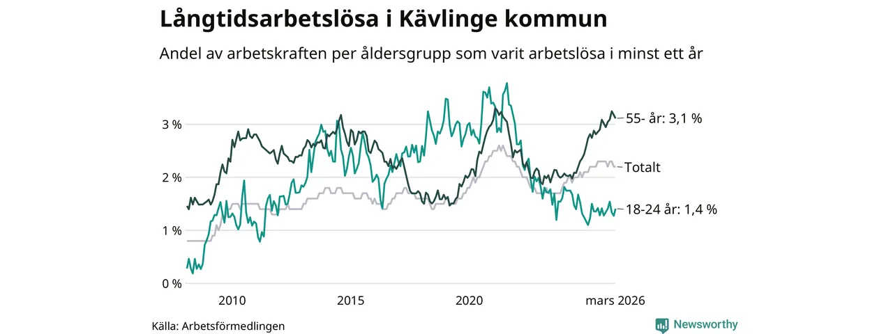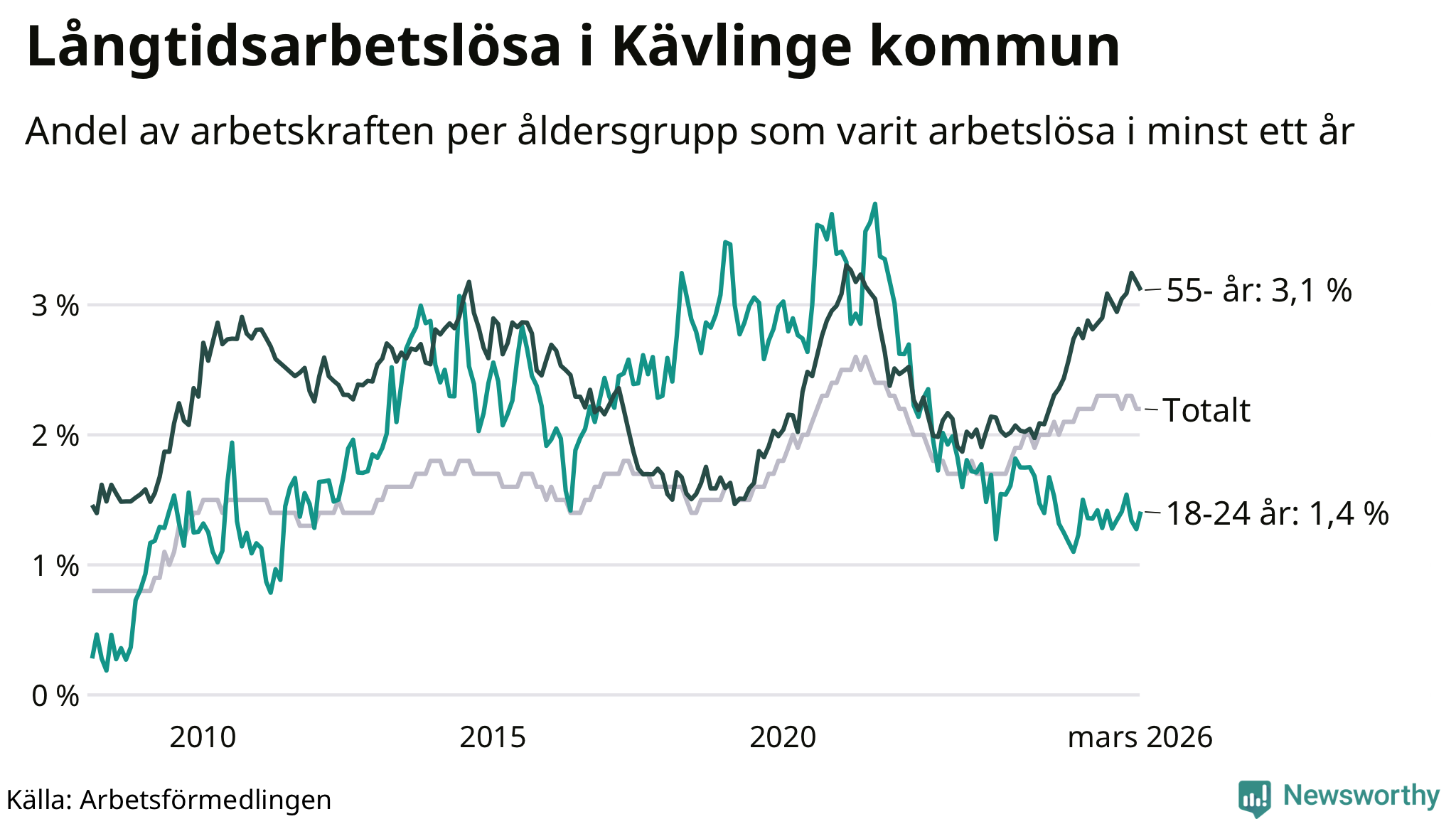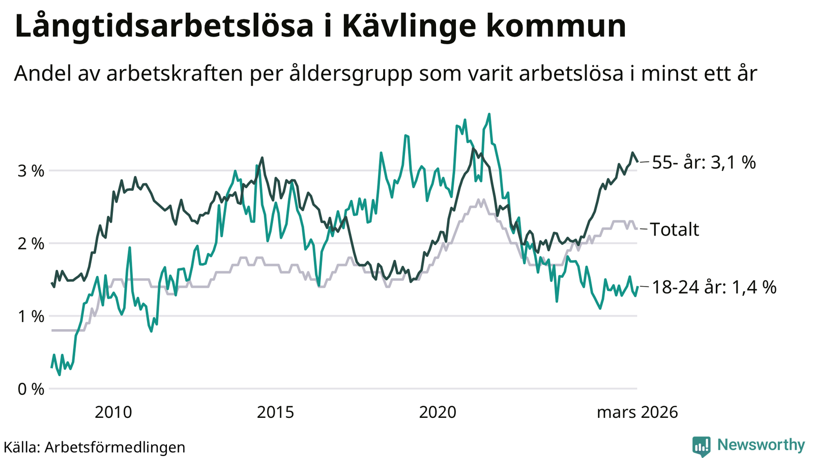 Av de 363 personerna som varit arbetslösa i mer än ett år i Kävlinge kommun är 112 personer mellan 55 och 661 år och 21 är mellan 18 och 24 år. För den äldre gruppen är andelen arbetslösa 3,1 procent medan den i den yngre gruppen är 1,4 procent. Även i riket som helhet är långtidsarbetslösheten högre i gruppen äldre.