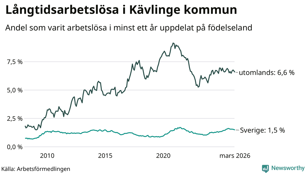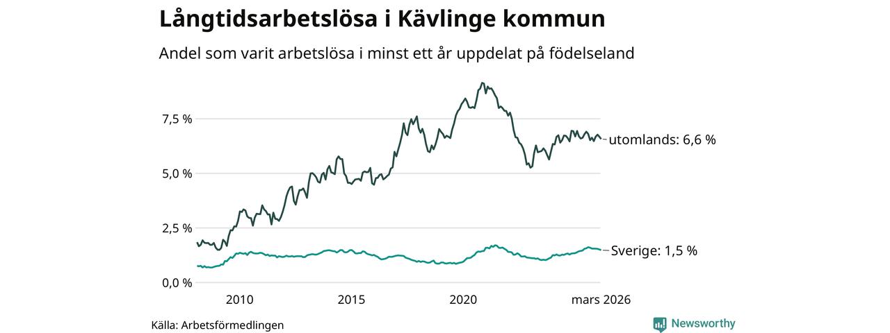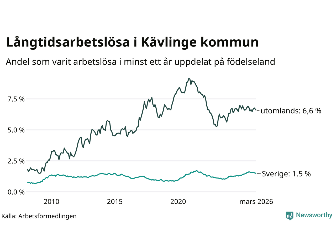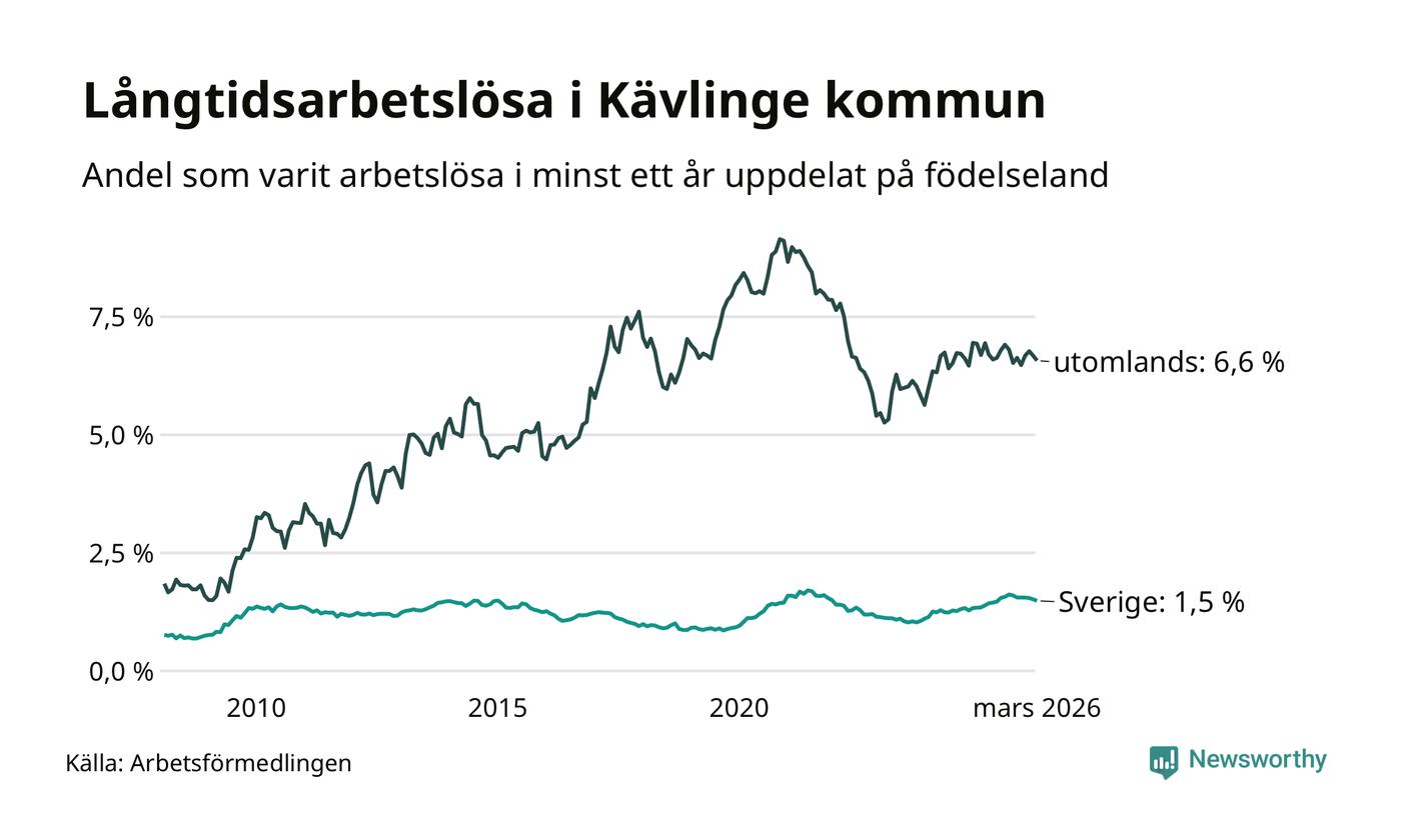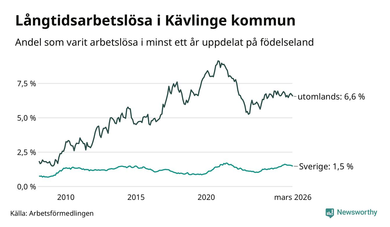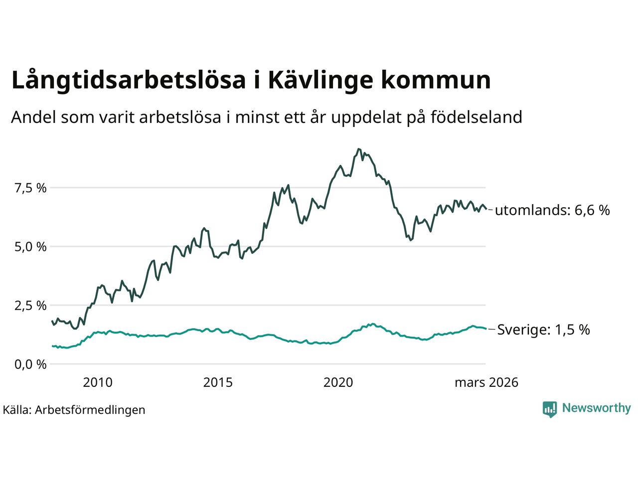 210 av de långtidsarbetslösa i Kävlinge är födda i Sverige, medan 153 är födda utomlands. Det innebär att långtidsarbetslösheten bland Sverigefödda är 1,5 procent, medan den är fyra gånger så hög – 6,6 procent – bland födda utomlands. Även i riket som helhet är arbetslösheten högre bland utrikesfödda.