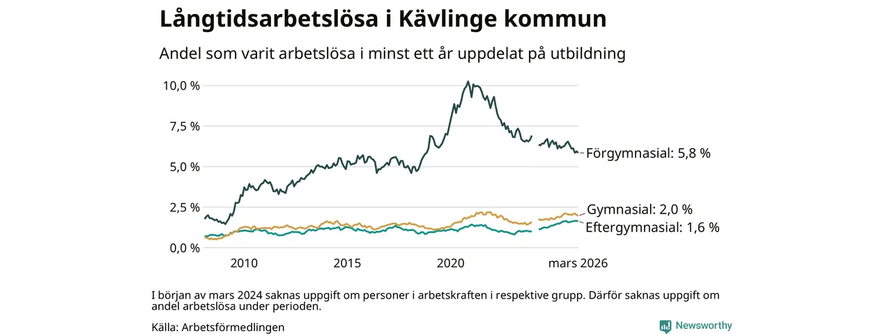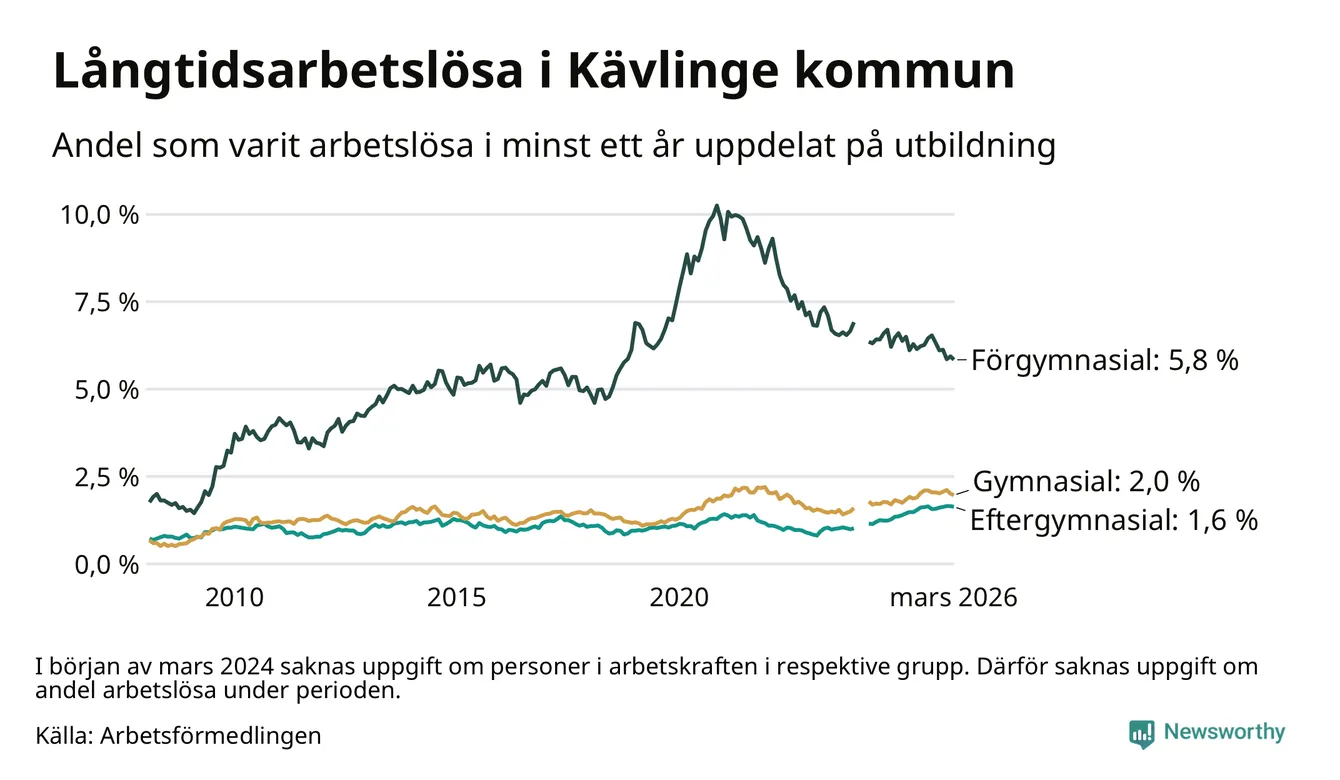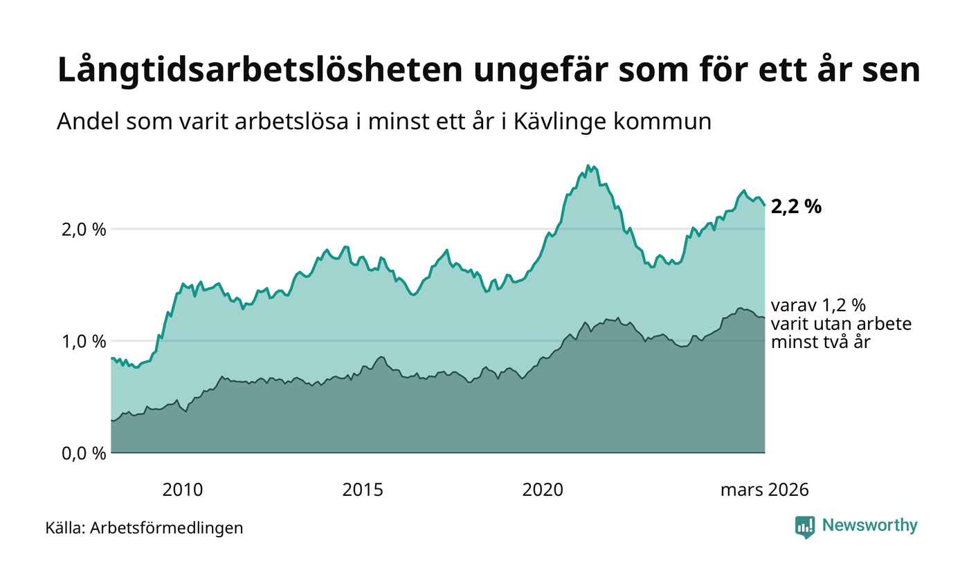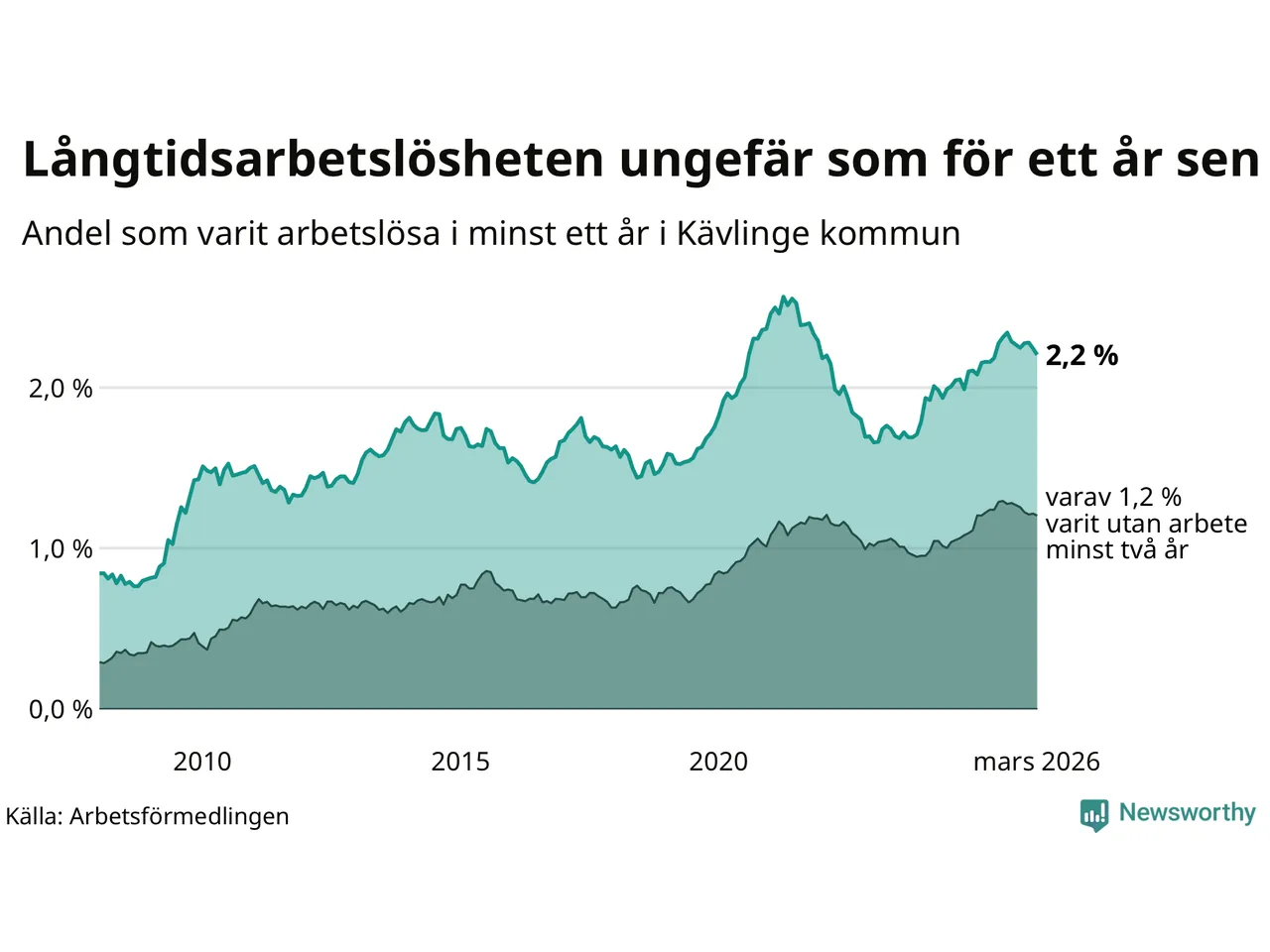 Andelen som varit utan arbete i minst ett år i Kävlinge var ungefär lika stor i mars jämfört med samma månad för ett år sedan. Det visar Arbetsfömedlingens senaste månadsstatistik.