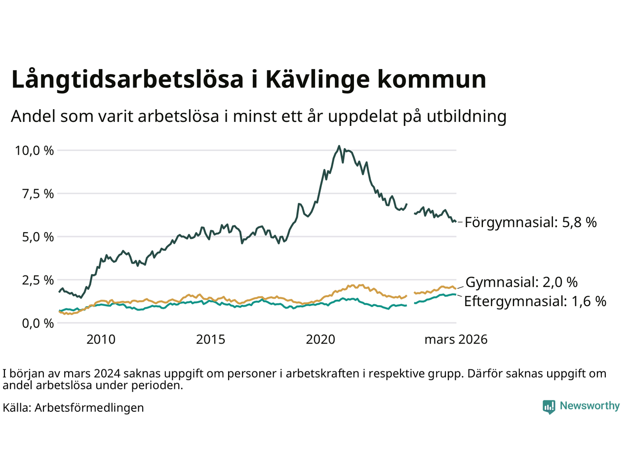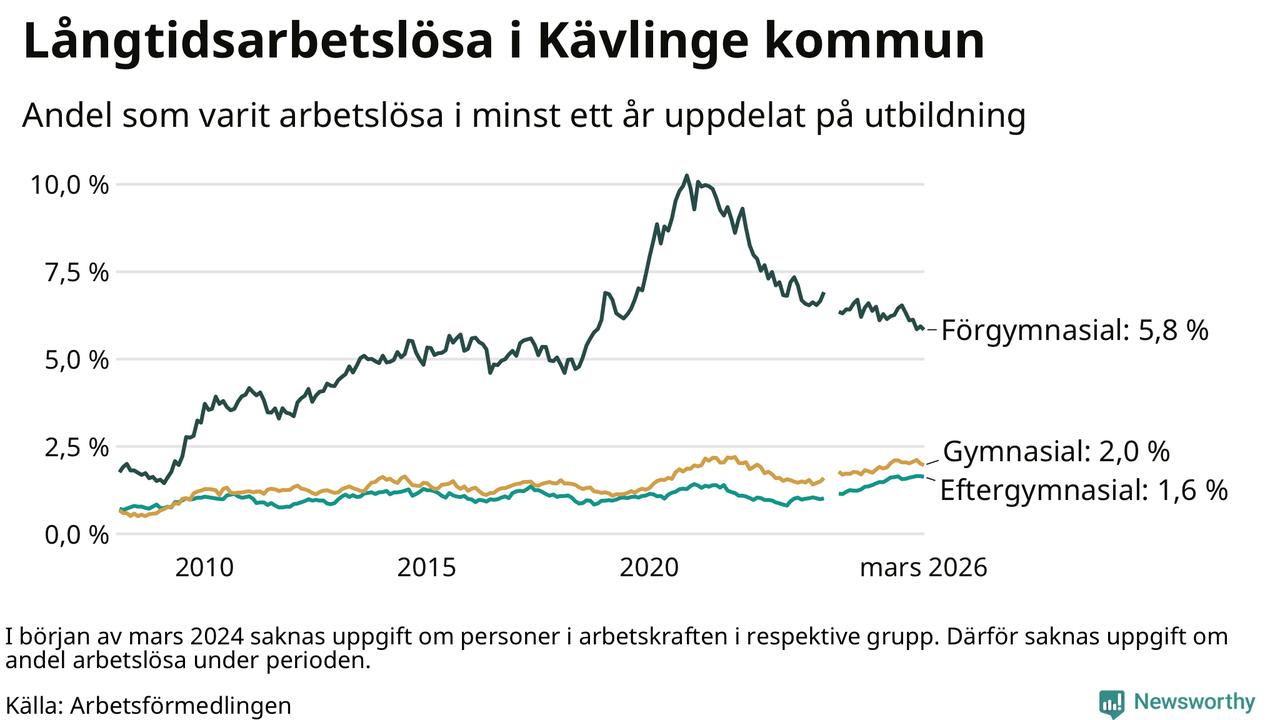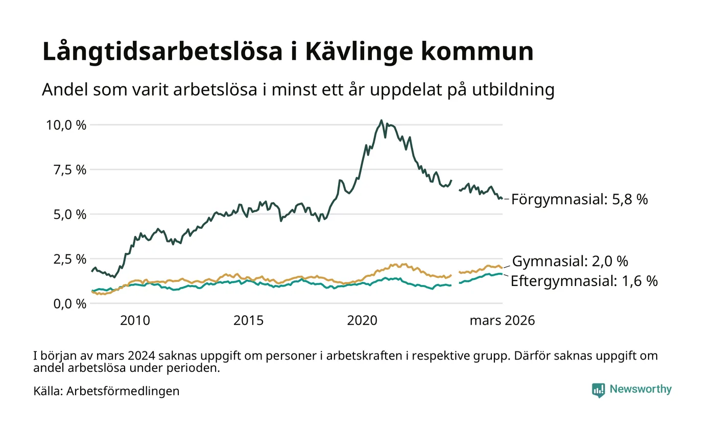 I mars hade 363 Kävlingebor varit arbetslösa i minst ett år, vilket är sex färre än månaden innan. 363 personer motsvarar 2,2 procent av arbetskraften i kommunen – andelen långtidsarbetslösa är ungefär på samma nivå som för ett år sedan.