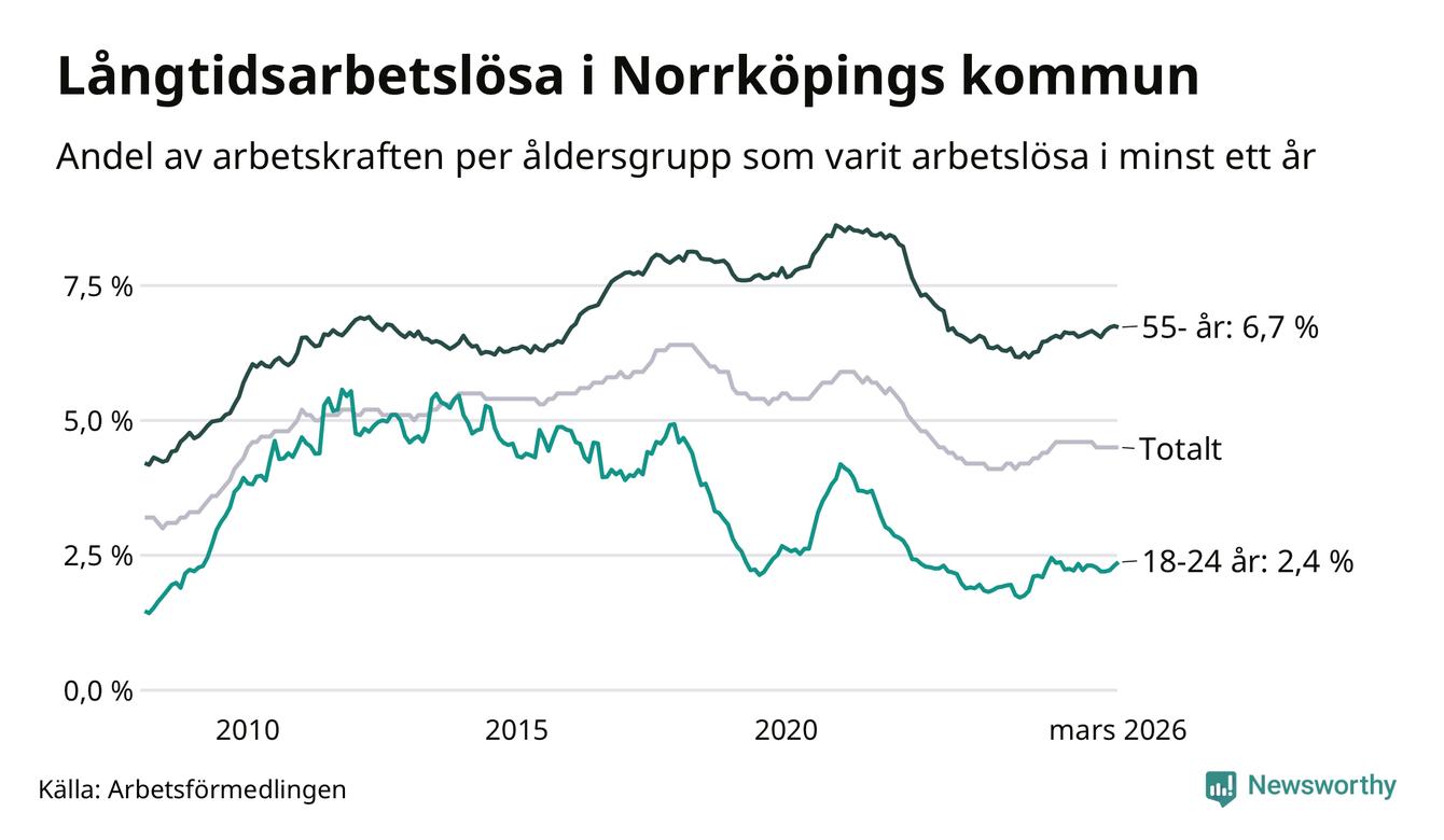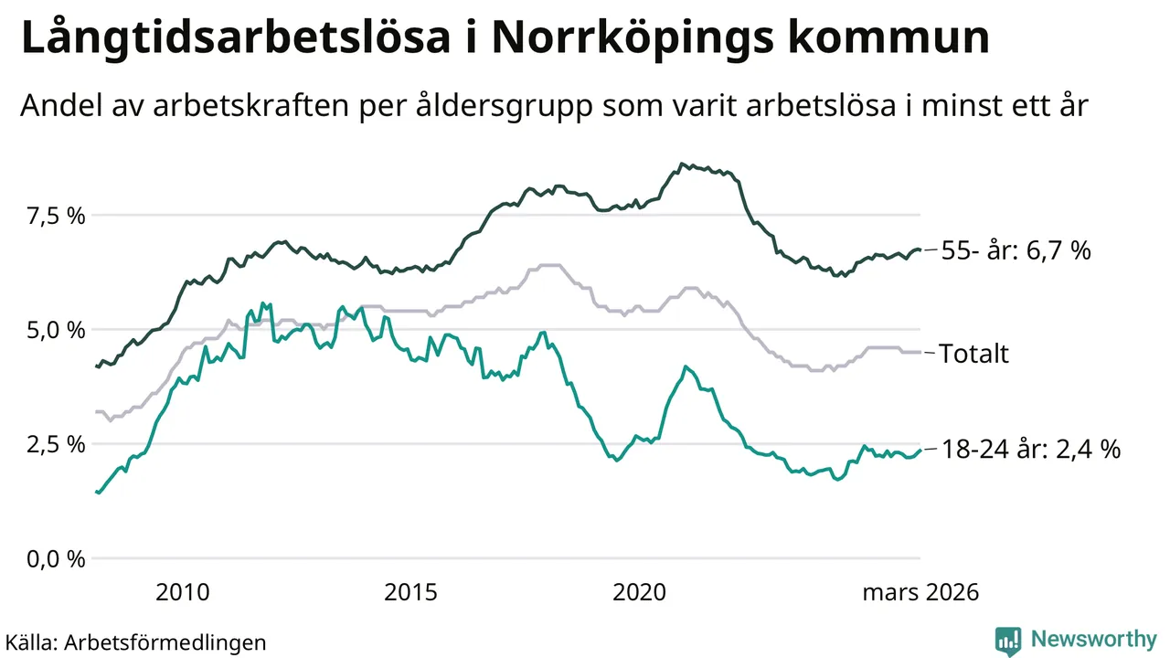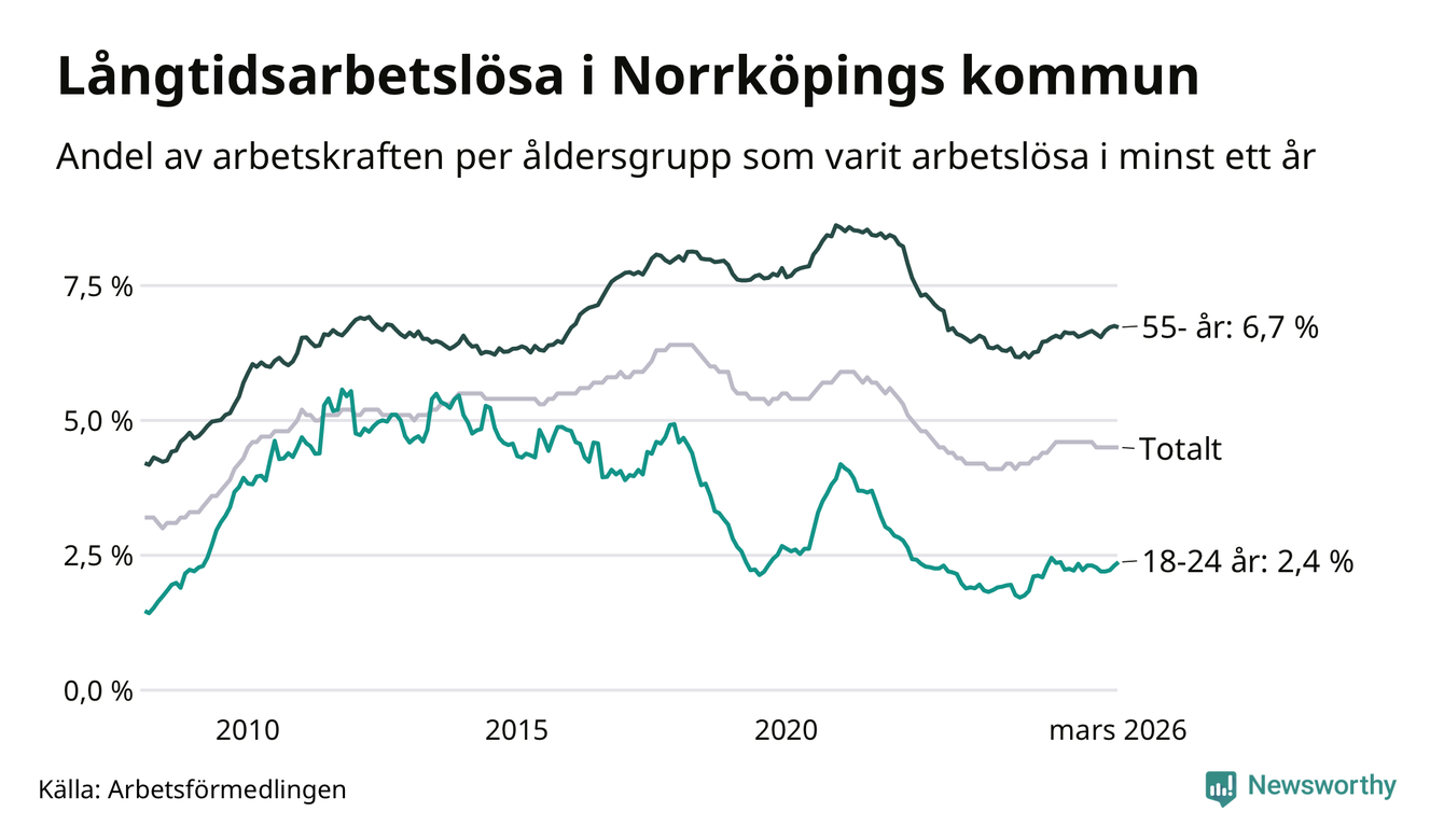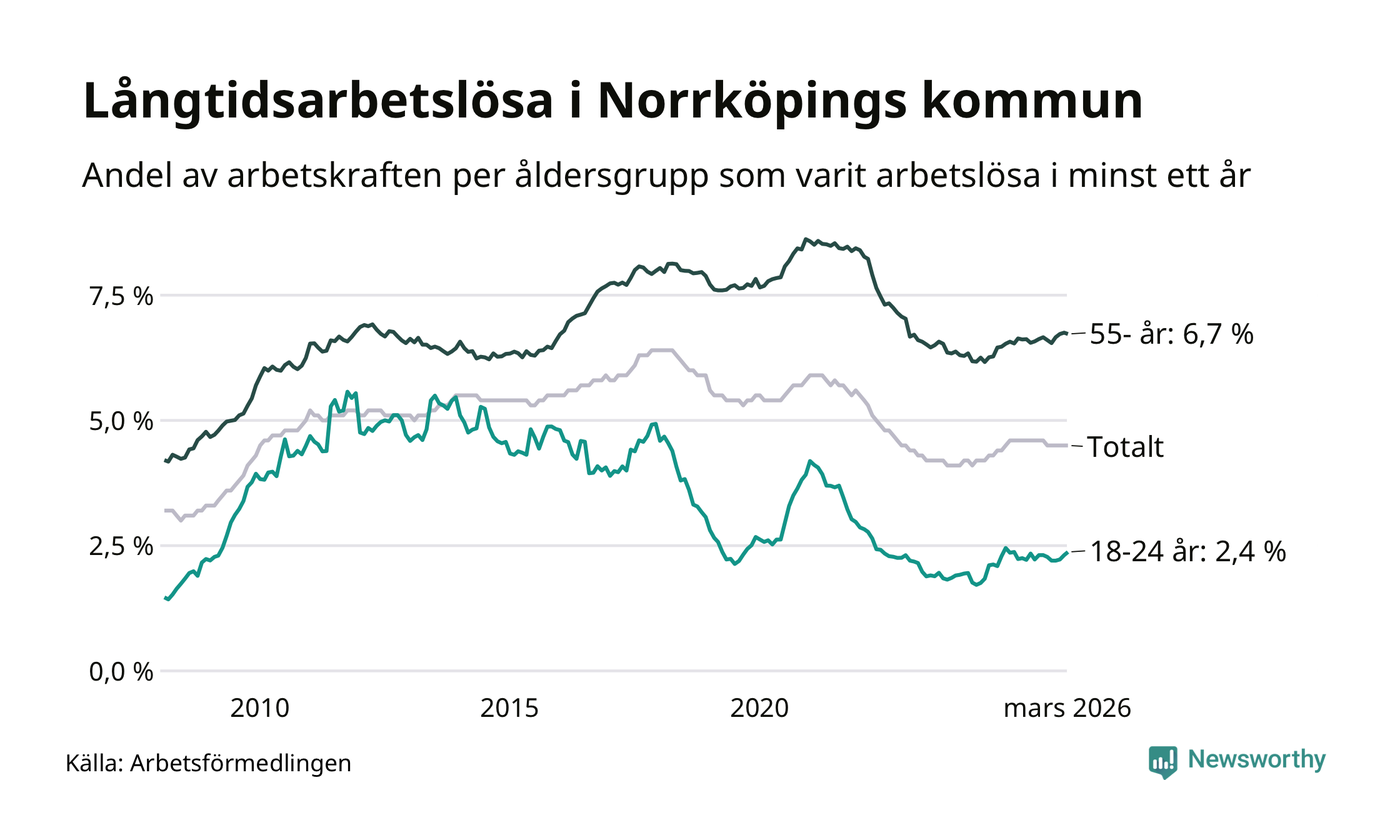 Av de 3 342 personerna som varit arbetslösa i mer än ett år i Norrköpings kommun är 1 024 personer mellan 55 och 661 år och 193 är mellan 18 och 24 år. För den äldre gruppen är andelen arbetslösa 6,7 procent medan den i den yngre gruppen är 2,4 procent. Även i riket som helhet är långtidsarbetslösheten högre i gruppen äldre.