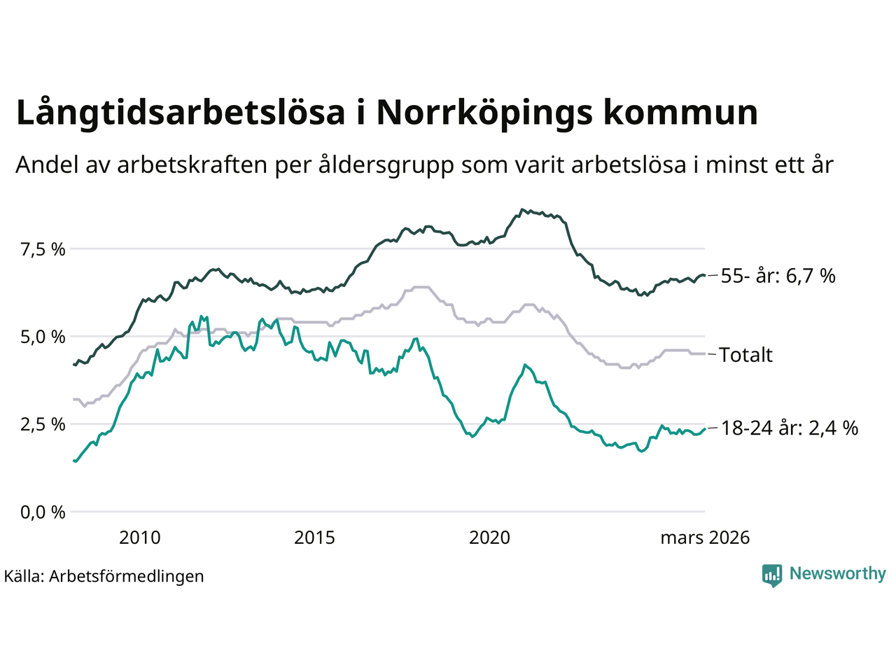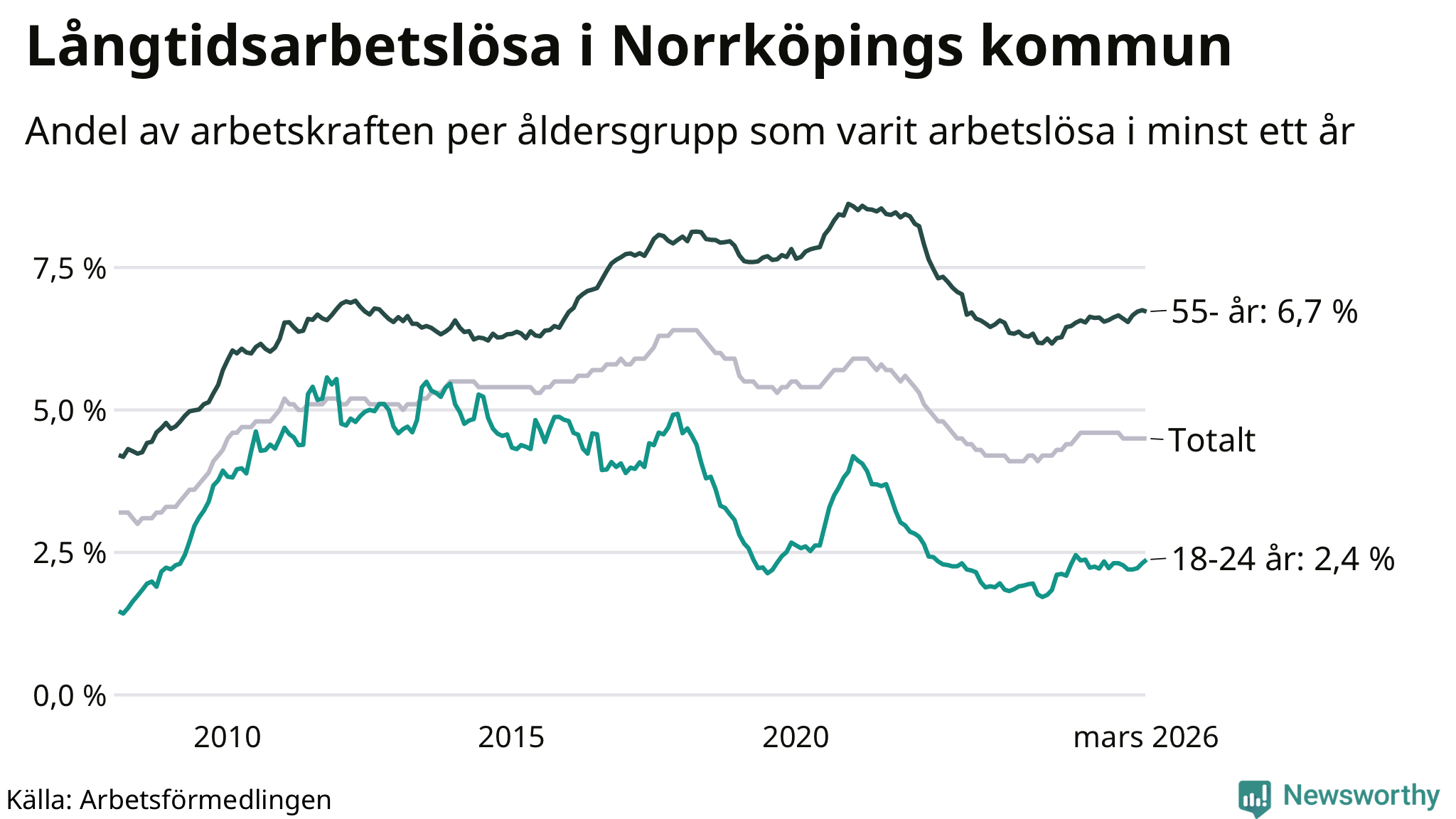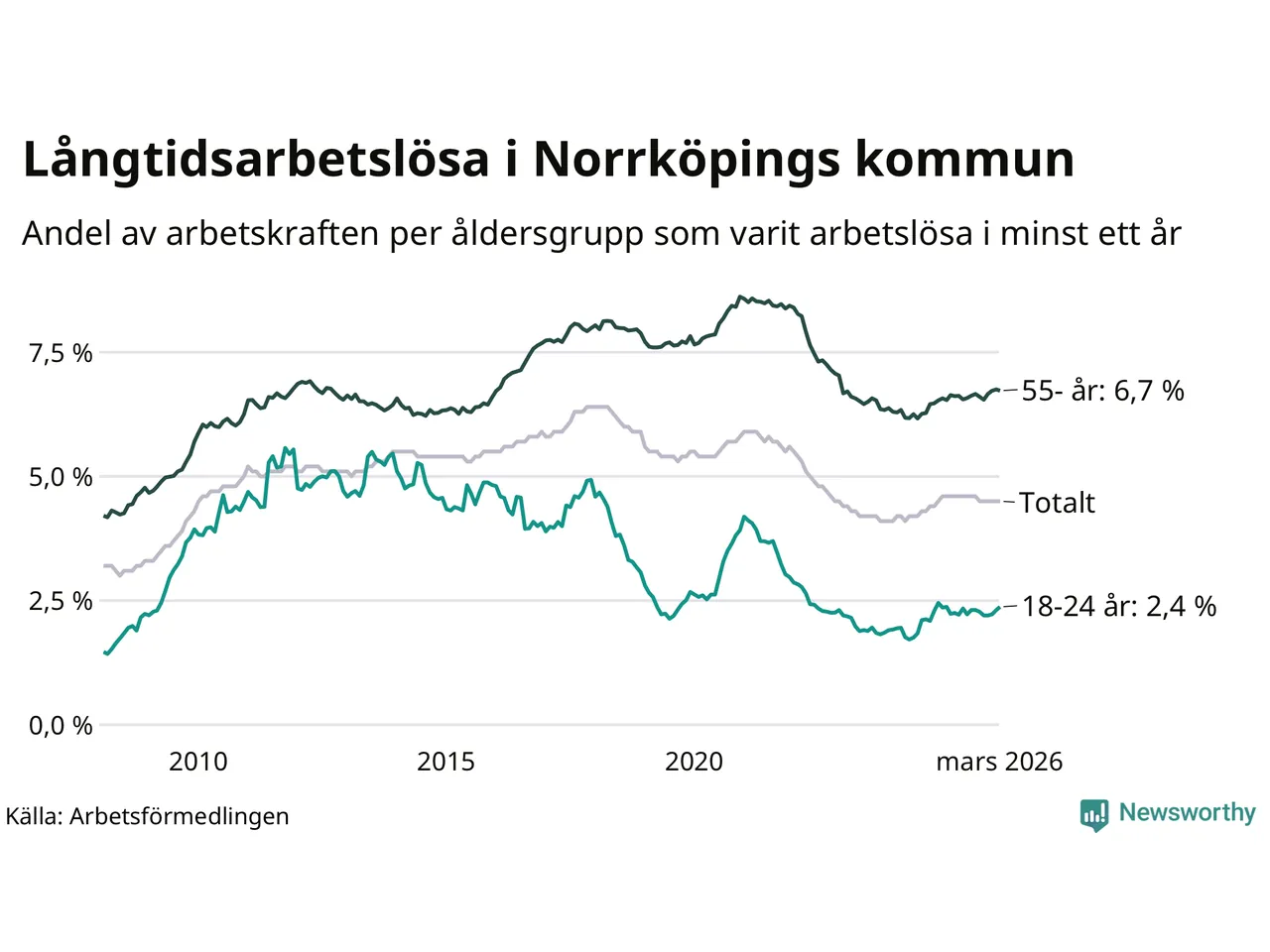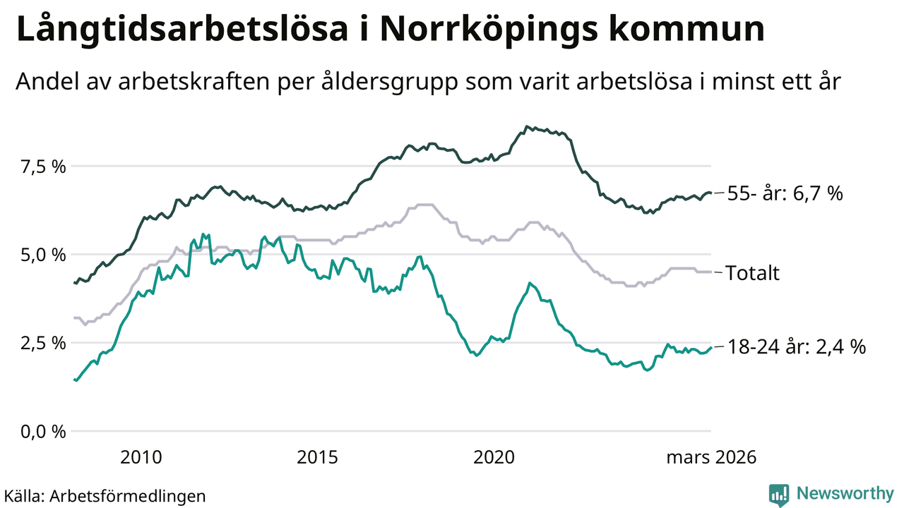 Av de 3 342 personerna som varit arbetslösa i mer än ett år i Norrköpings kommun är 1 024 personer mellan 55 och 661 år och 193 är mellan 18 och 24 år. För den äldre gruppen är andelen arbetslösa 6,7 procent medan den i den yngre gruppen är 2,4 procent. Även i riket som helhet är långtidsarbetslösheten högre i gruppen äldre.