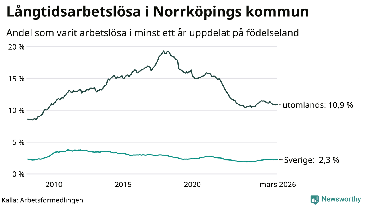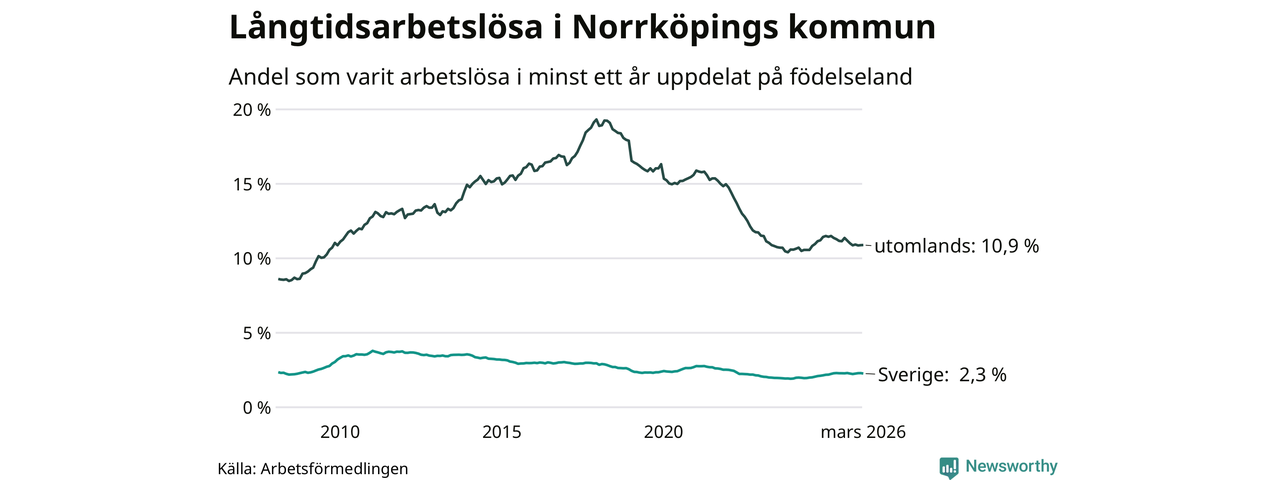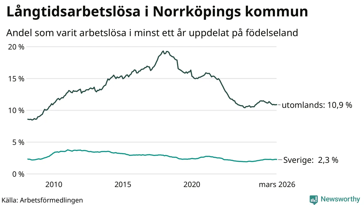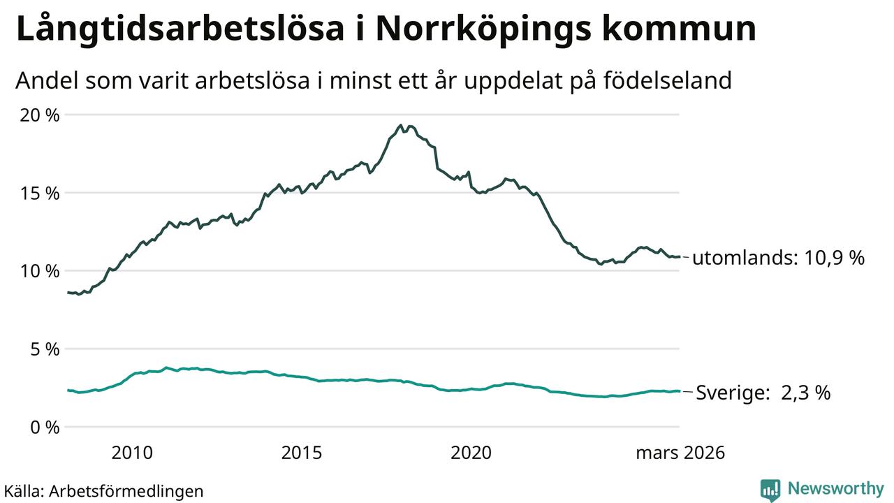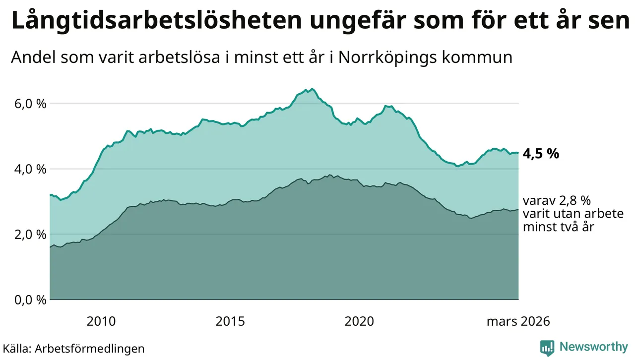 I mars hade 3 342 Norrköpingsbor varit arbetslösa i minst ett år, vilket är 13 färre än månaden innan. 3 342 personer motsvarar 4,5 procent av arbetskraften i kommunen – andelen långtidsarbetslösa är ungefär på samma nivå som för ett år sedan. Norrköping tillhör de kommuner som har högst andel långtidsarbetslösa i hela landet just nu.