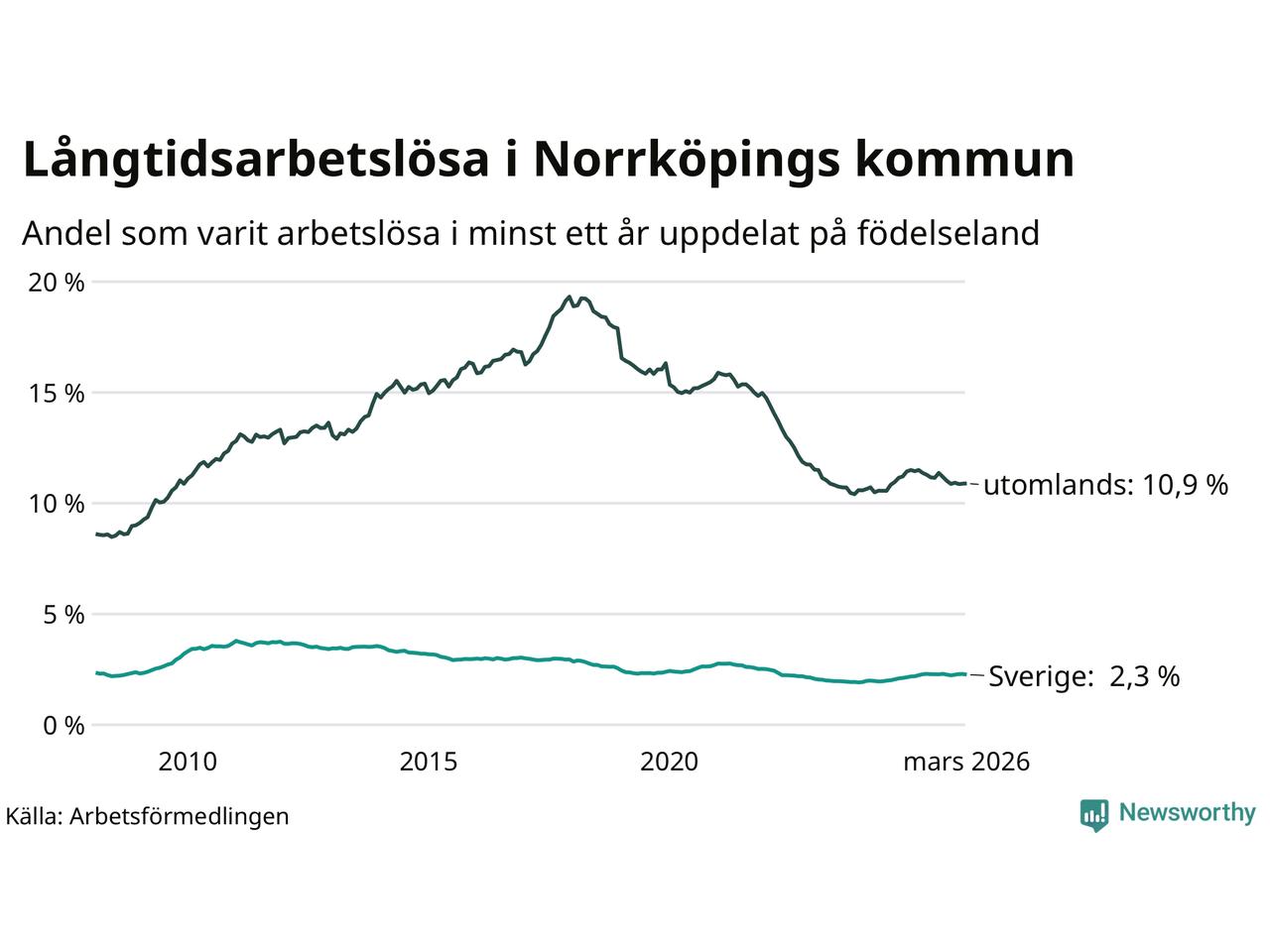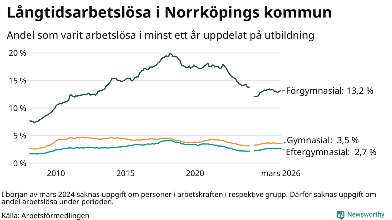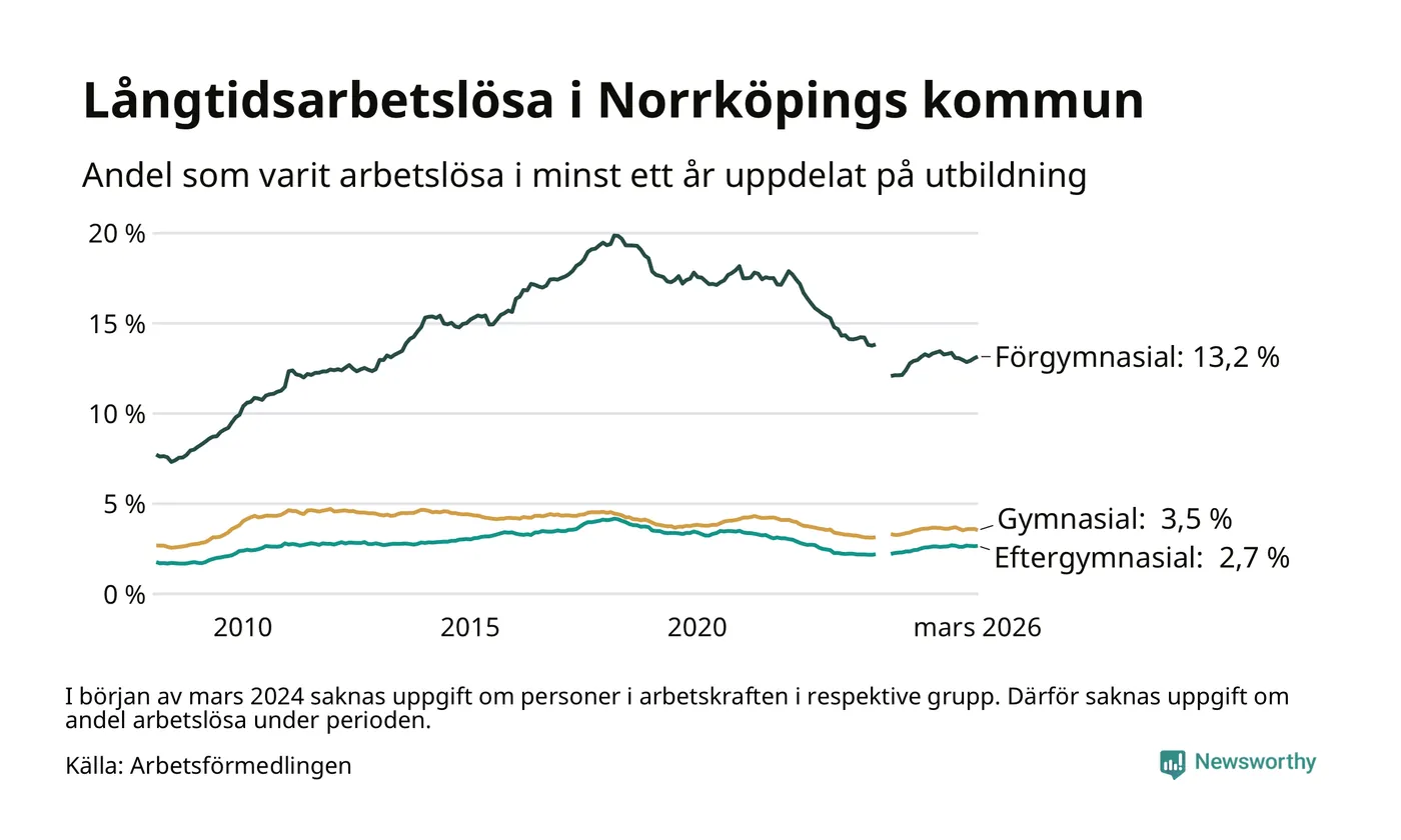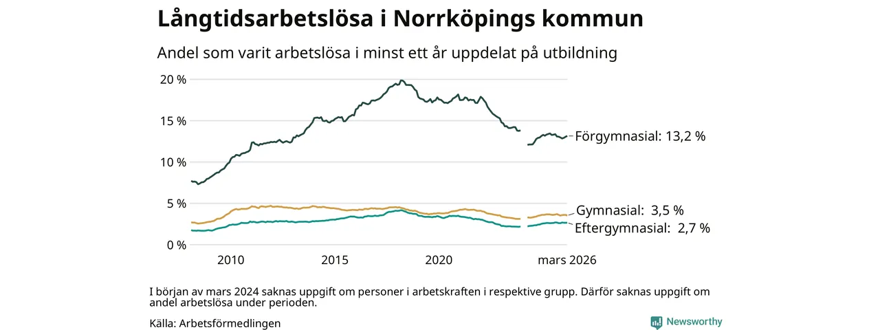I mars hade 3 342 Norrköpingsbor varit arbetslösa i minst ett år, vilket är 13 färre än månaden innan. 3 342 personer motsvarar 4,5 procent av arbetskraften i kommunen – andelen långtidsarbetslösa är ungefär på samma nivå som för ett år sedan. Norrköping tillhör de kommuner som har högst andel långtidsarbetslösa i hela landet just nu.