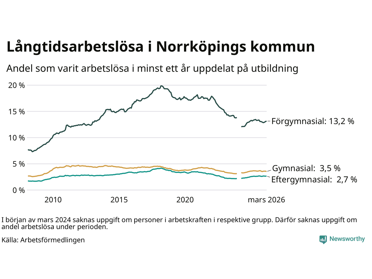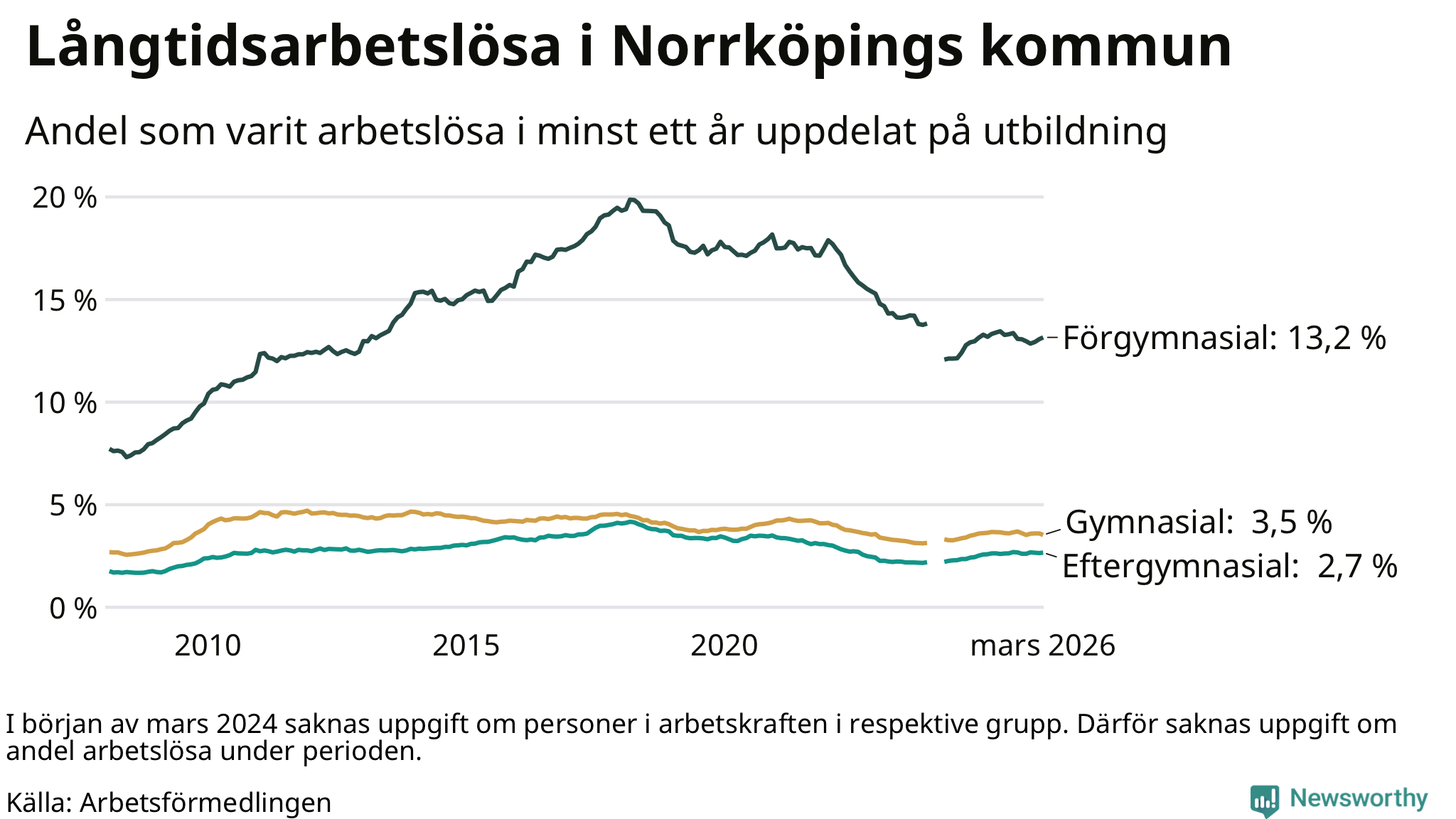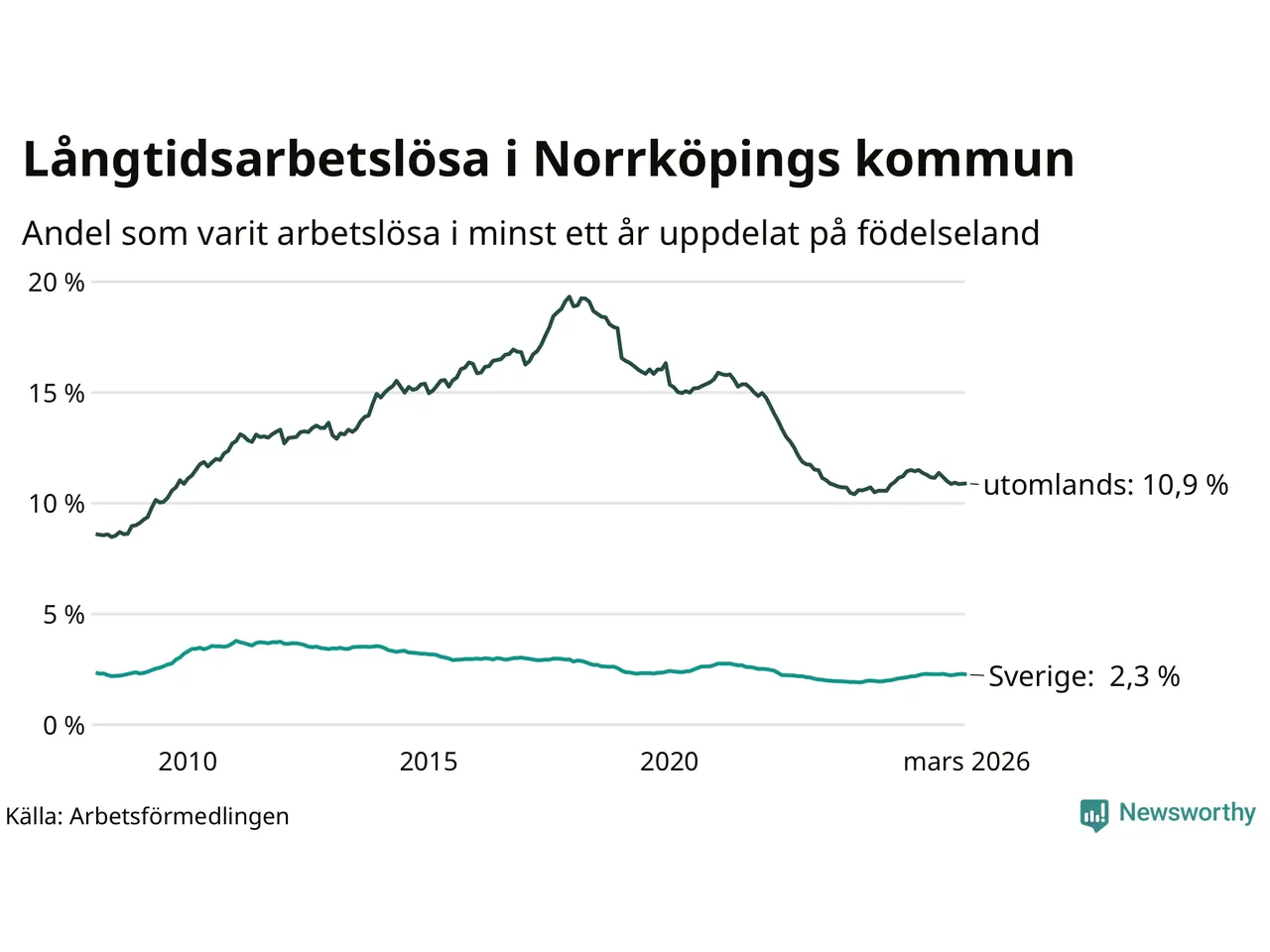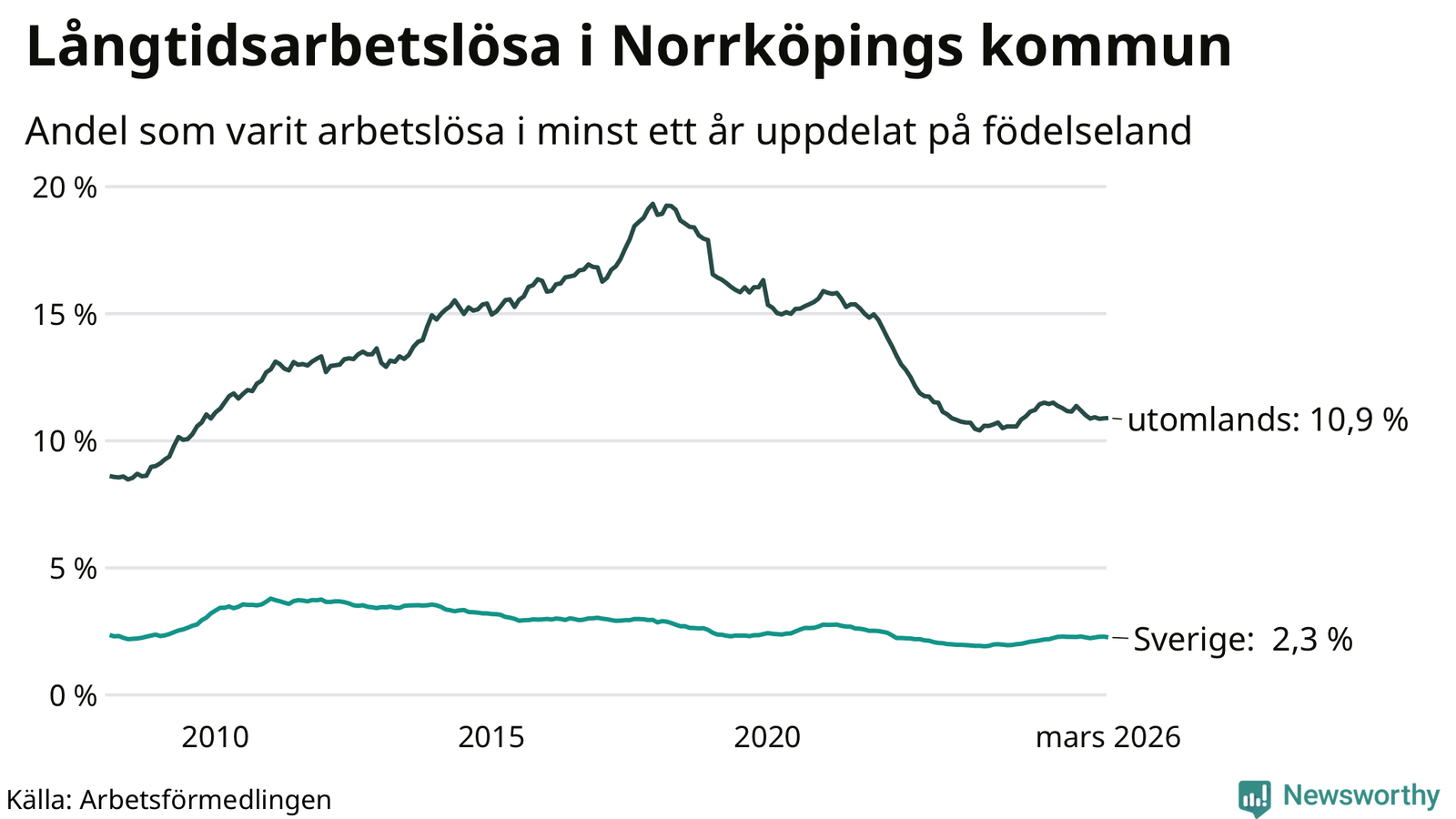 I mars hade 3 342 Norrköpingsbor varit arbetslösa i minst ett år, vilket är 13 färre än månaden innan. 3 342 personer motsvarar 4,5 procent av arbetskraften i kommunen – andelen långtidsarbetslösa är ungefär på samma nivå som för ett år sedan. Norrköping tillhör de kommuner som har högst andel långtidsarbetslösa i hela landet just nu.