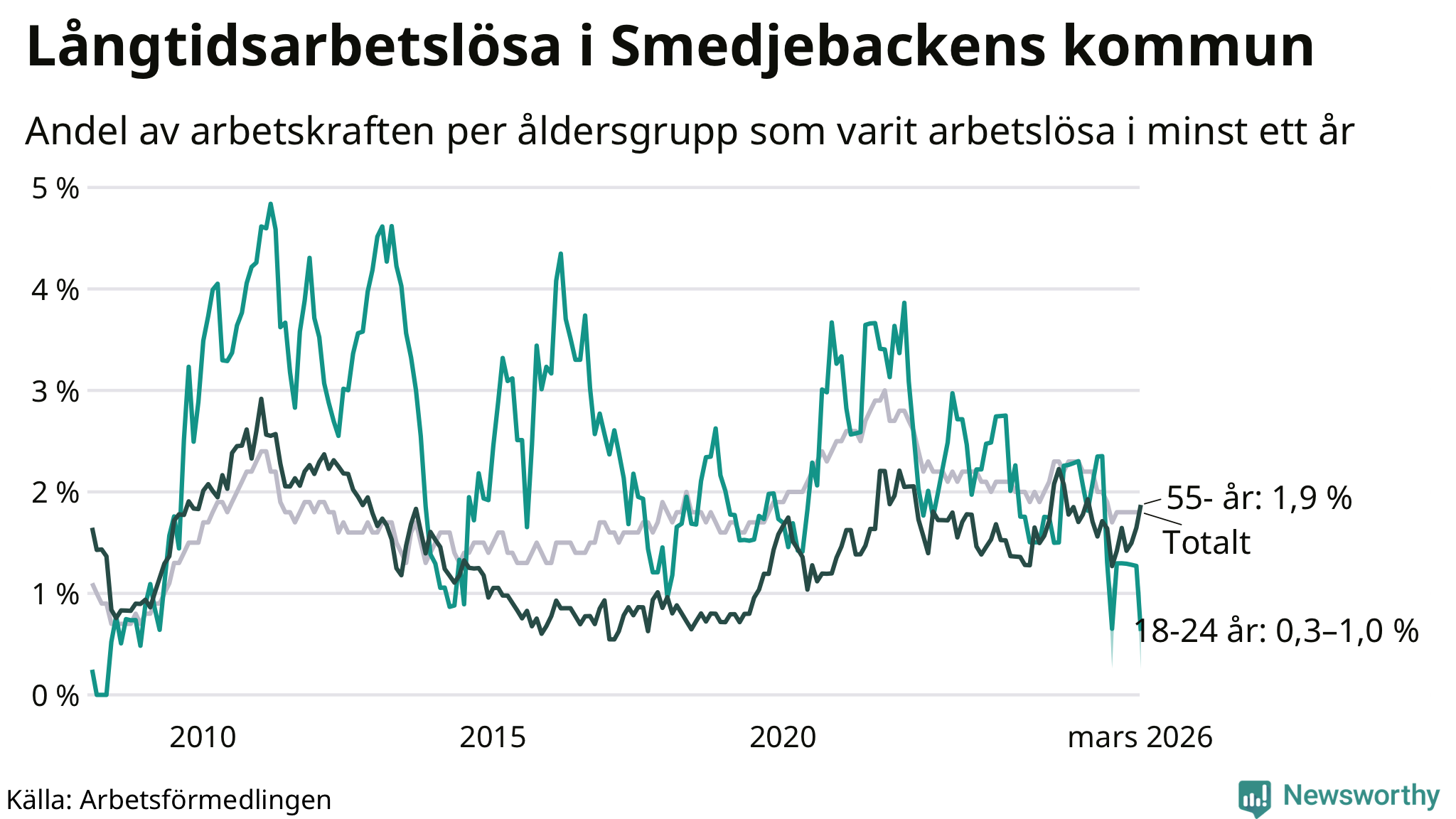 | Andel arbetslösa i minst ett år | 1,8 % | 2,0 % | 2,9 % |