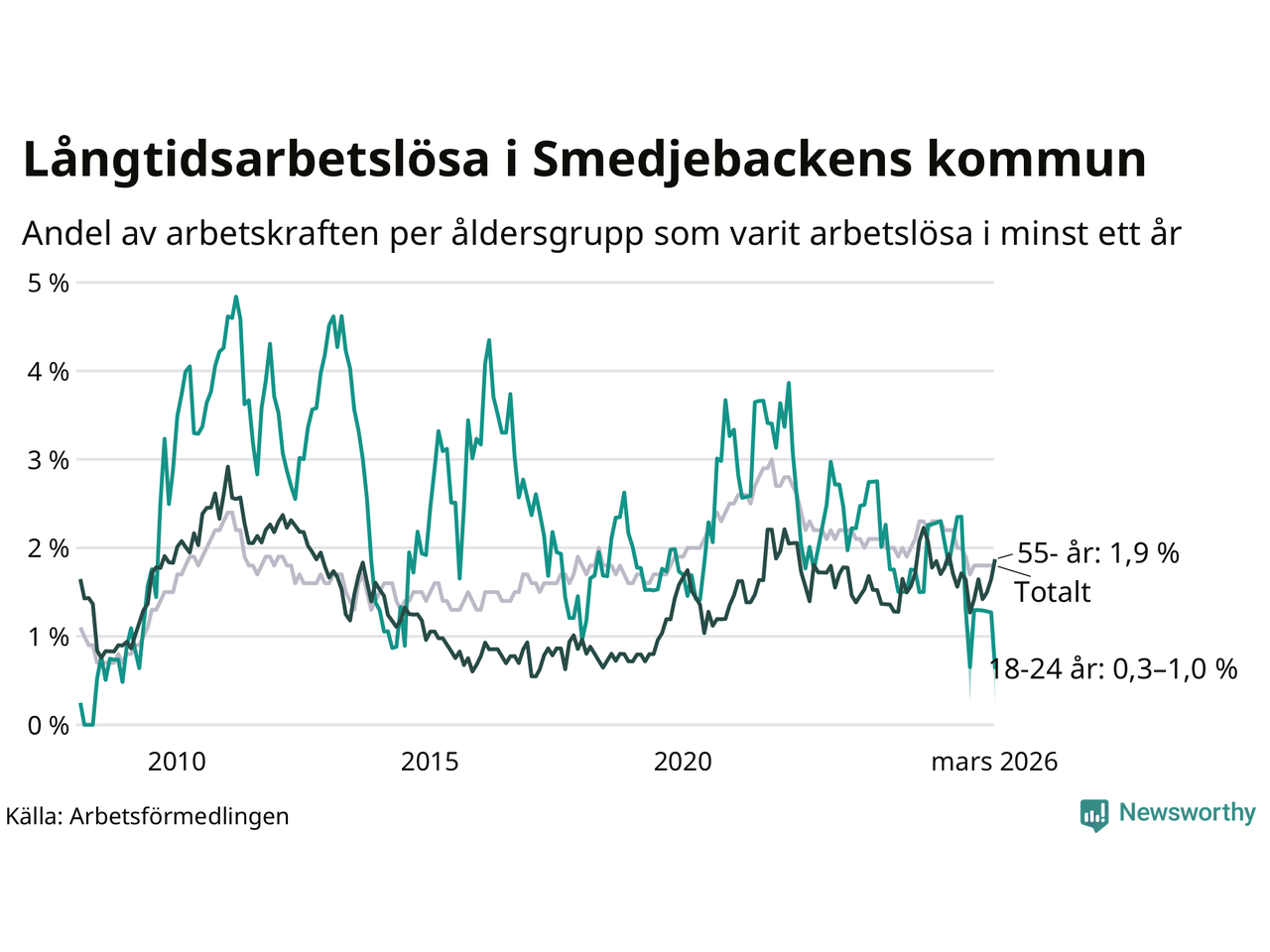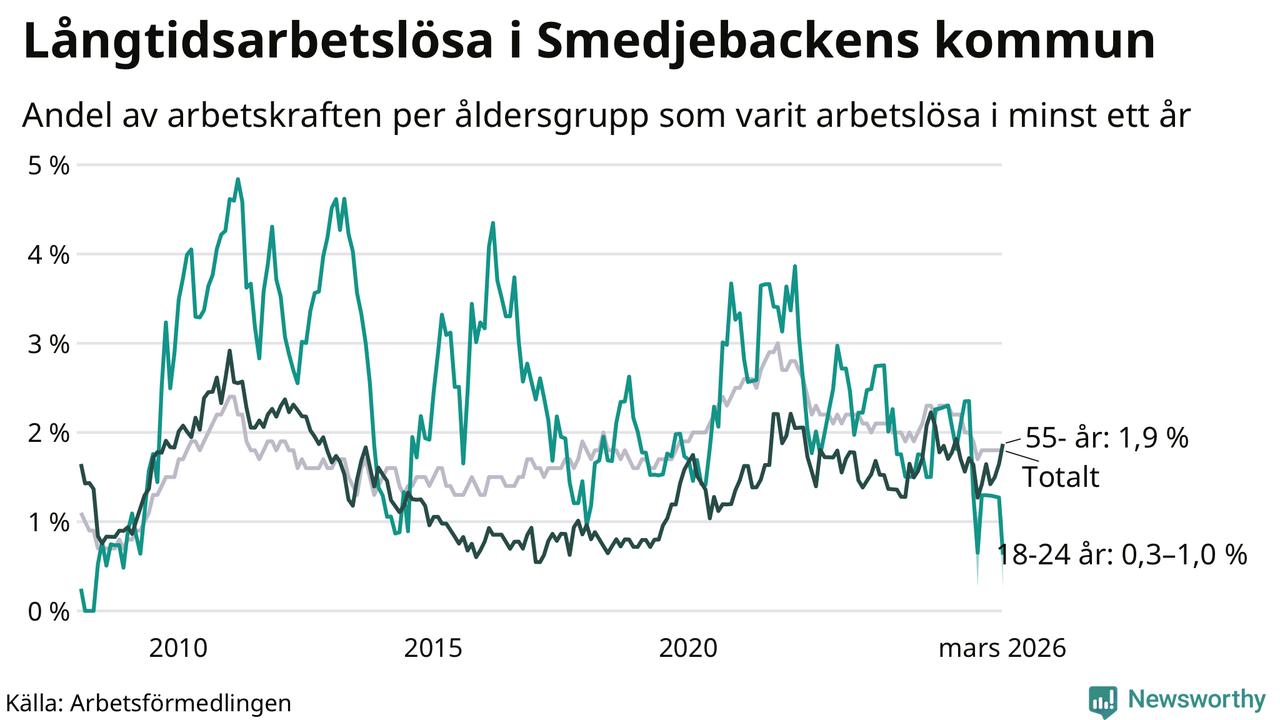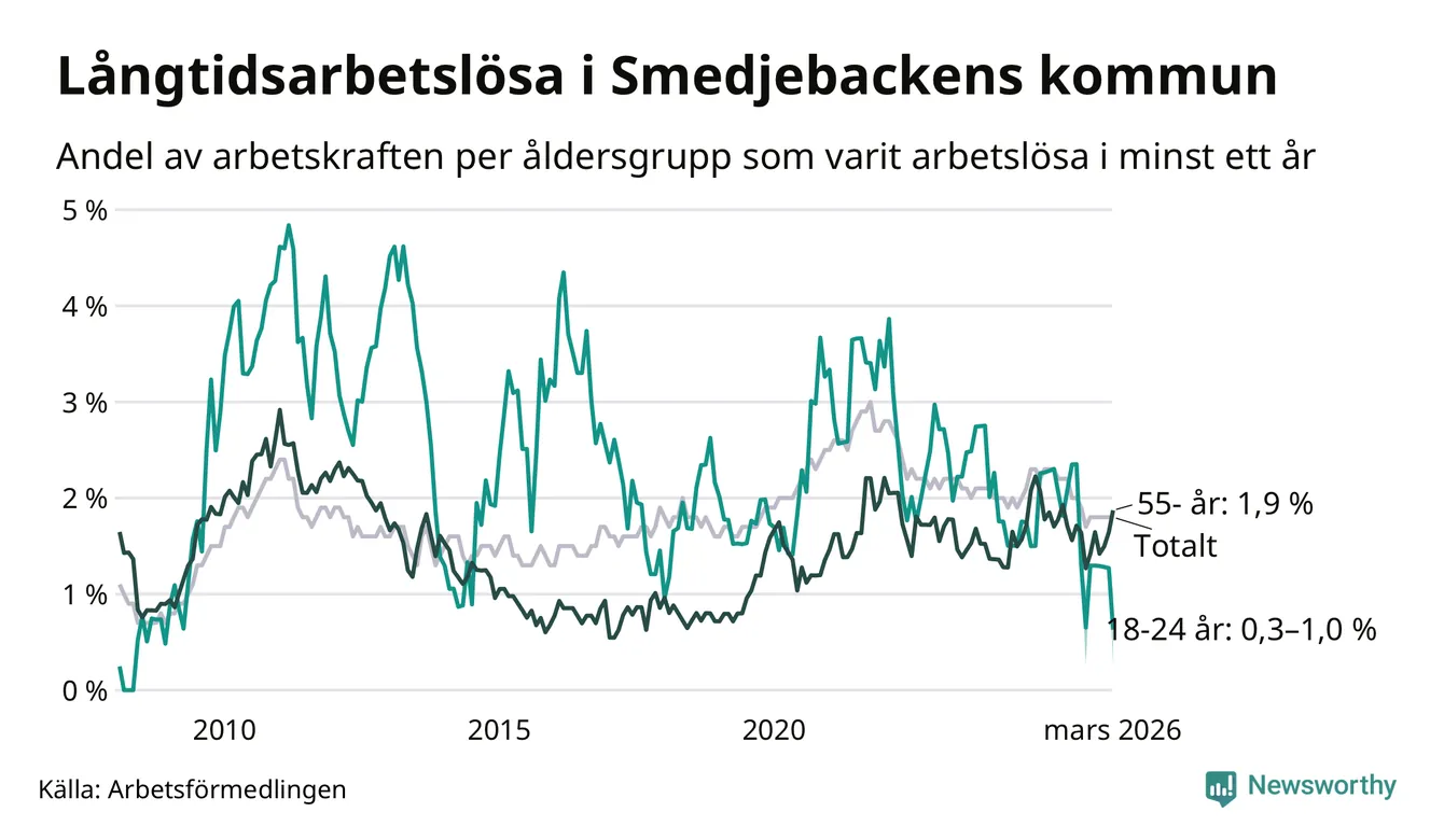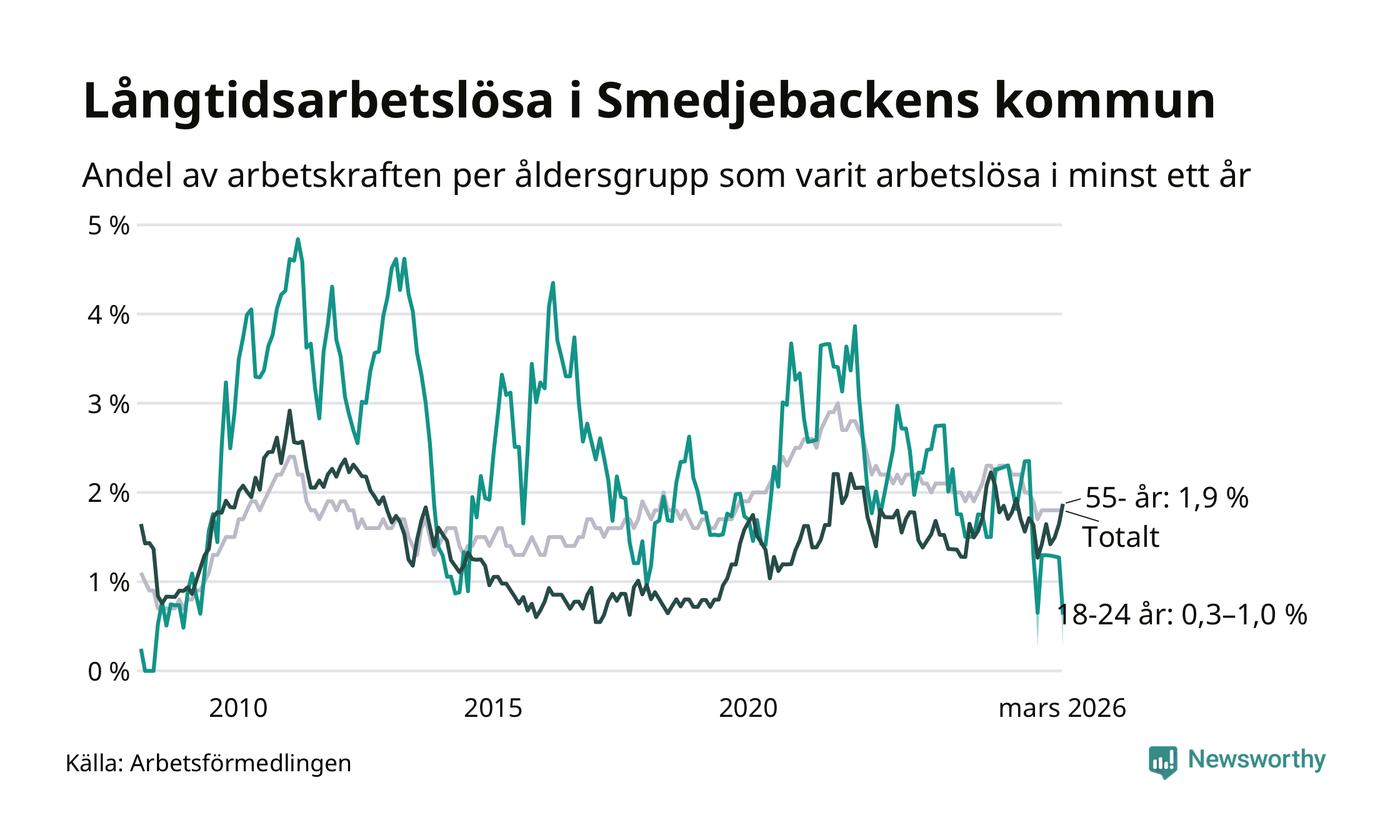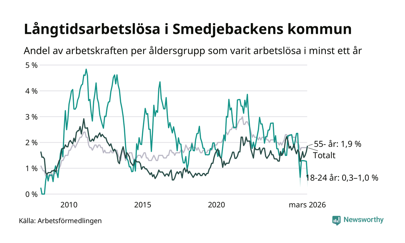Av de 90 personerna som varit arbetslösa i mer än ett år i Smedjebackens kommun är 25 personer mellan 55 och 661 år och mellan en och fyra är mellan 18 och 24 år. För den äldre gruppen är andelen arbetslösa 1,9 procent medan den i den yngre gruppen är mellan 0,3 och 1,0 procent. Även i riket som helhet är långtidsarbetslösheten högre i gruppen äldre.