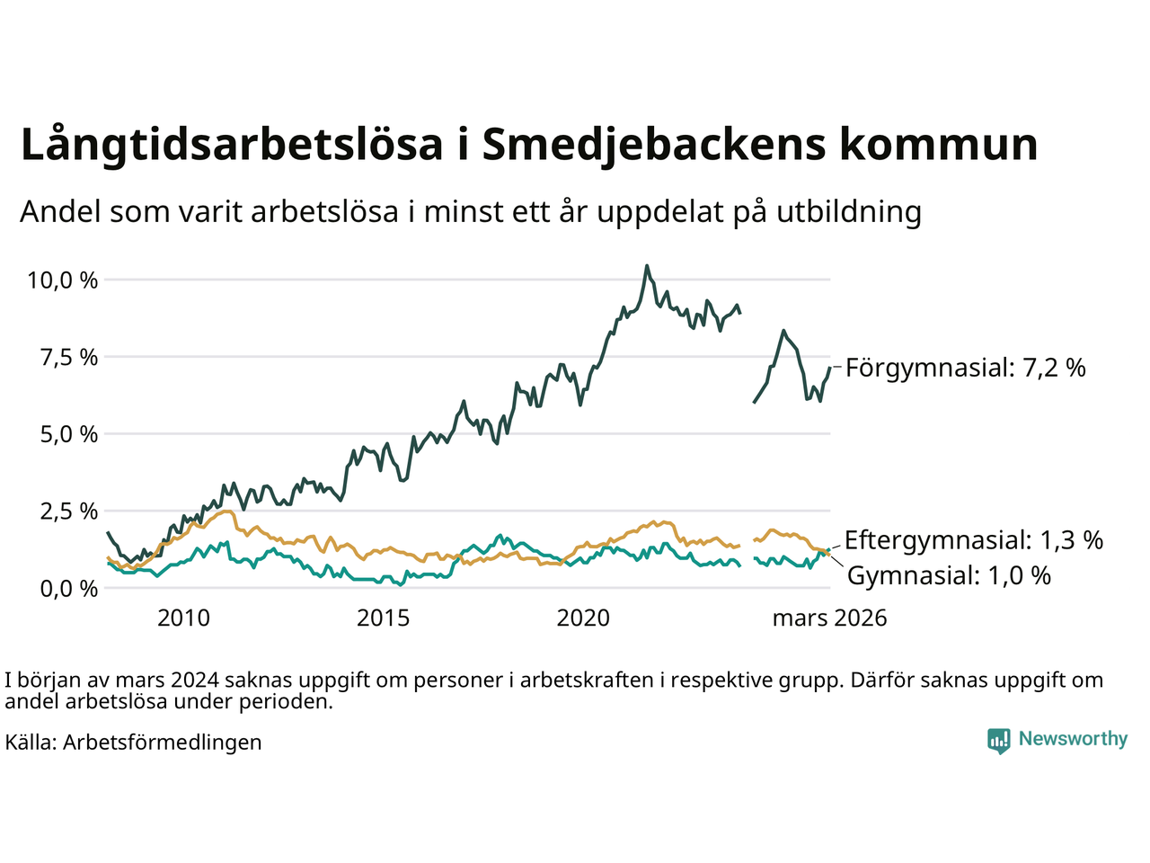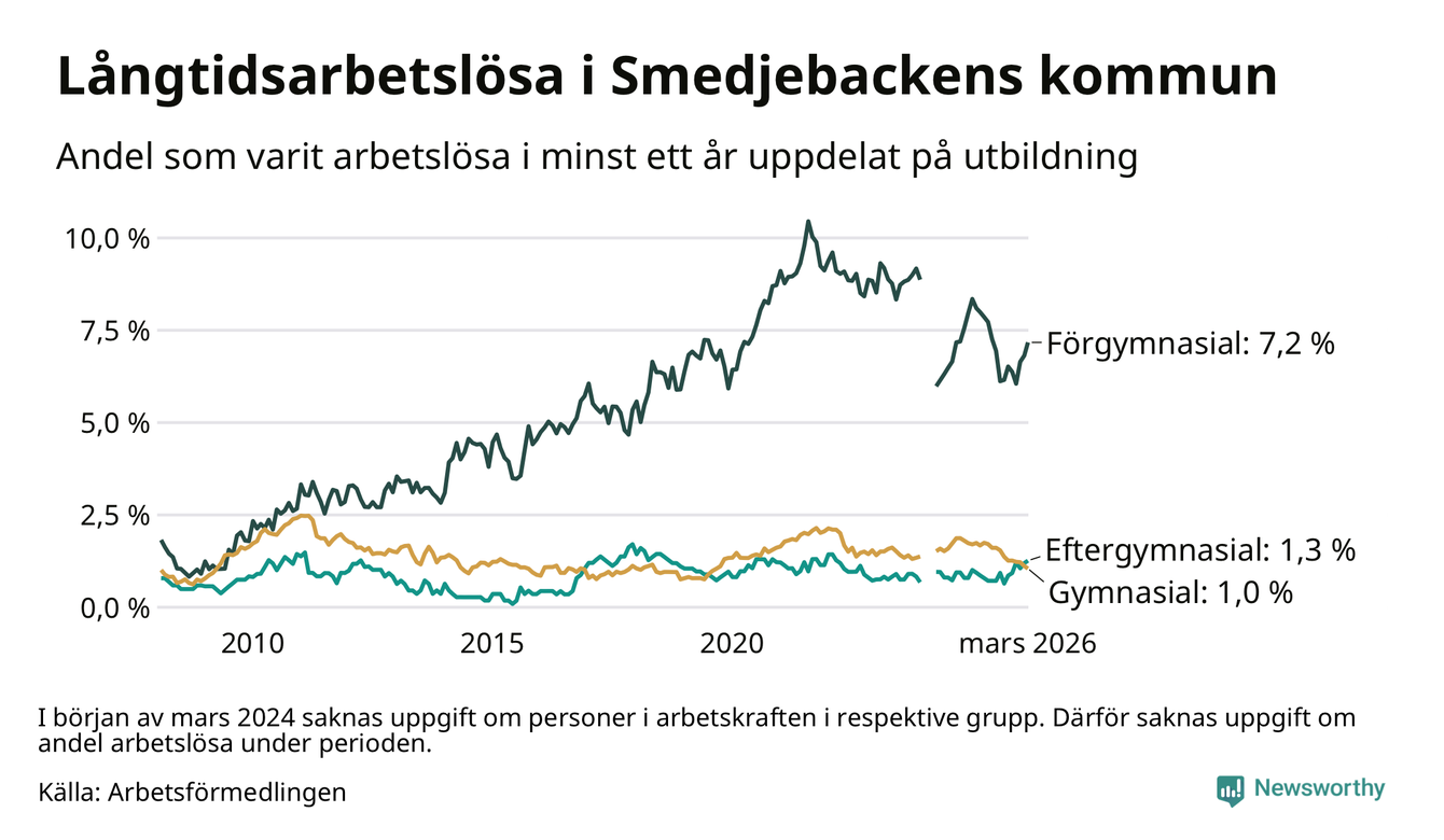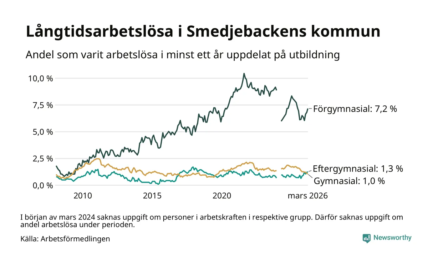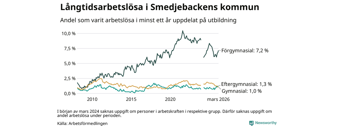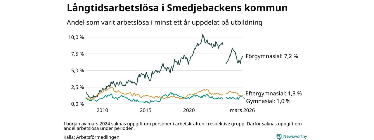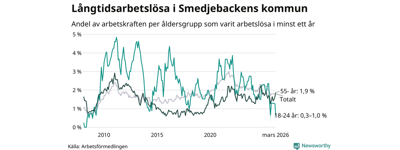 I mars hade 90 Smedjebackensbor varit arbetslösa i minst ett år, vilket är en fler än månaden innan. Det är den sjätte månaden i rad med ökande antal långtidsarbetslösa. 90 personer motsvarar 1,8 procent av arbetskraften i kommunen – andelen långtidsarbetslösa är 0,4 procentenheter lägre än samma månad för ett år sedan.