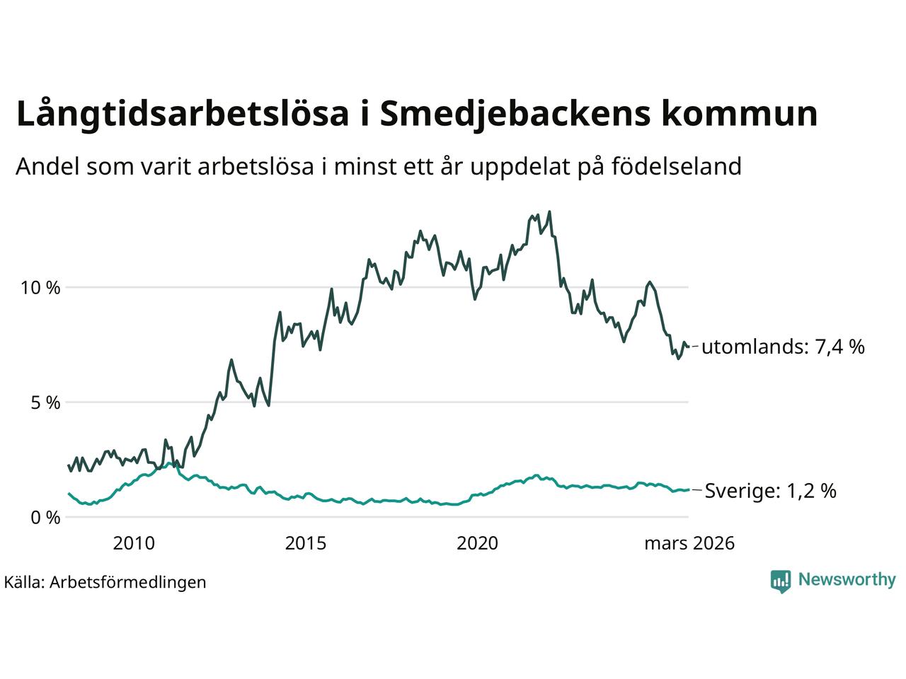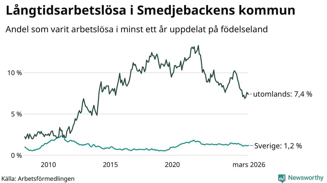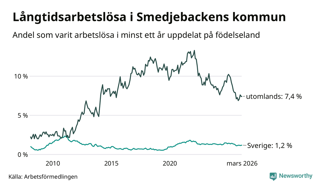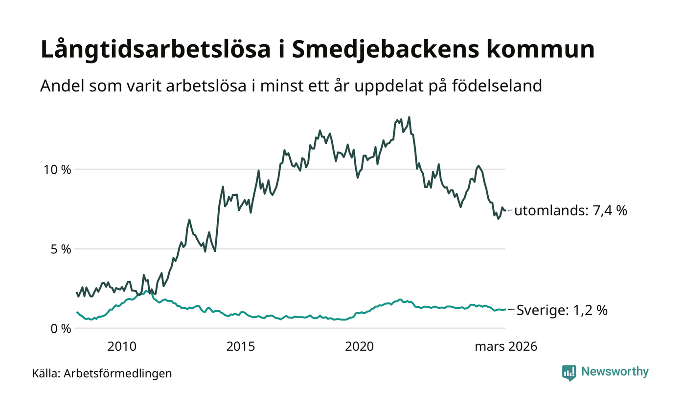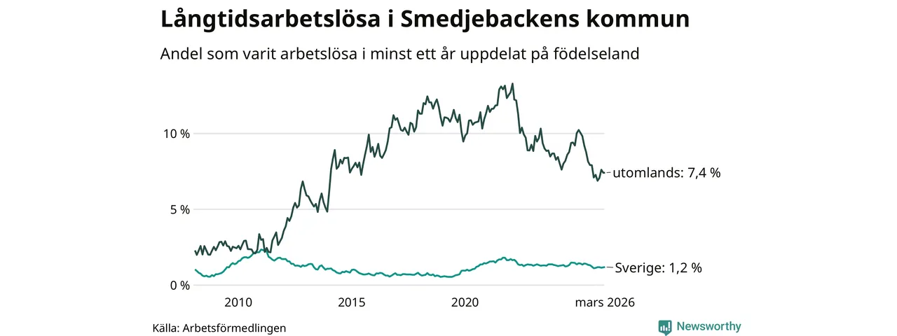 52 av de långtidsarbetslösa i Smedjebacken är födda i Sverige, medan 38 är födda utomlands. Det innebär att långtidsarbetslösheten bland Sverigefödda är 1,2 procent, medan den är sex gånger så hög – 7,4 procent – bland födda utomlands. Även i riket som helhet är arbetslösheten högre bland utrikesfödda.