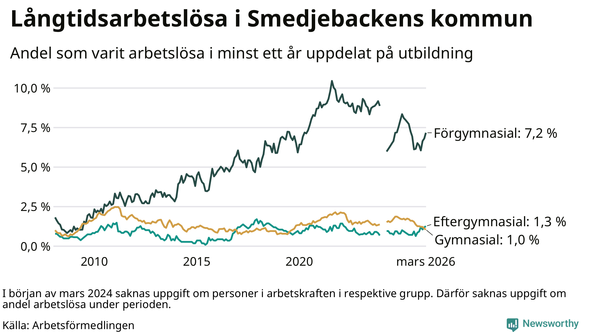 | Andel arbetslösa i minst två år | 1,1 % | 1,0 % | 1,6 % |