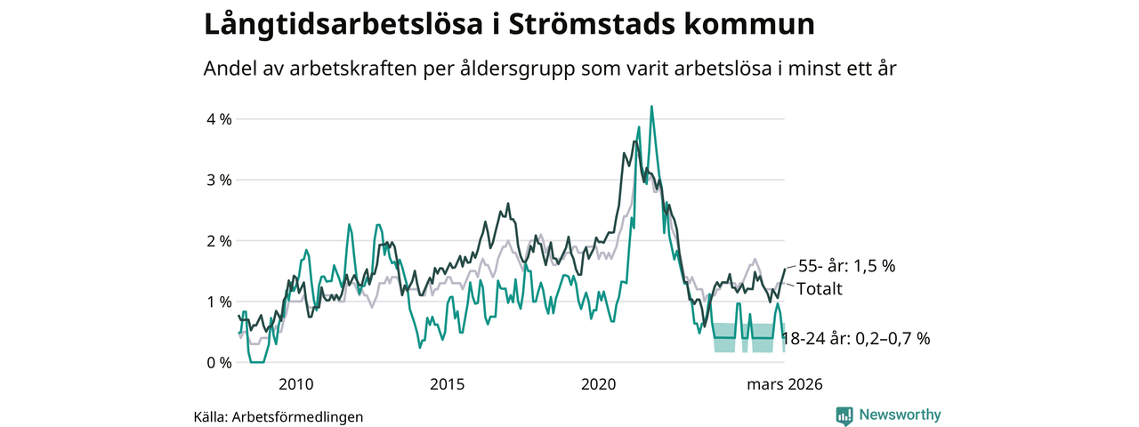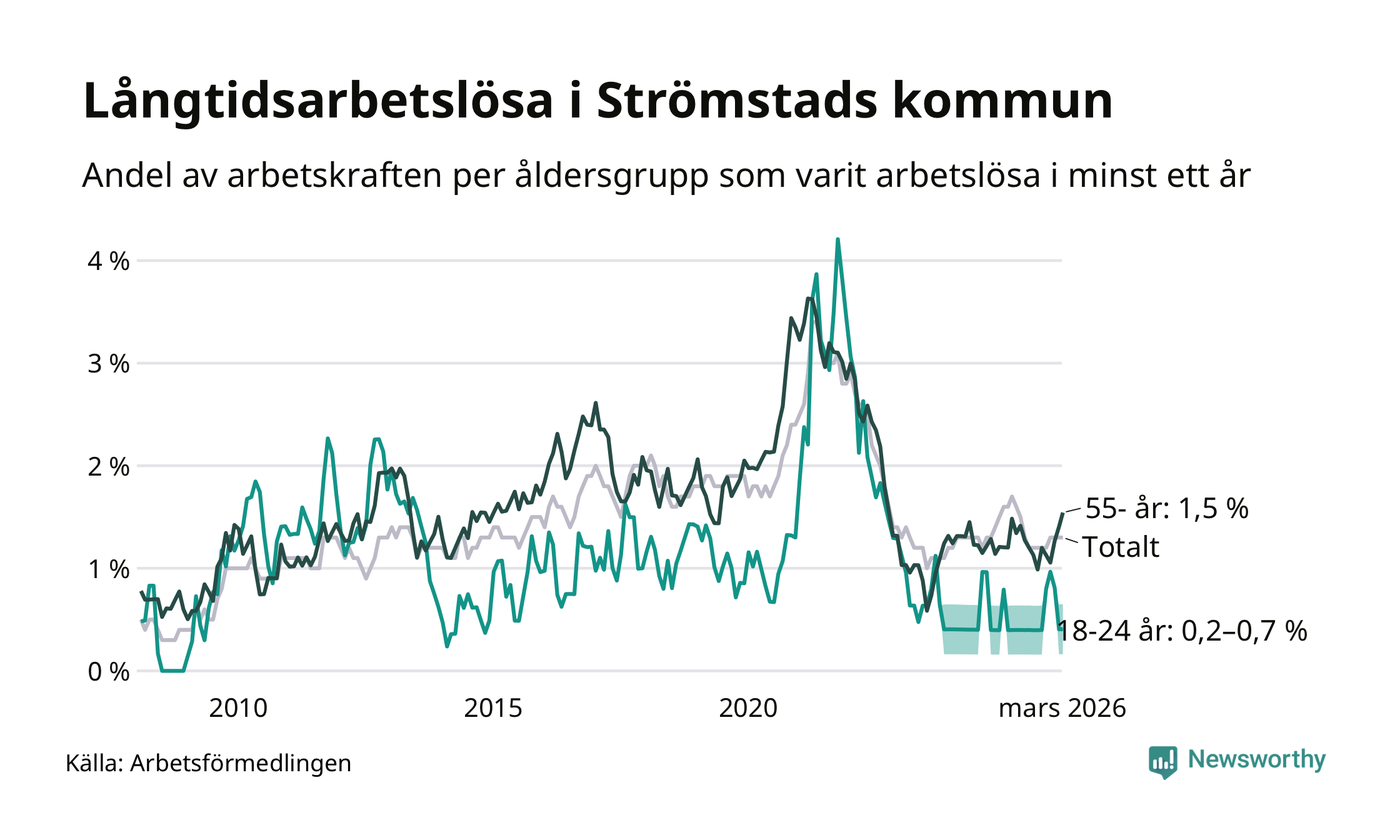 Av de 86 personerna som varit arbetslösa i mer än ett år i Strömstads kommun är 22 personer mellan 55 och 661 år och mellan en och fyra är mellan 18 och 24 år. För den äldre gruppen är andelen arbetslösa 1,5 procent medan den i den yngre gruppen är mellan 0,2 och 0,7 procent. Även i riket som helhet är långtidsarbetslösheten högre i gruppen äldre.