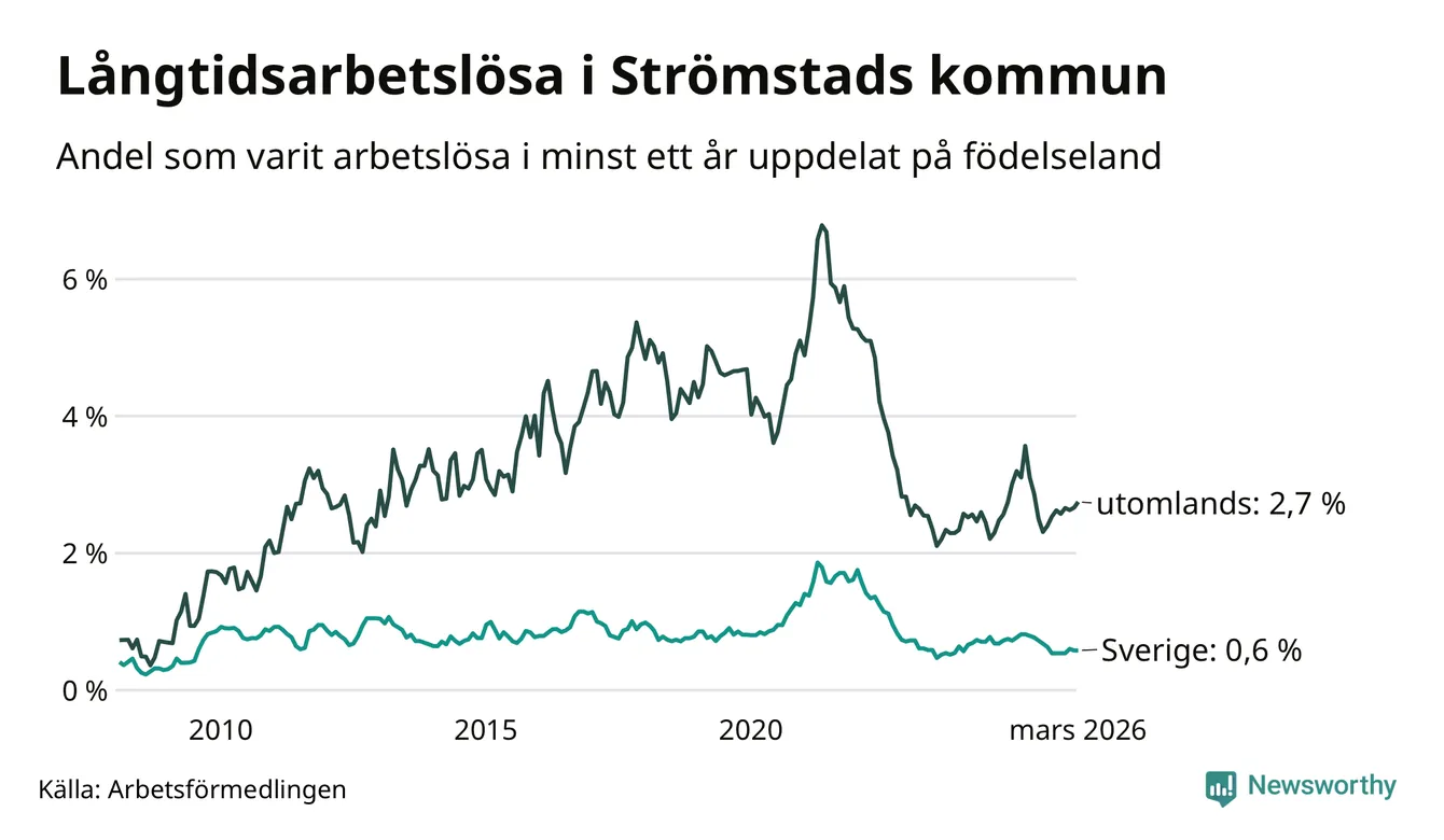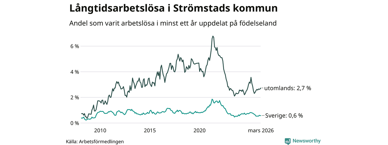 25 av de långtidsarbetslösa i Strömstad är födda i Sverige, medan 61 är födda utomlands. Det innebär att långtidsarbetslösheten bland Sverigefödda är 0,6 procent, medan den är fyra gånger så hög – 2,7 procent – bland födda utomlands. Även i riket som helhet är arbetslösheten högre bland utrikesfödda.