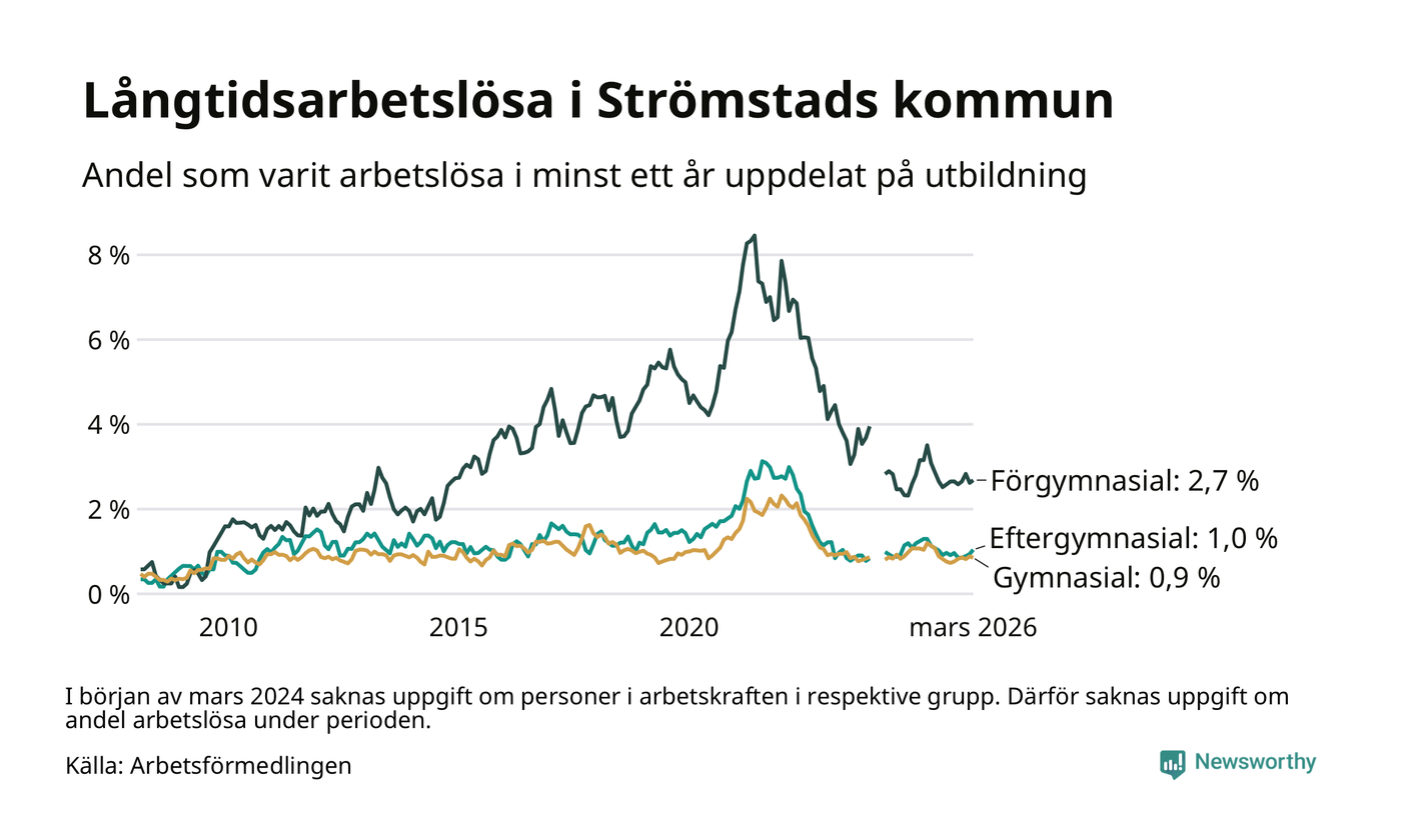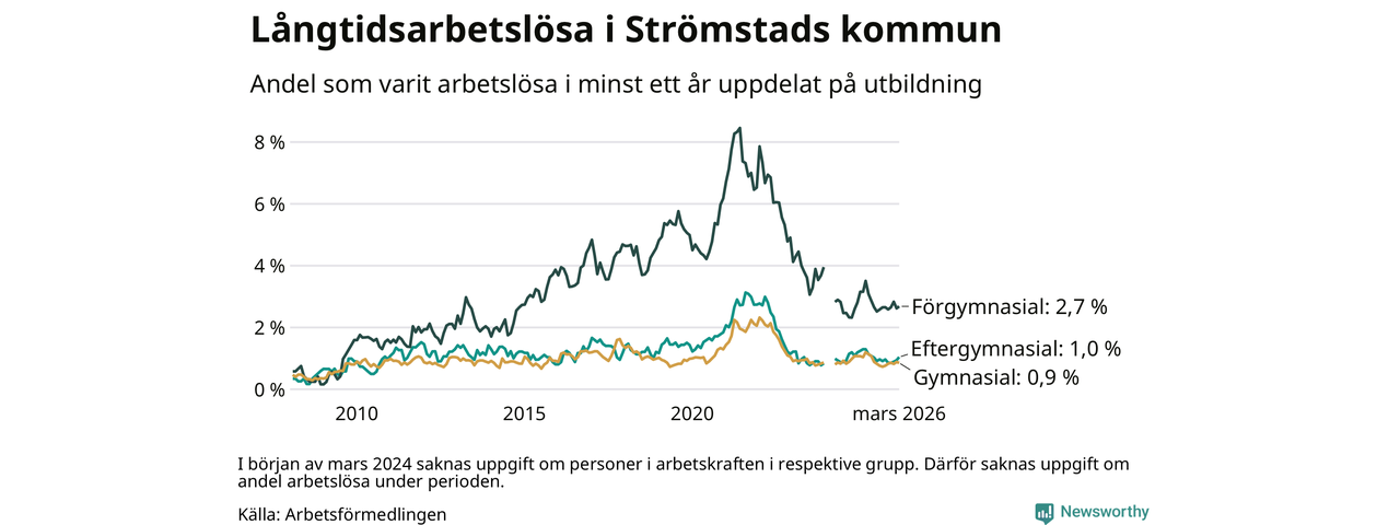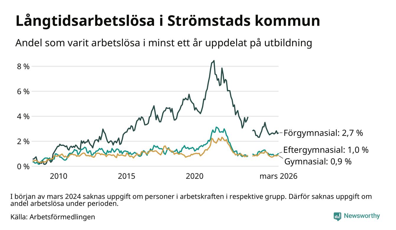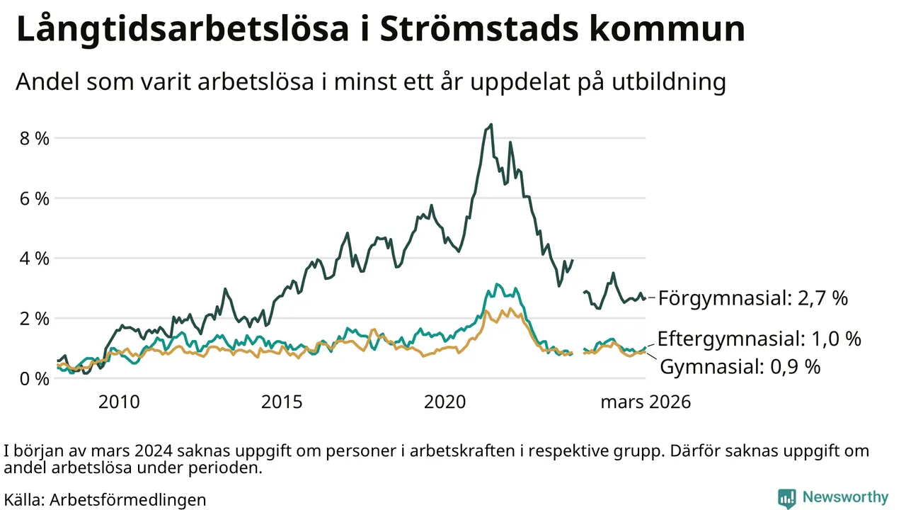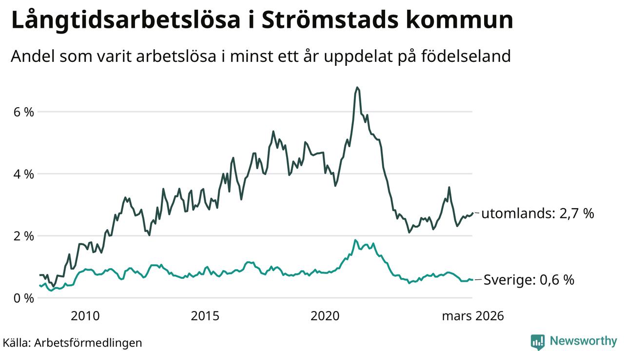 I mars hade 86 Strömstadsbor varit arbetslösa i minst ett år, vilket är två fler än månaden innan. Det är den fjärde månaden i rad med ökande antal långtidsarbetslösa. 86 personer motsvarar 1,3 procent av arbetskraften i kommunen – andelen långtidsarbetslösa är 0,4 procentenheter lägre än samma månad för ett år sedan.
