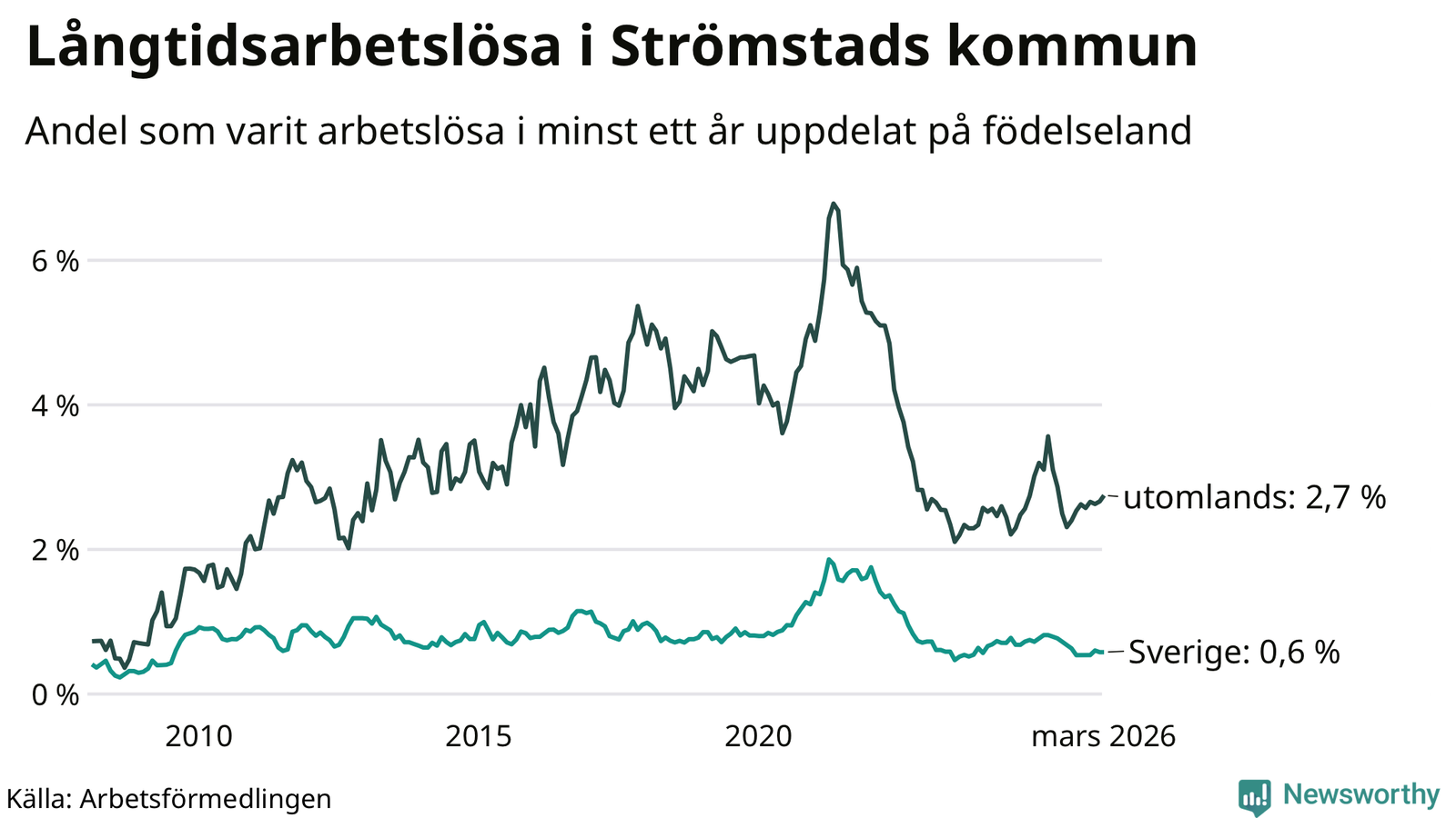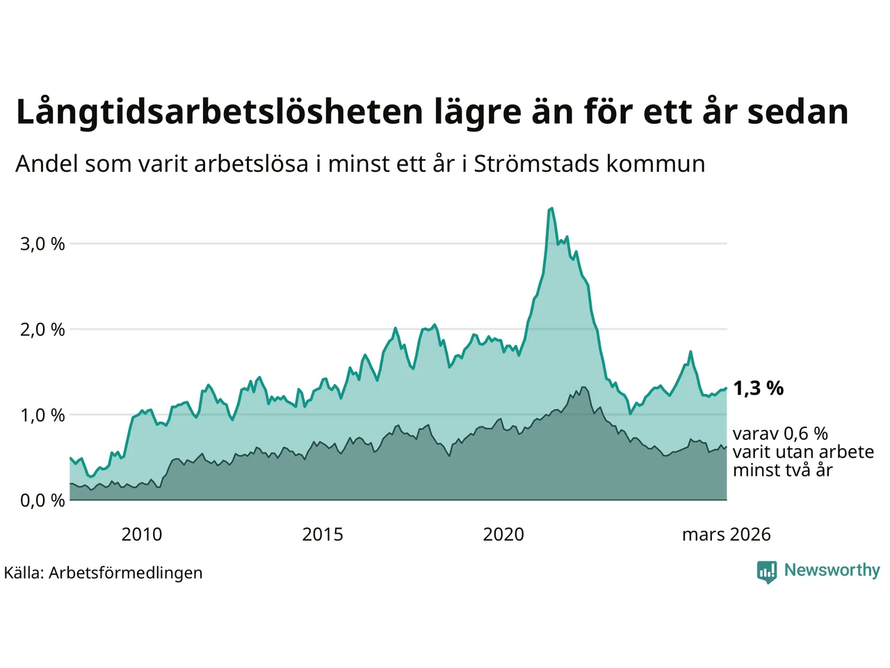 | Andel arbetslösa i minst två år | 0,6 % | 1,3 % | 1,6 % |