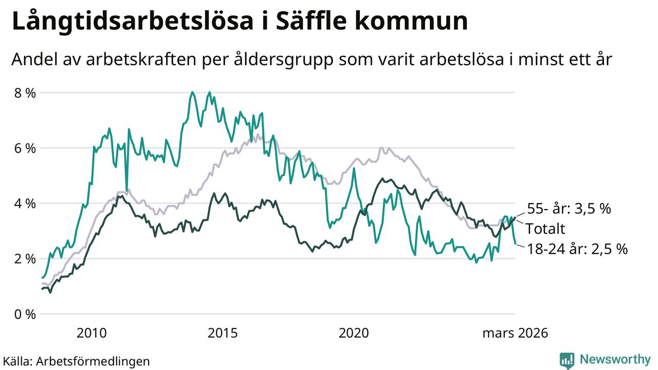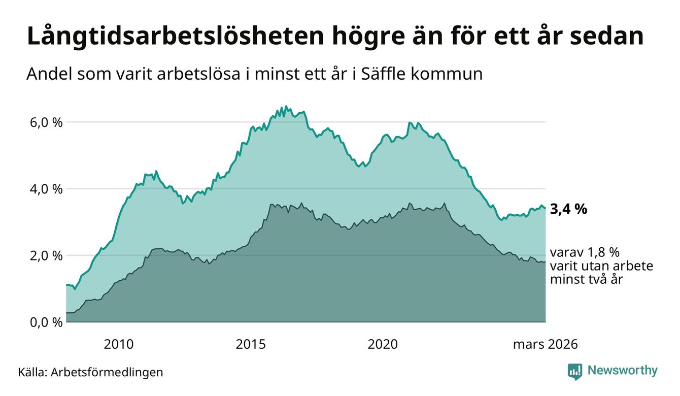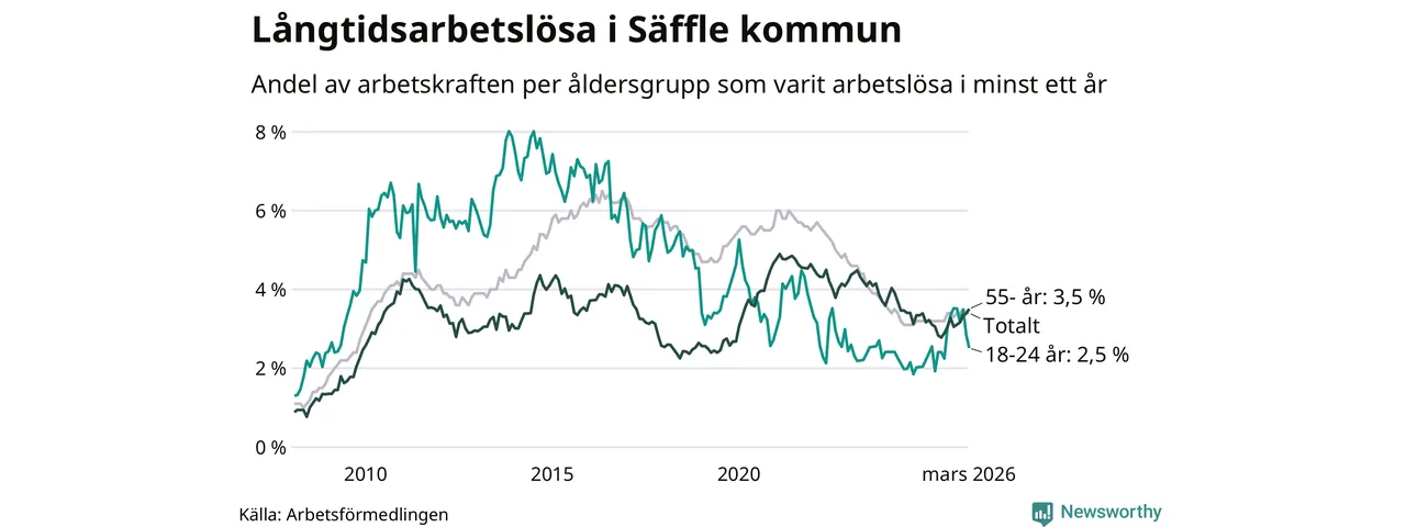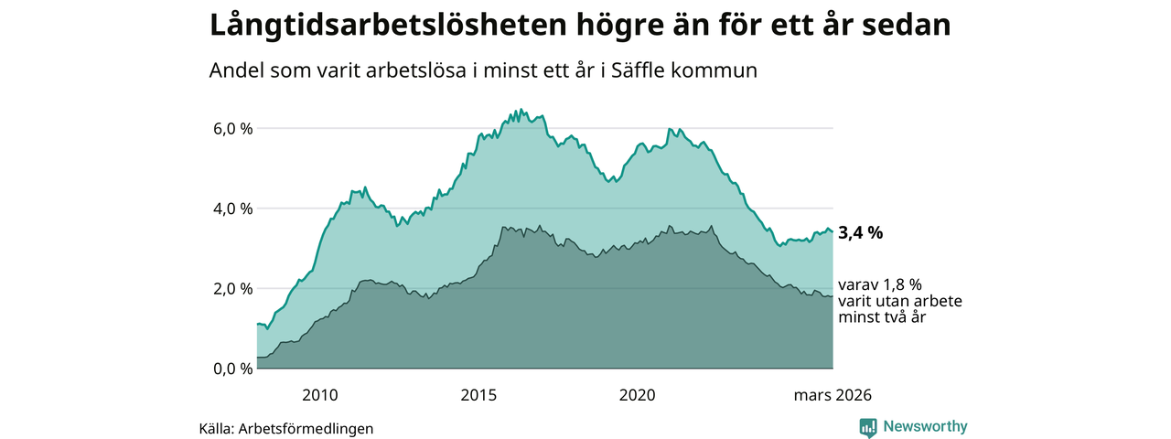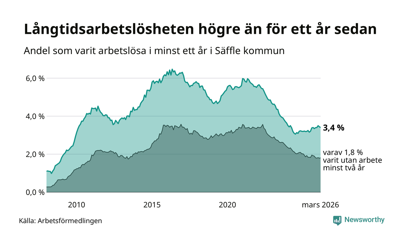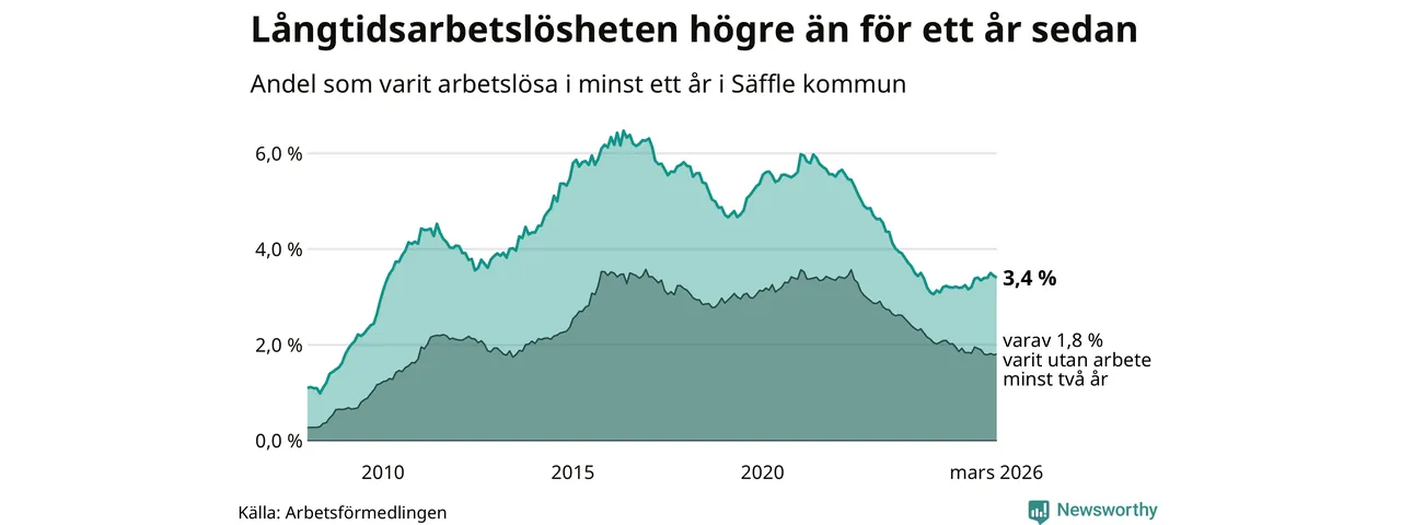 I mars hade 222 Säfflebor varit arbetslösa i minst ett år, vilket är tre färre än månaden innan. 222 personer motsvarar 3,4 procent av arbetskraften i kommunen – andelen långtidsarbetslösa är 0,2 procentenheter högre än samma månad för ett år sedan.