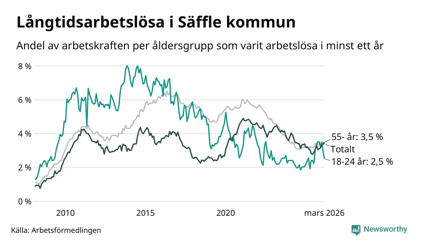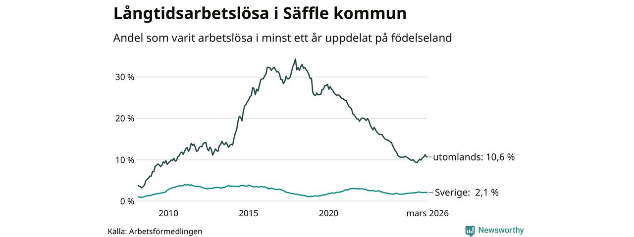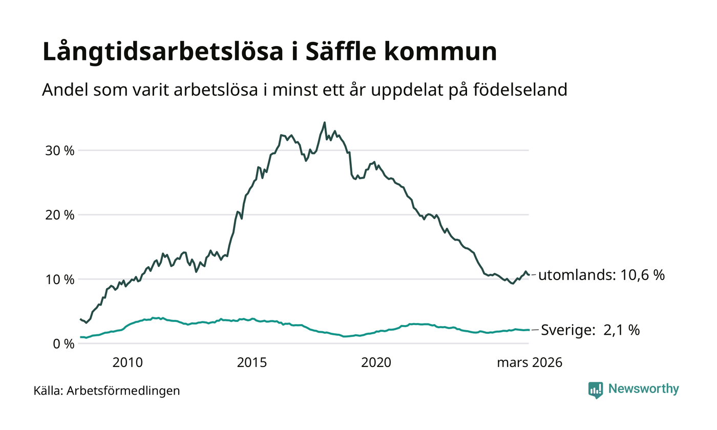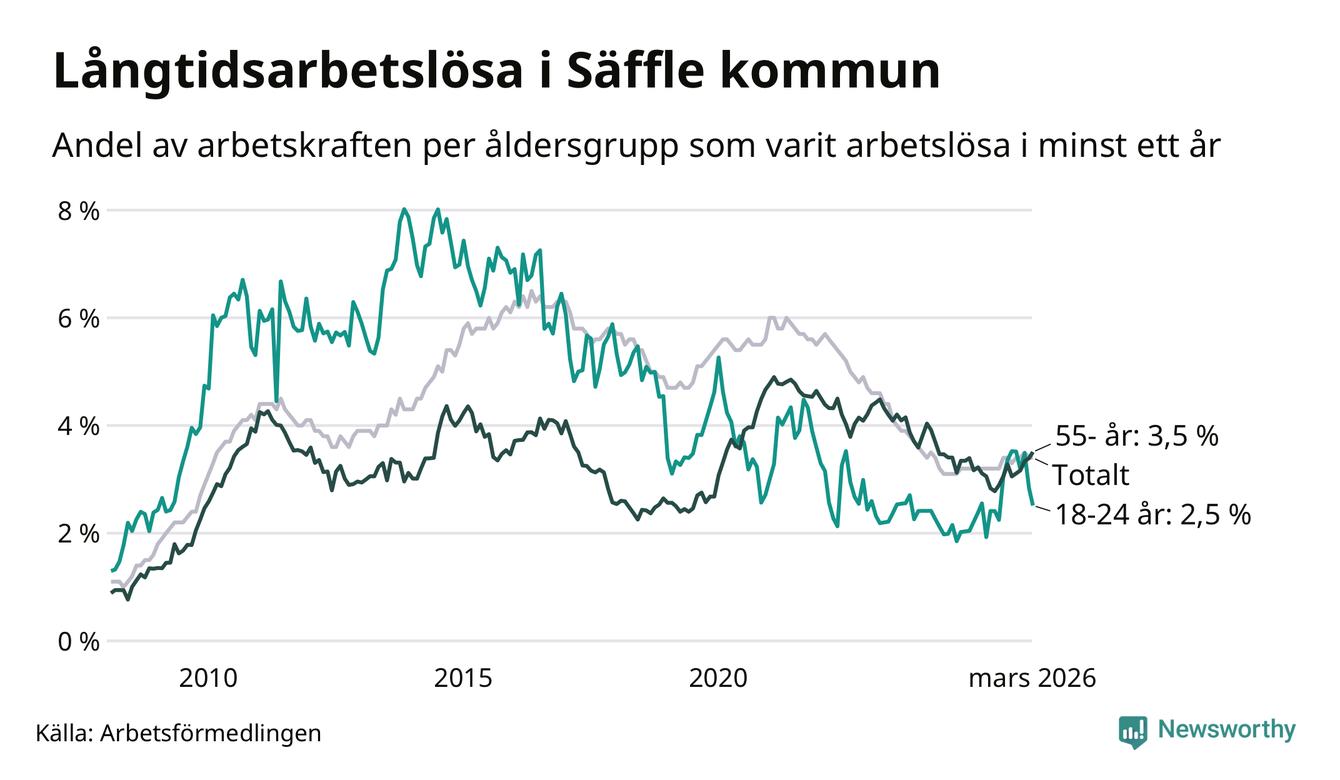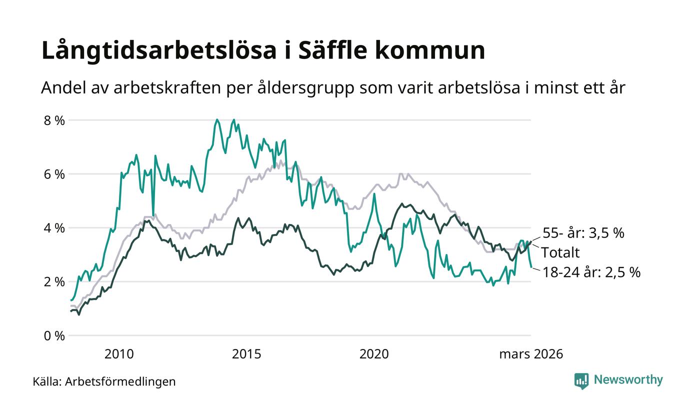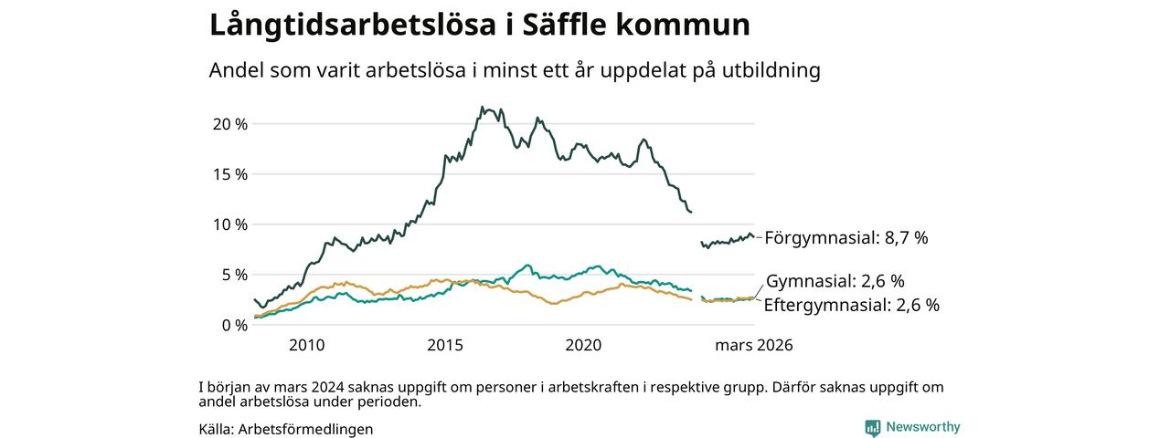 I mars hade 222 Säfflebor varit arbetslösa i minst ett år, vilket är tre färre än månaden innan. 222 personer motsvarar 3,4 procent av arbetskraften i kommunen – andelen långtidsarbetslösa är 0,2 procentenheter högre än samma månad för ett år sedan.