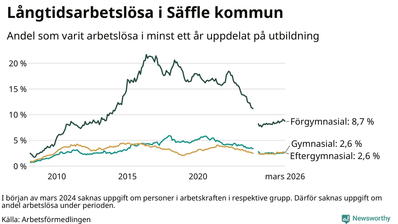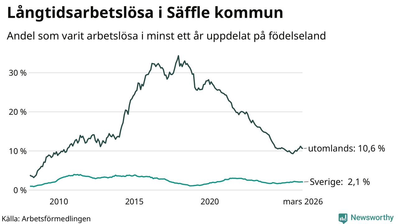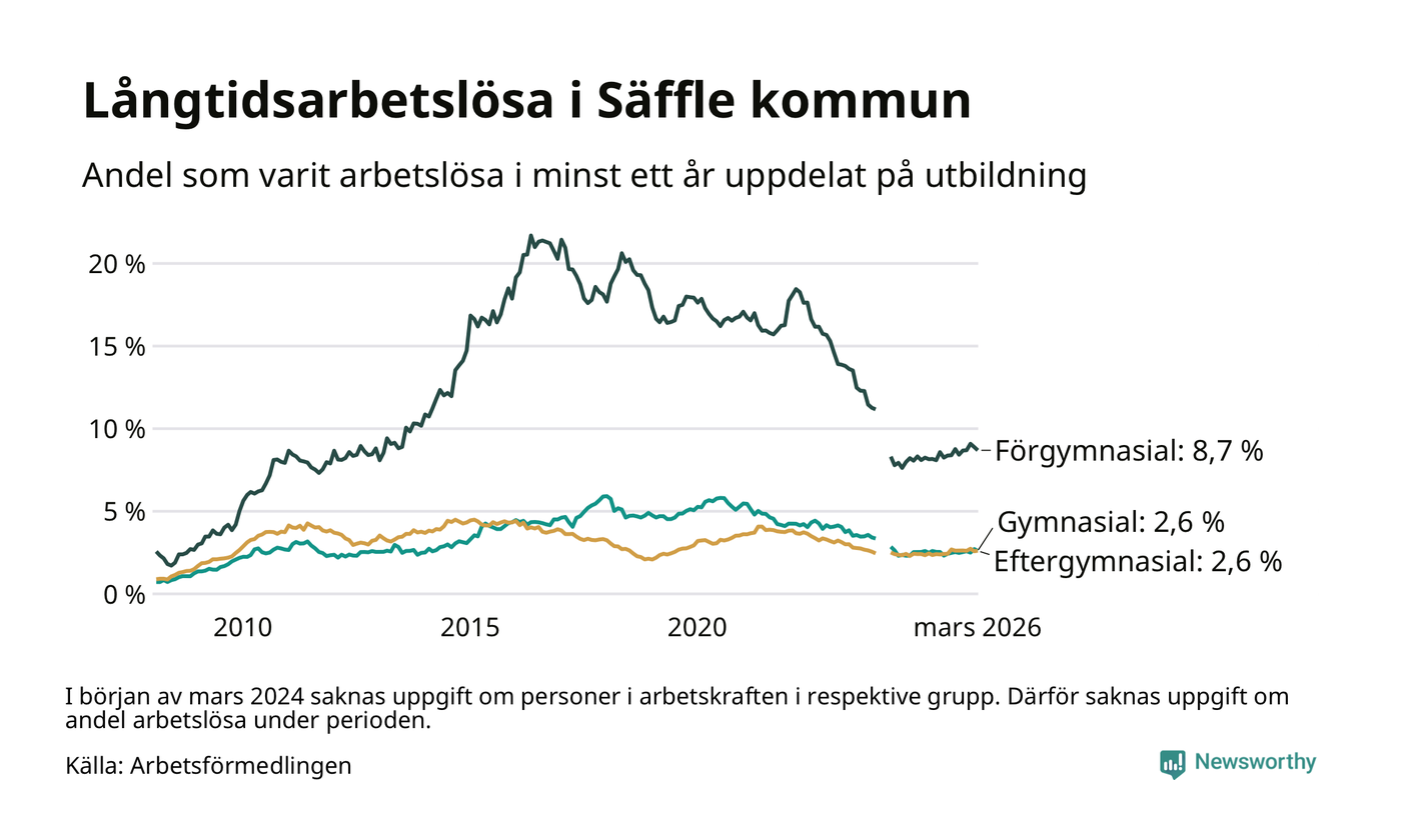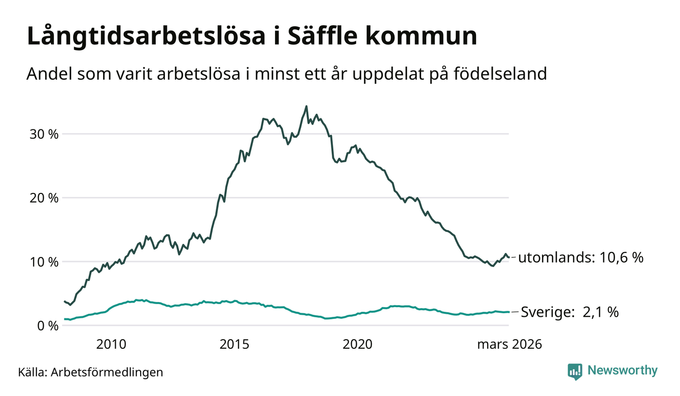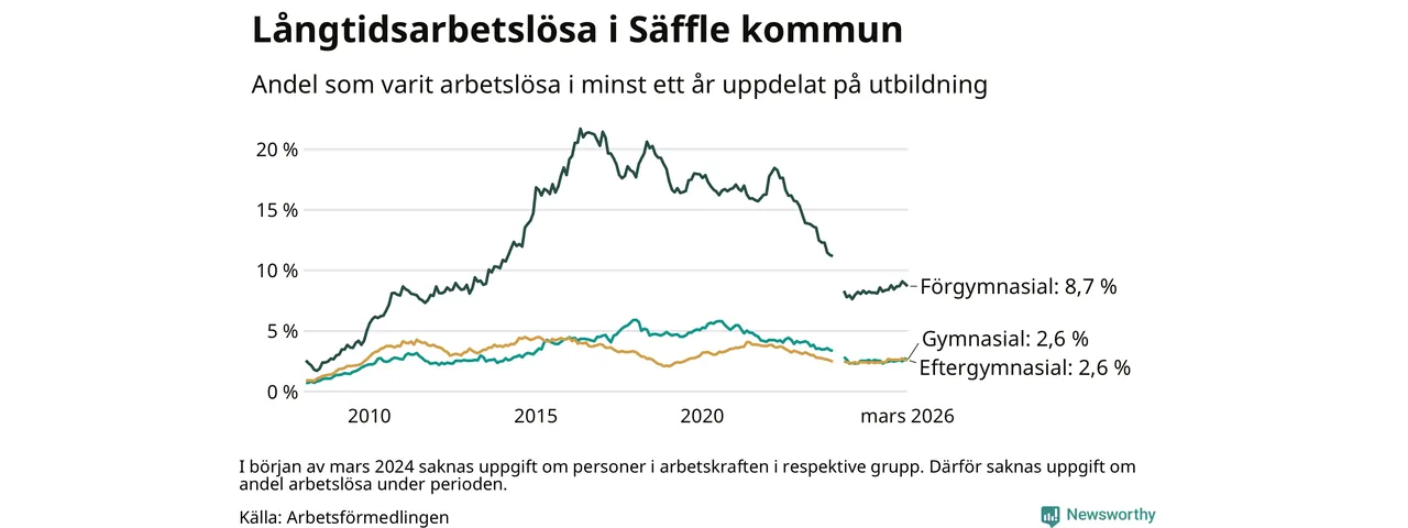 I mars hade 222 Säfflebor varit arbetslösa i minst ett år, vilket är tre färre än månaden innan. 222 personer motsvarar 3,4 procent av arbetskraften i kommunen – andelen långtidsarbetslösa är 0,2 procentenheter högre än samma månad för ett år sedan.