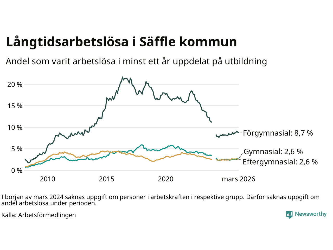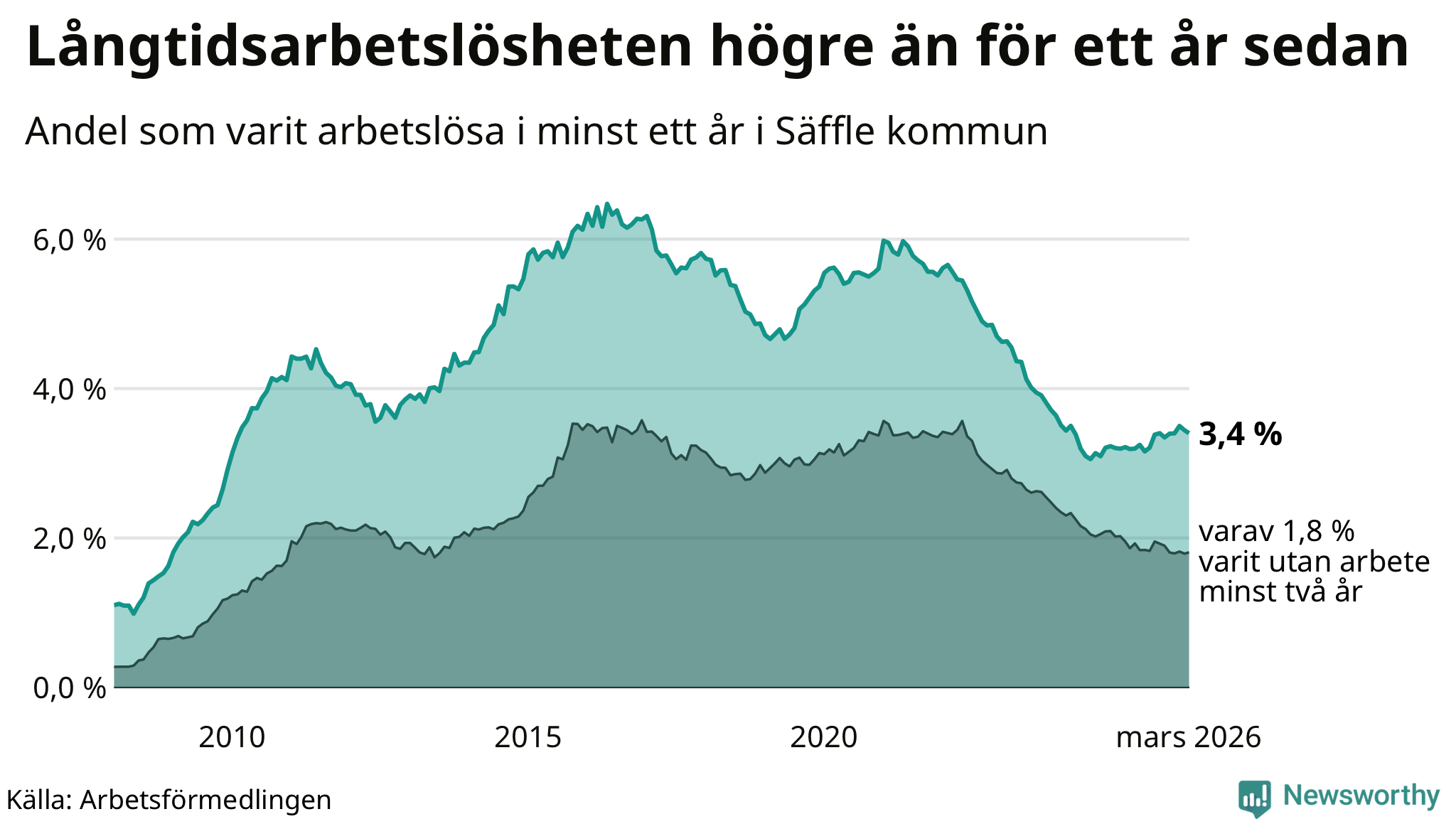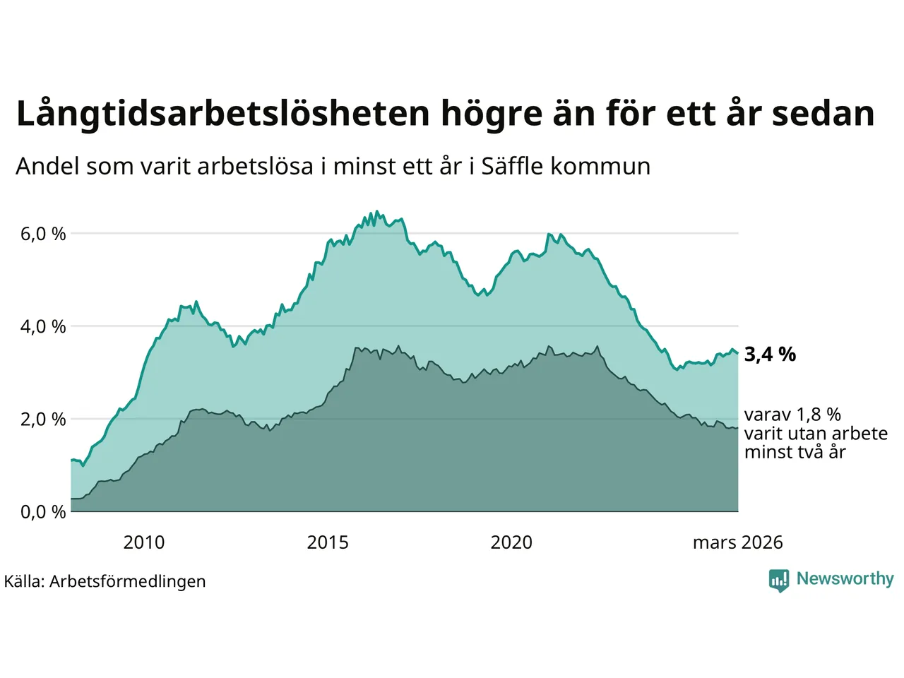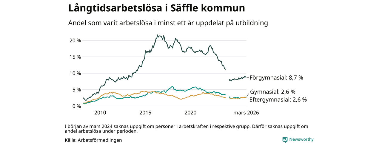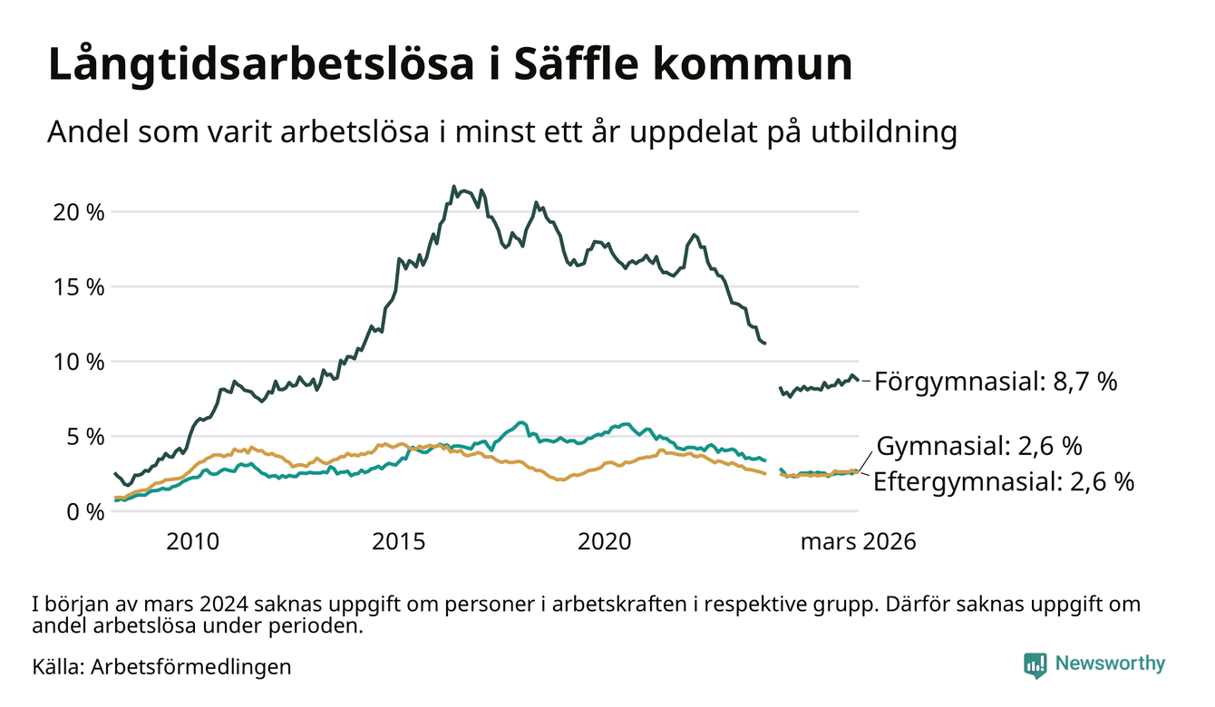 I mars hade 222 Säfflebor varit arbetslösa i minst ett år, vilket är tre färre än månaden innan. 222 personer motsvarar 3,4 procent av arbetskraften i kommunen – andelen långtidsarbetslösa är 0,2 procentenheter högre än samma månad för ett år sedan.