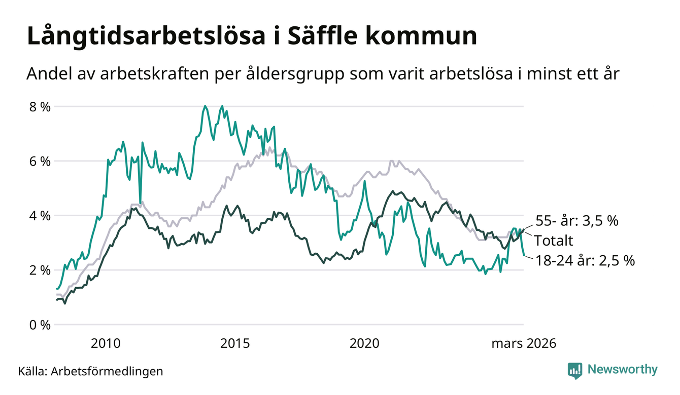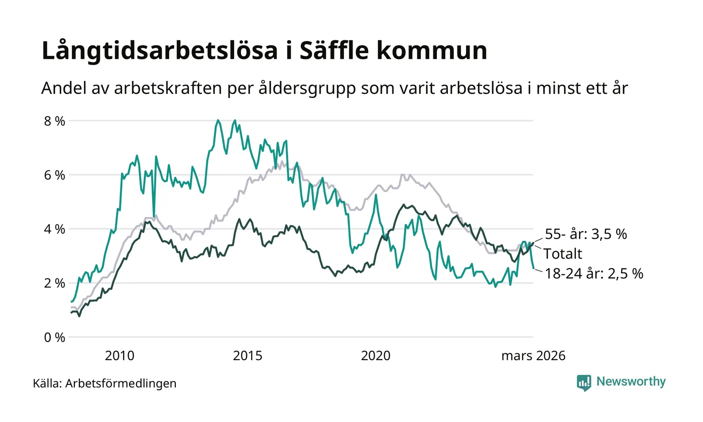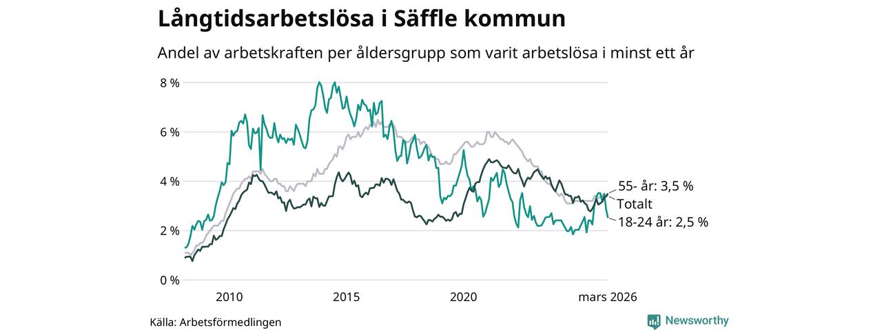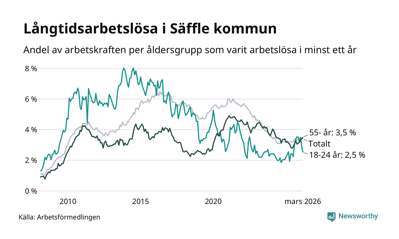 Av de 222 personerna som varit arbetslösa i mer än ett år i Säffle kommun är 63 personer mellan 55 och 661 år och 16 är mellan 18 och 24 år. För den äldre gruppen är andelen arbetslösa 3,5 procent medan den i den yngre gruppen är 2,5 procent. Även i riket som helhet är långtidsarbetslösheten högre i gruppen äldre.