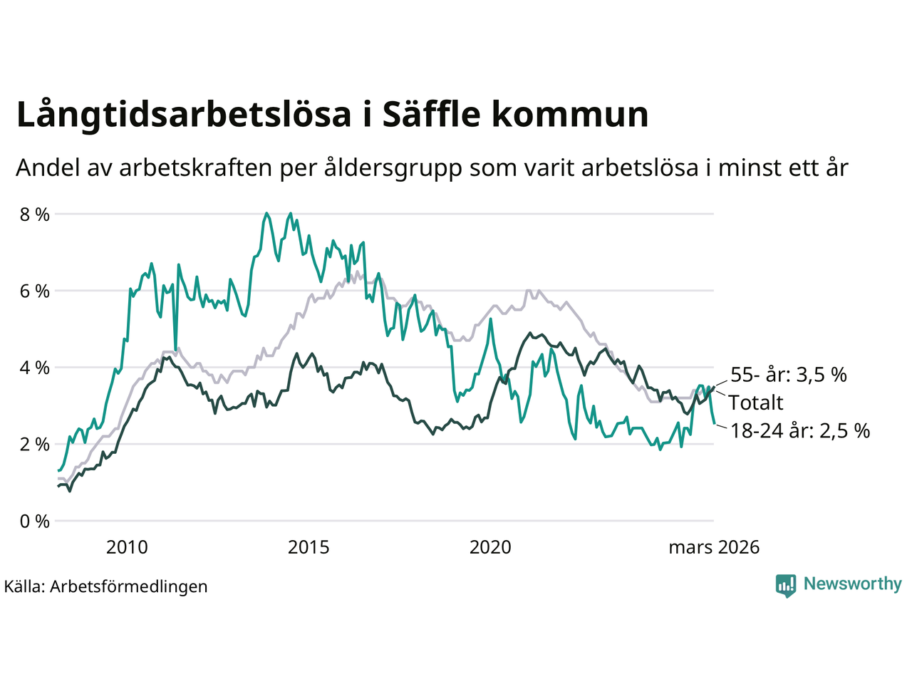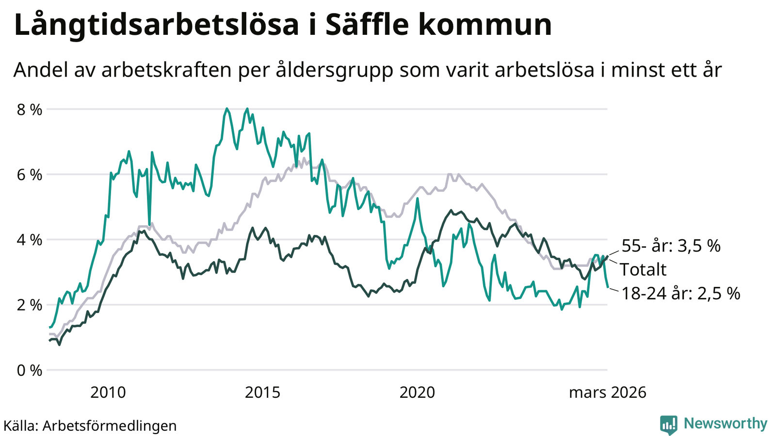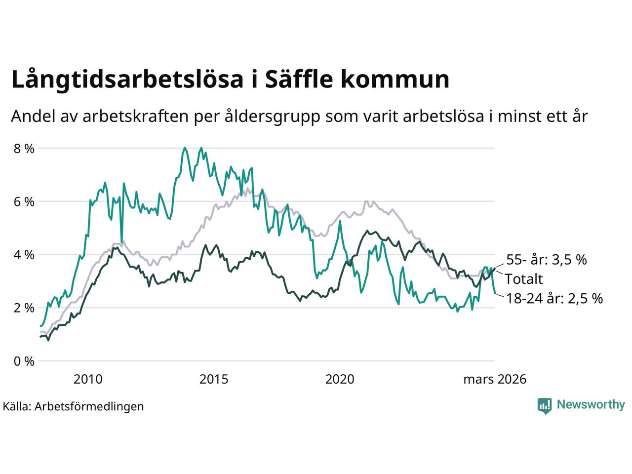 Av de 222 personerna som varit arbetslösa i mer än ett år i Säffle kommun är 63 personer mellan 55 och 661 år och 16 är mellan 18 och 24 år. För den äldre gruppen är andelen arbetslösa 3,5 procent medan den i den yngre gruppen är 2,5 procent. Även i riket som helhet är långtidsarbetslösheten högre i gruppen äldre.