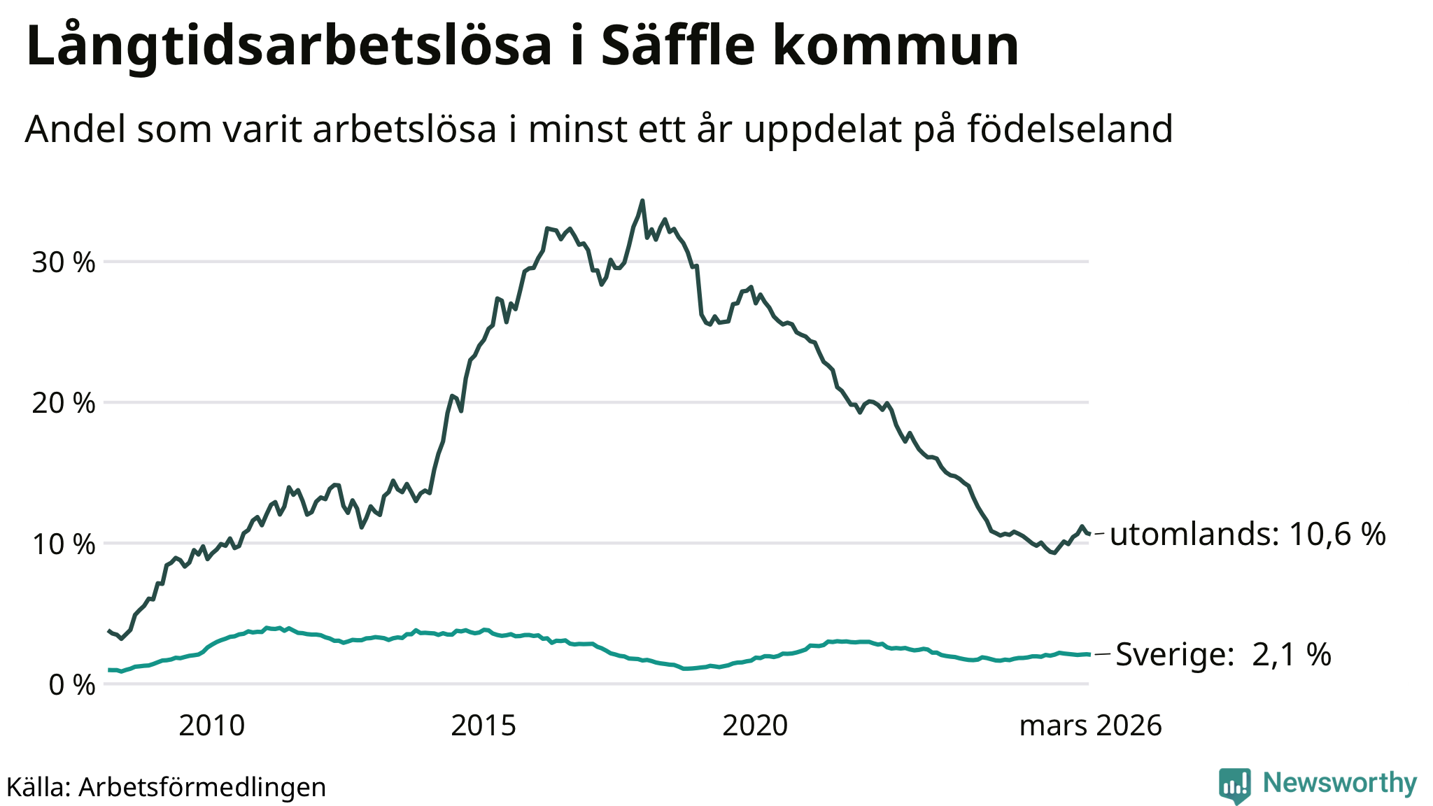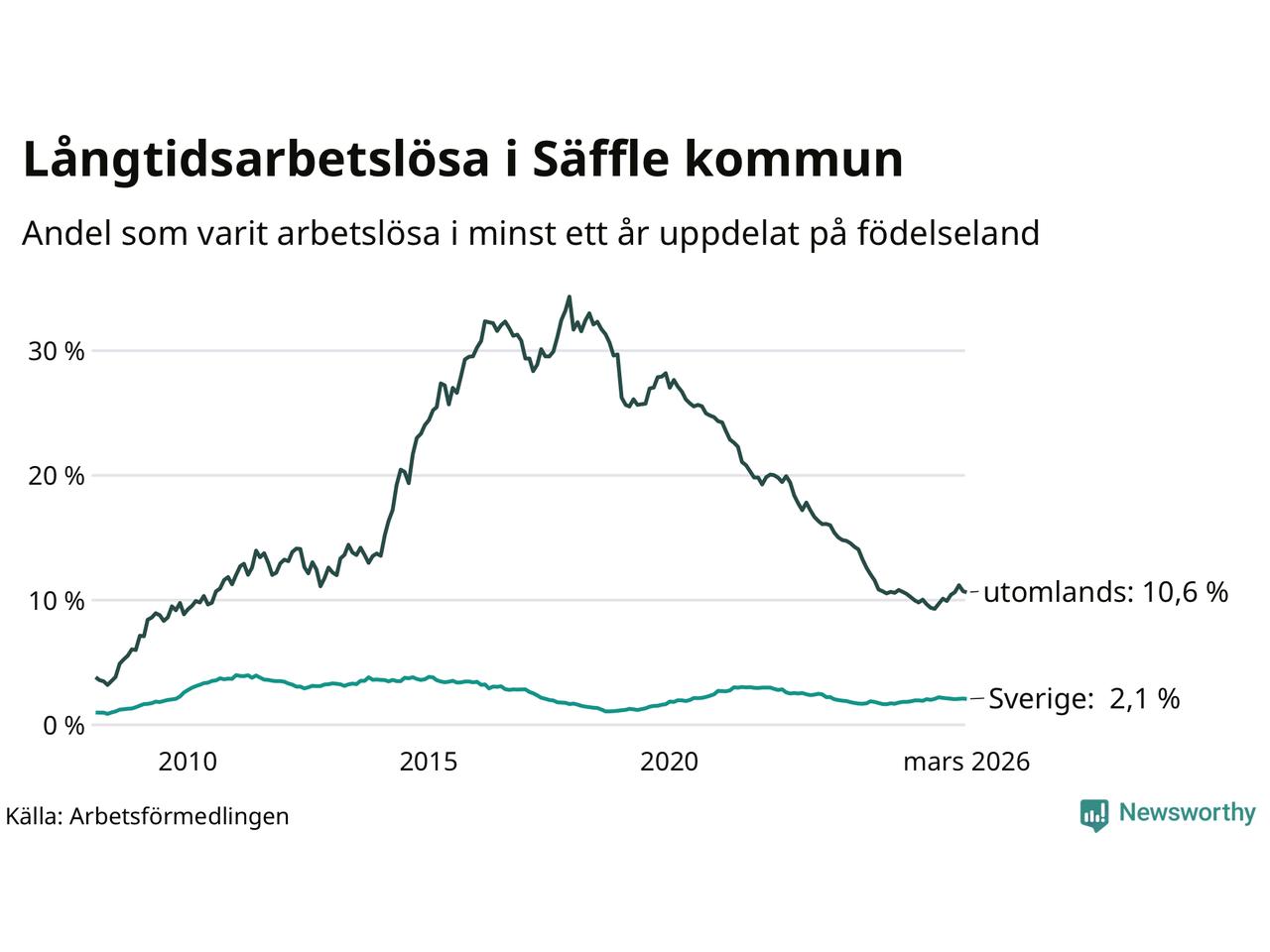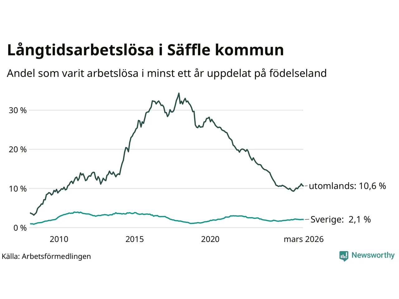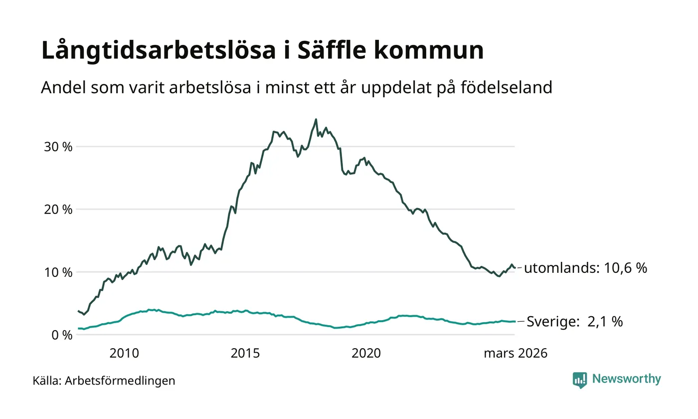 114 av de långtidsarbetslösa i Säffle är födda i Sverige, medan 108 är födda utomlands. Det innebär att långtidsarbetslösheten bland Sverigefödda är 2,1 procent, medan den är fem gånger så hög – 10,6 procent – bland födda utomlands. Även i riket som helhet är arbetslösheten högre bland utrikesfödda.
