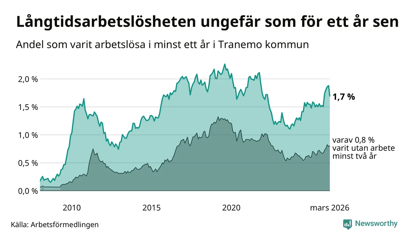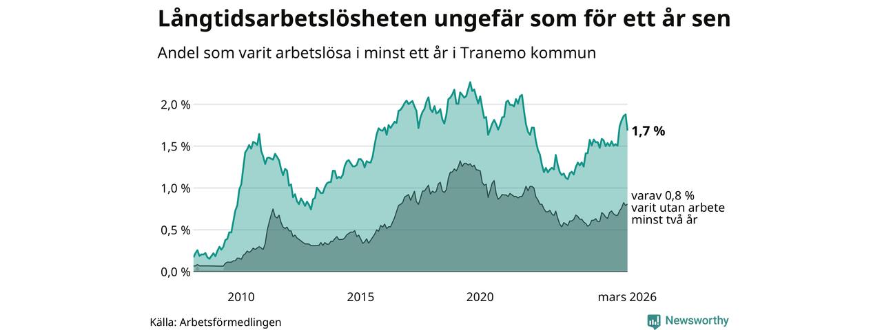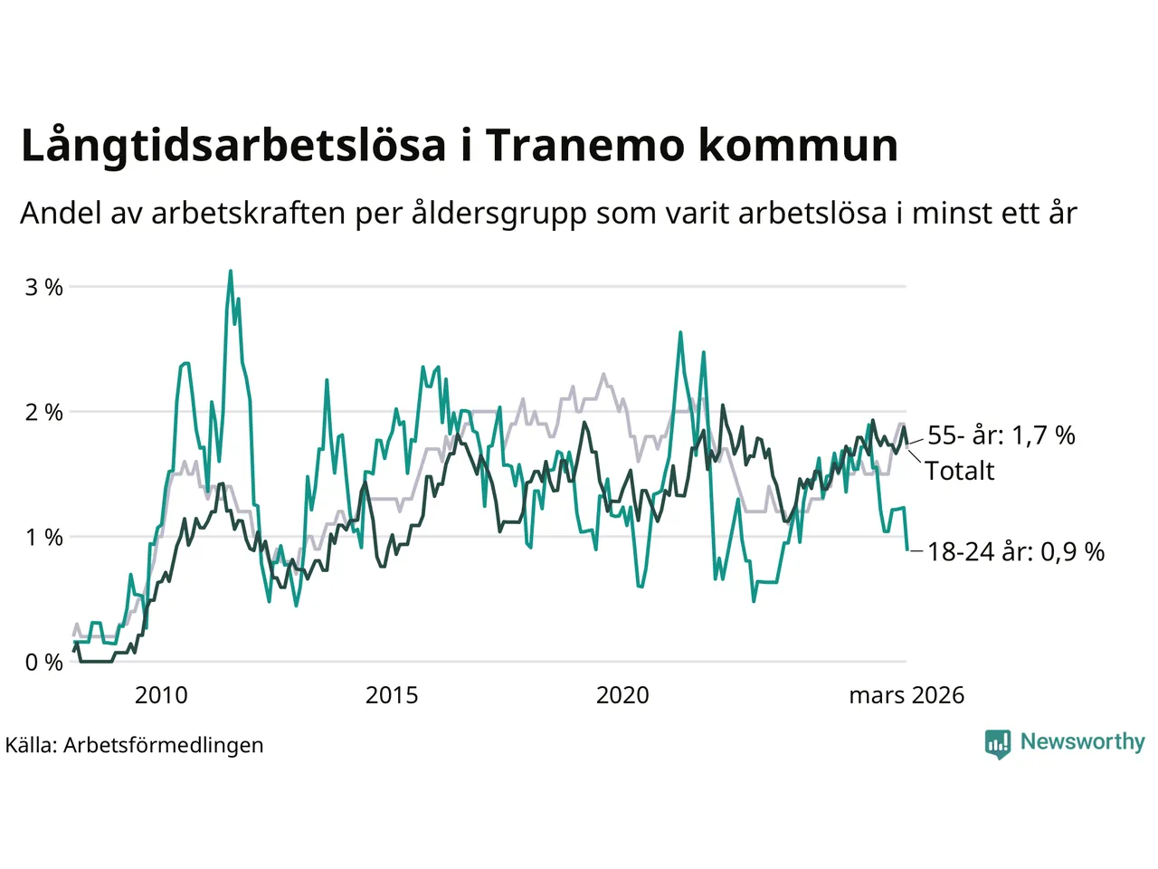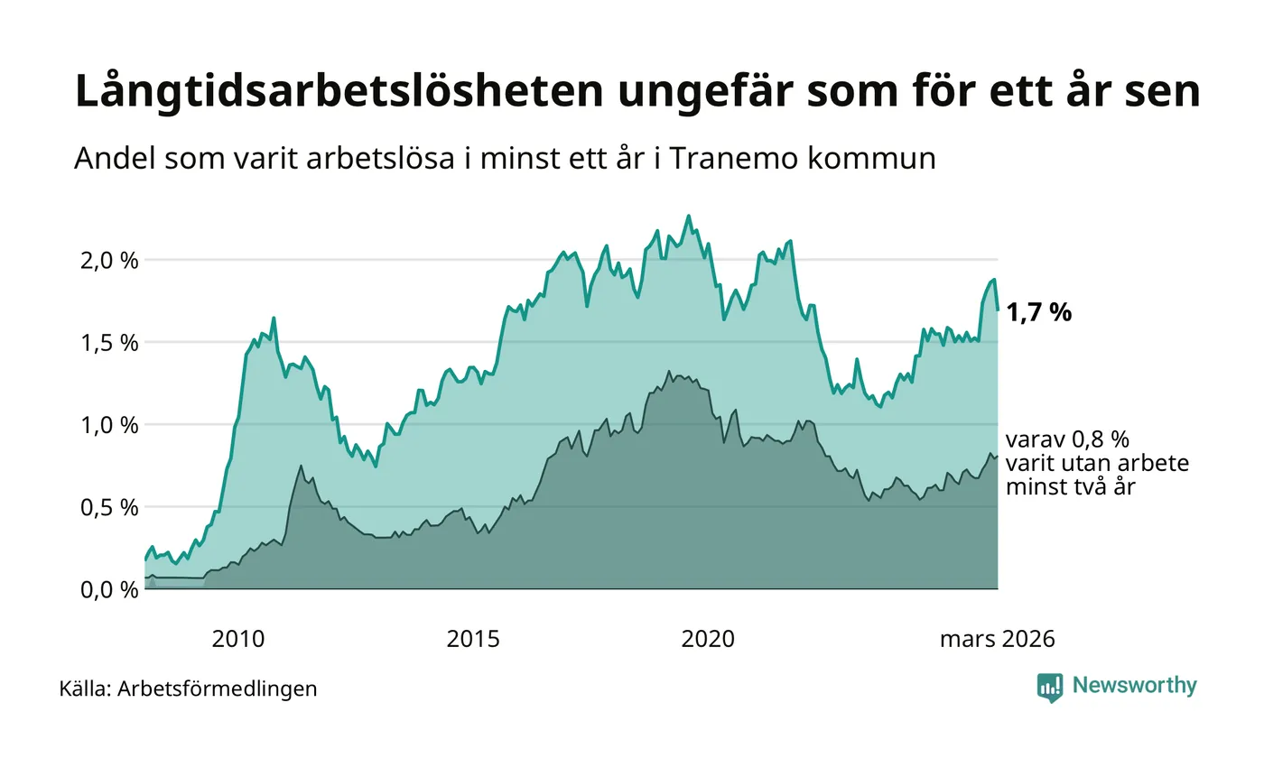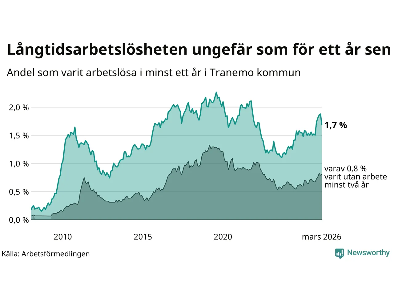 I mars hade 96 Tranemobor varit arbetslösa i minst ett år, vilket är elva färre än månaden innan. Det är den första månaden sedan oktober 2025 som antalet arbetslösa minskar. 96 personer motsvarar 1,7 procent av arbetskraften i kommunen – andelen långtidsarbetslösa är ungefär på samma nivå som för ett år sedan.