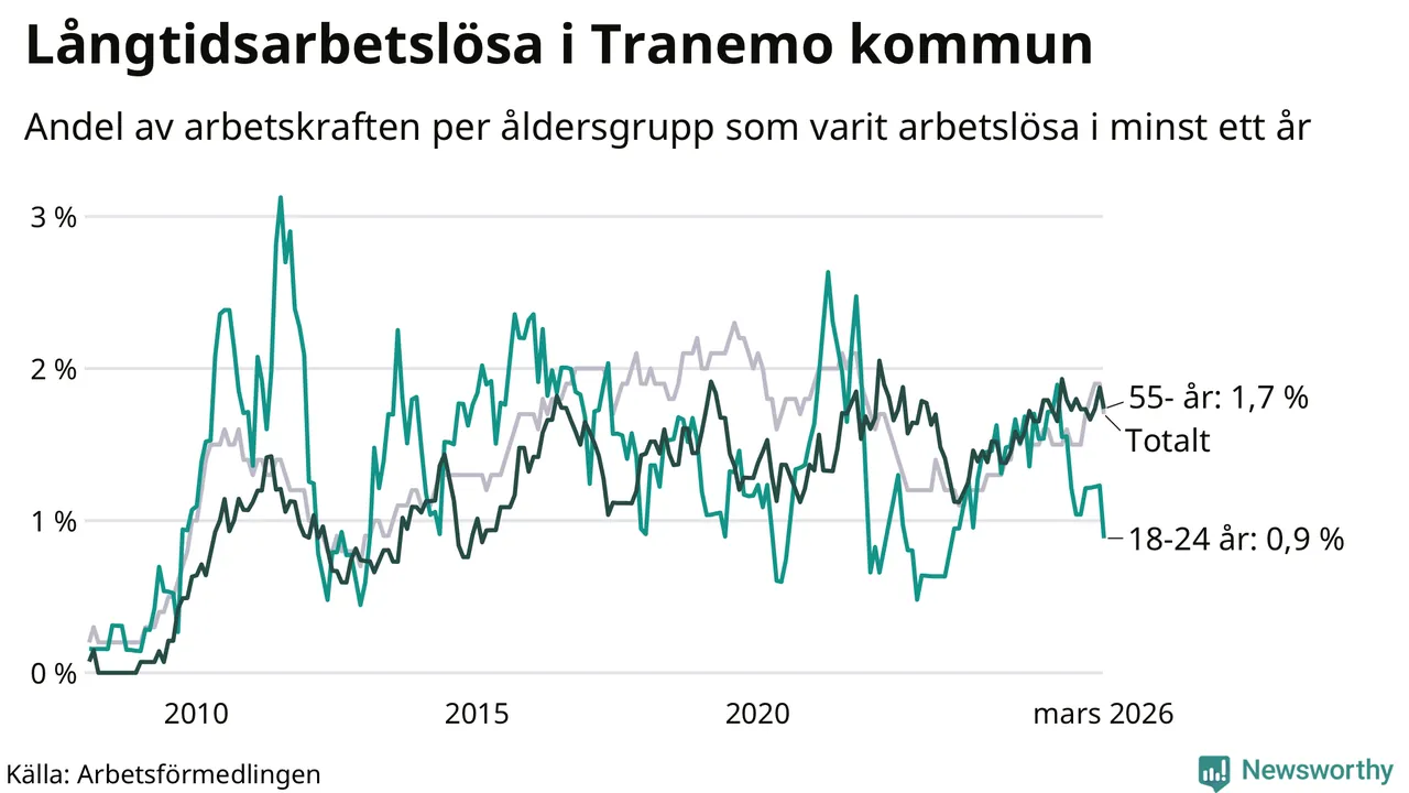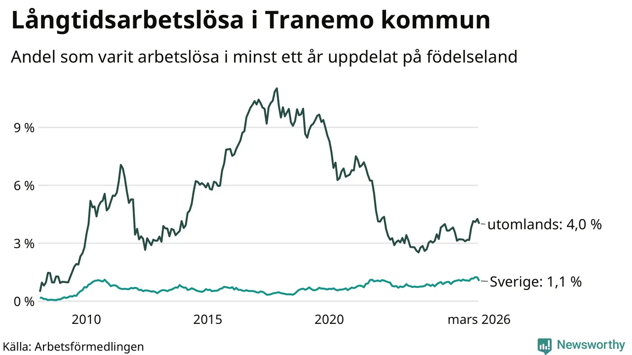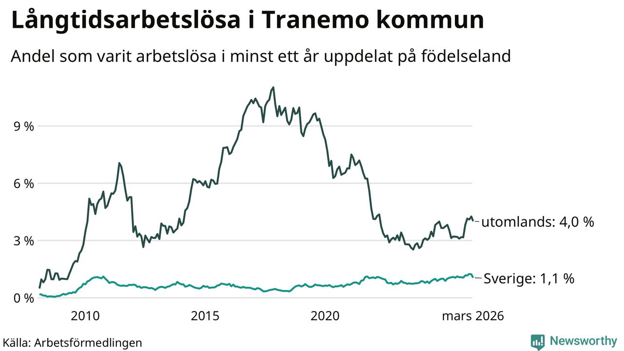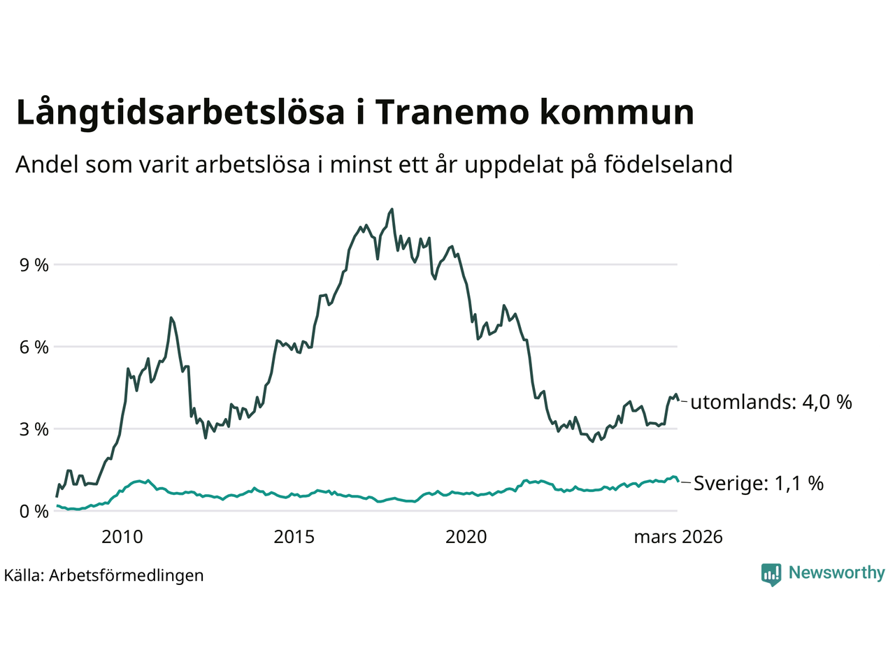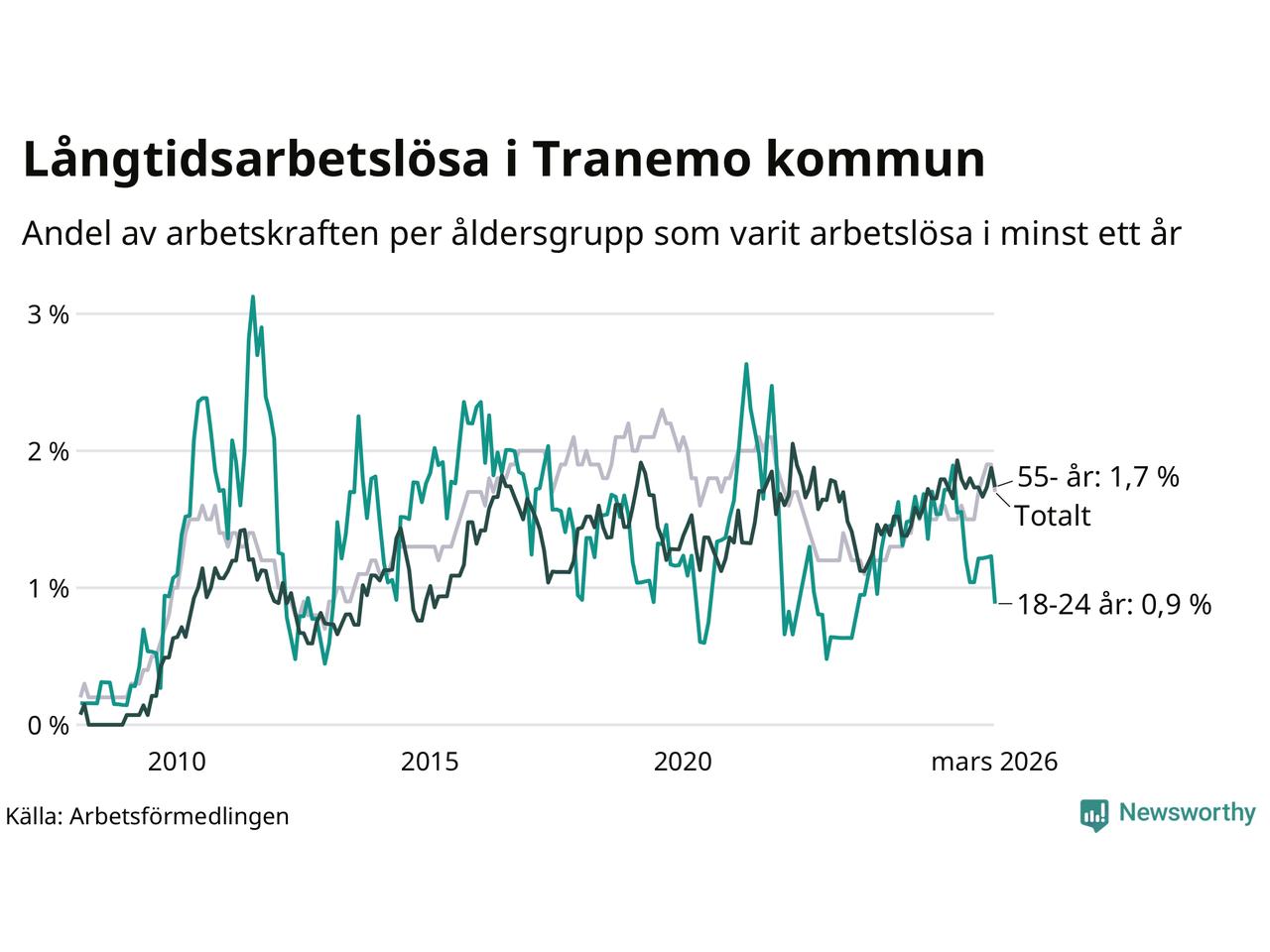 I mars hade 96 Tranemobor varit arbetslösa i minst ett år, vilket är elva färre än månaden innan. Det är den första månaden sedan oktober 2025 som antalet arbetslösa minskar. 96 personer motsvarar 1,7 procent av arbetskraften i kommunen – andelen långtidsarbetslösa är ungefär på samma nivå som för ett år sedan.