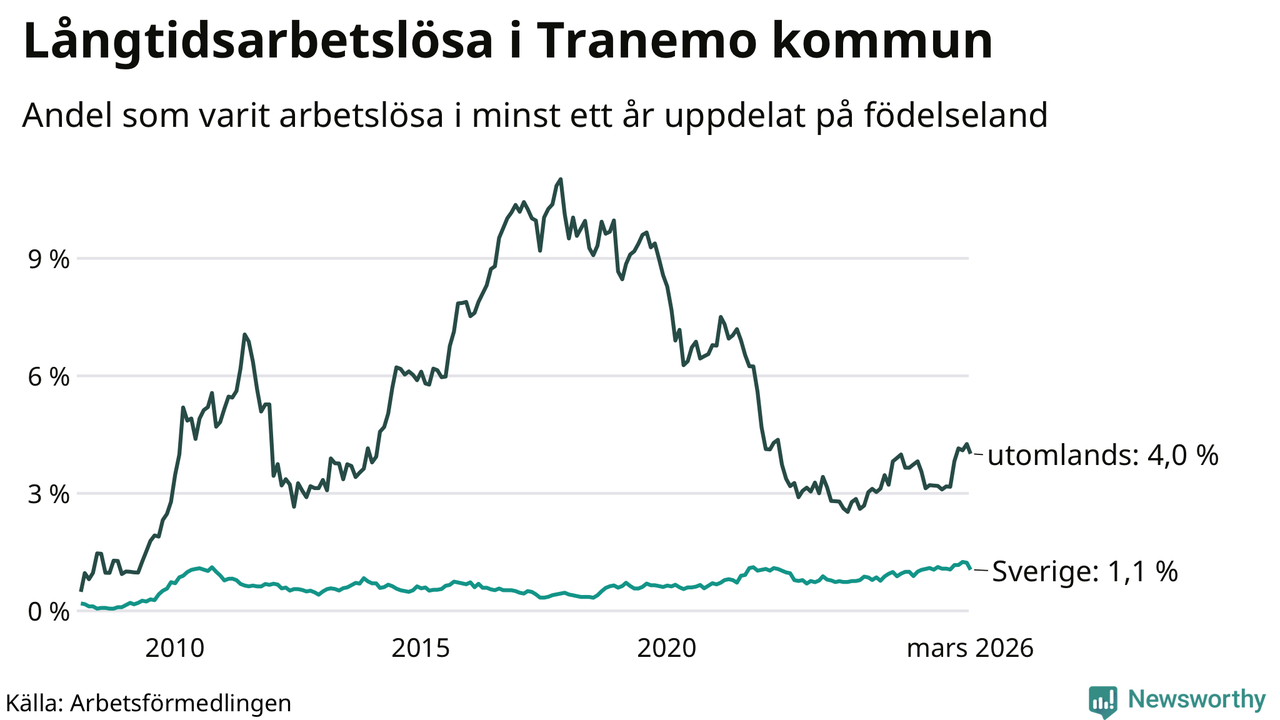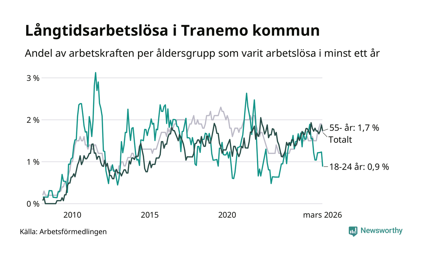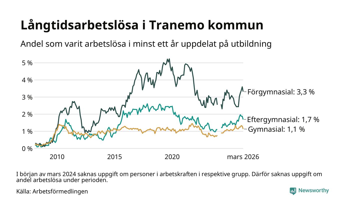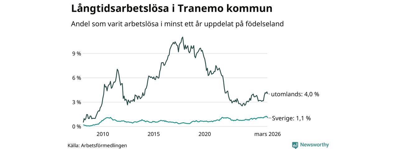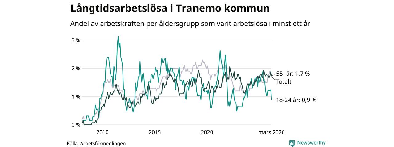 I mars hade 96 Tranemobor varit arbetslösa i minst ett år, vilket är elva färre än månaden innan. Det är den första månaden sedan oktober 2025 som antalet arbetslösa minskar. 96 personer motsvarar 1,7 procent av arbetskraften i kommunen – andelen långtidsarbetslösa är ungefär på samma nivå som för ett år sedan.