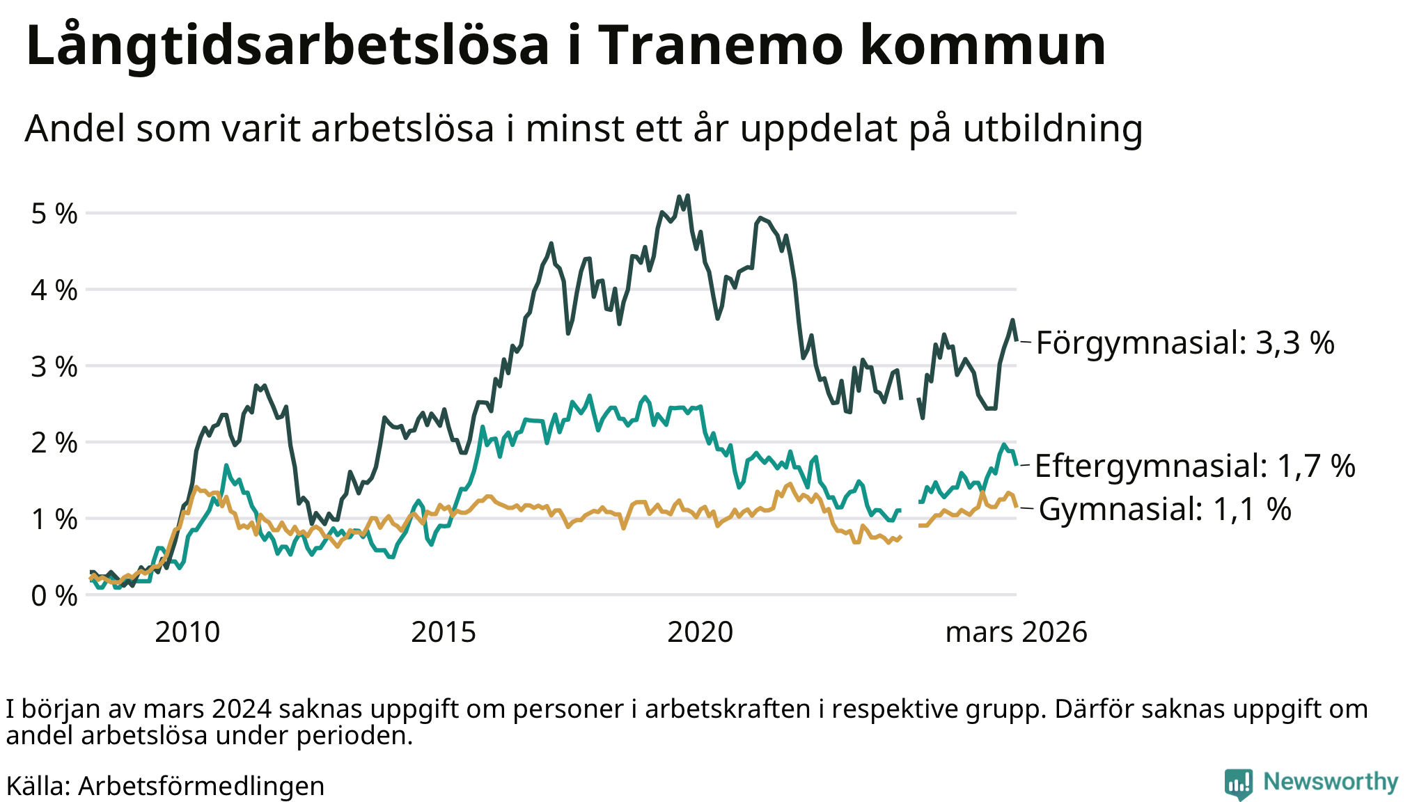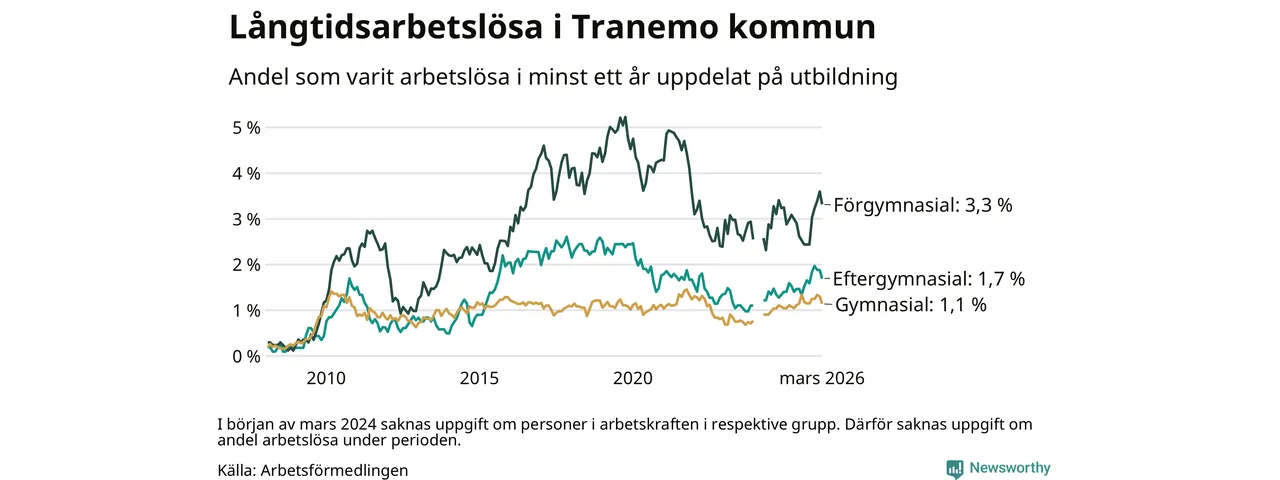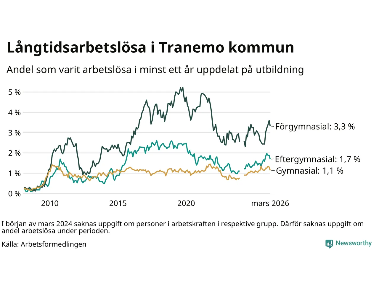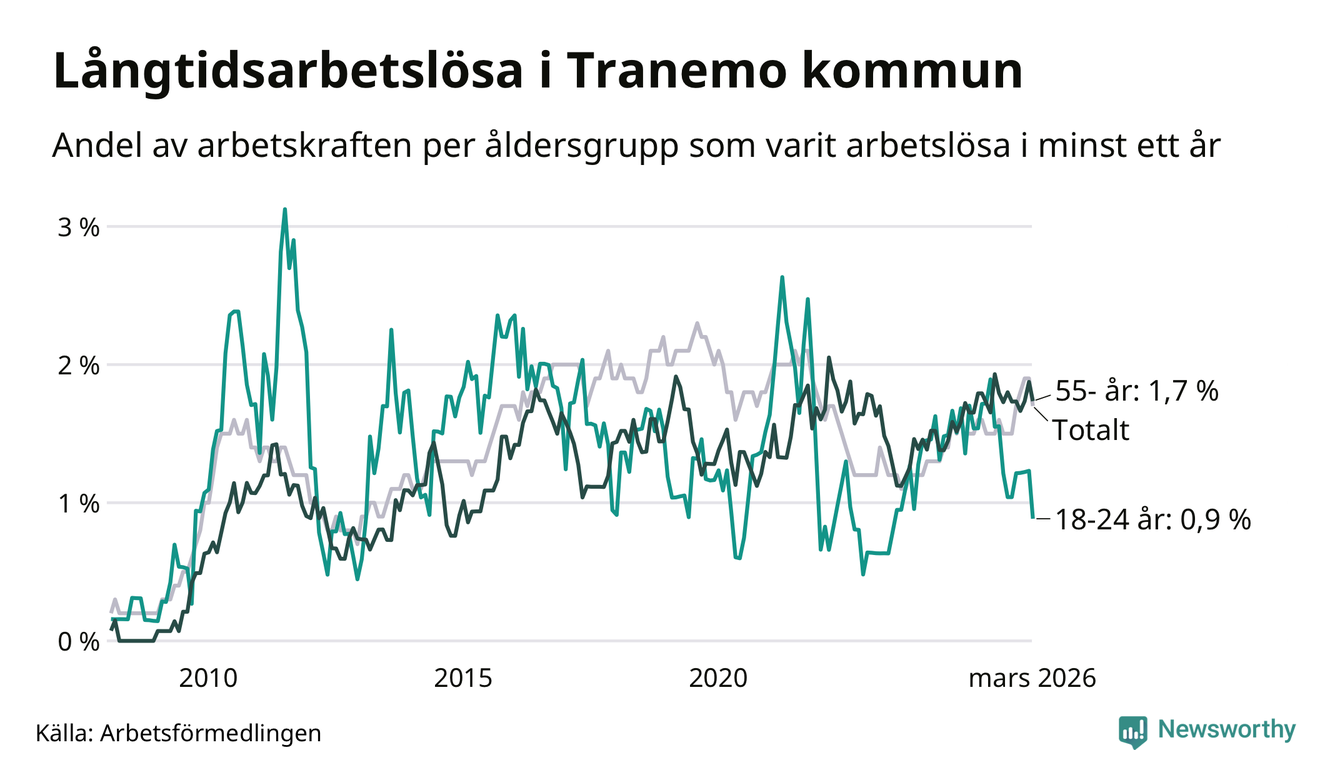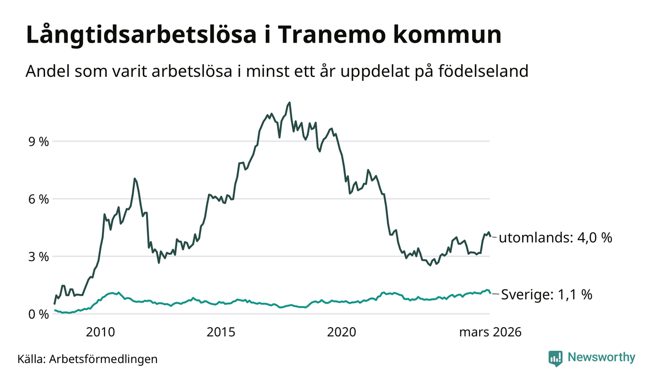 I mars hade 96 Tranemobor varit arbetslösa i minst ett år, vilket är elva färre än månaden innan. Det är den första månaden sedan oktober 2025 som antalet arbetslösa minskar. 96 personer motsvarar 1,7 procent av arbetskraften i kommunen – andelen långtidsarbetslösa är ungefär på samma nivå som för ett år sedan.