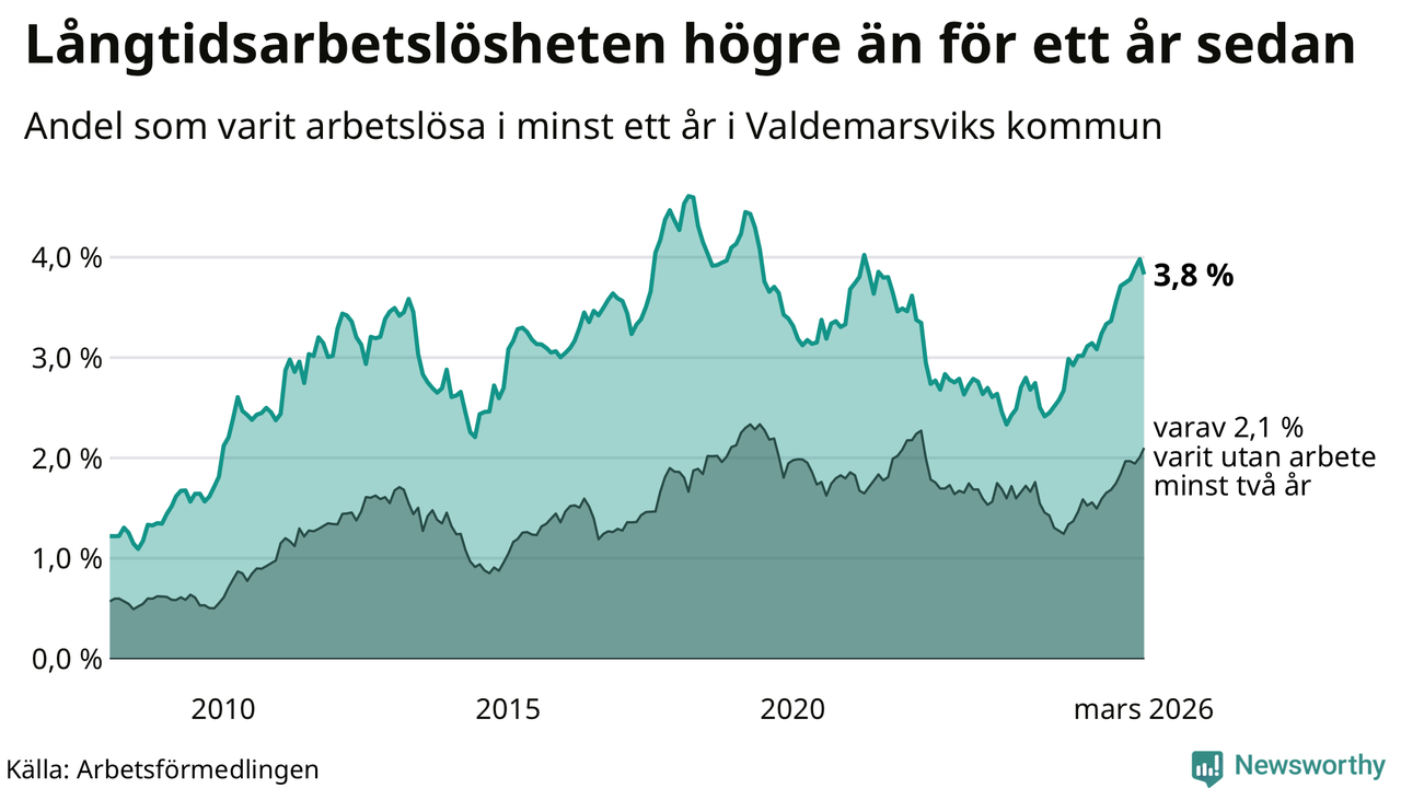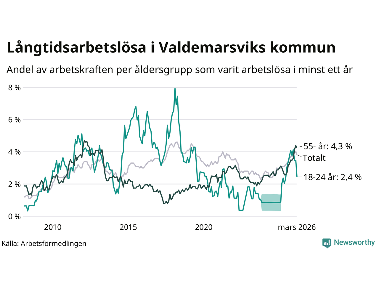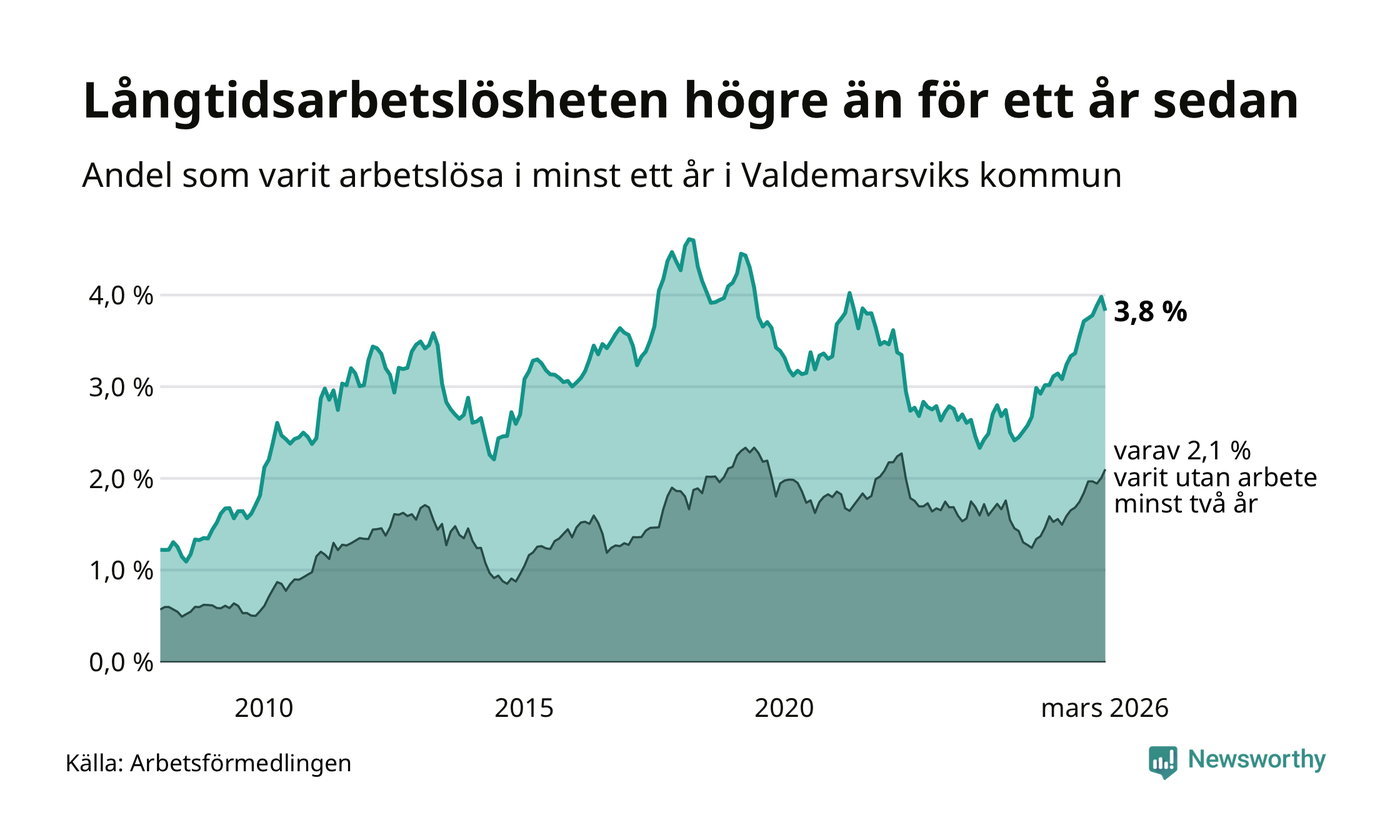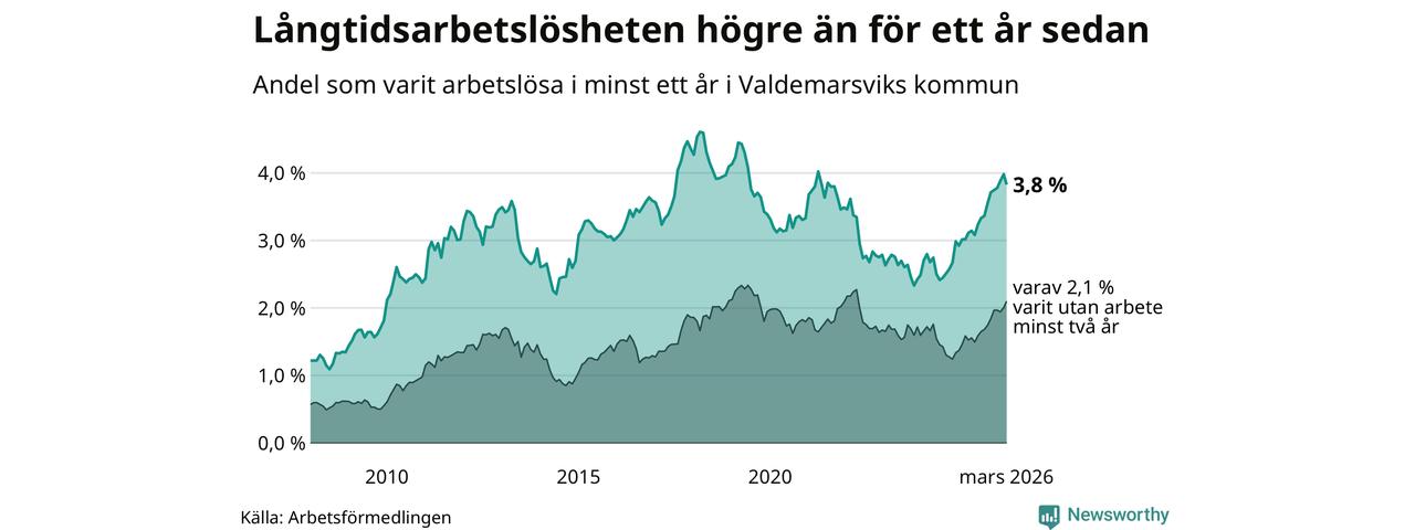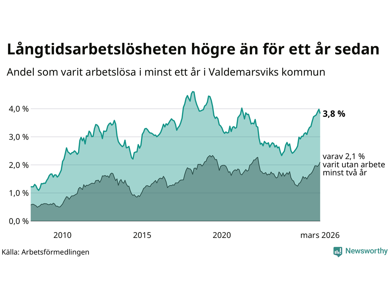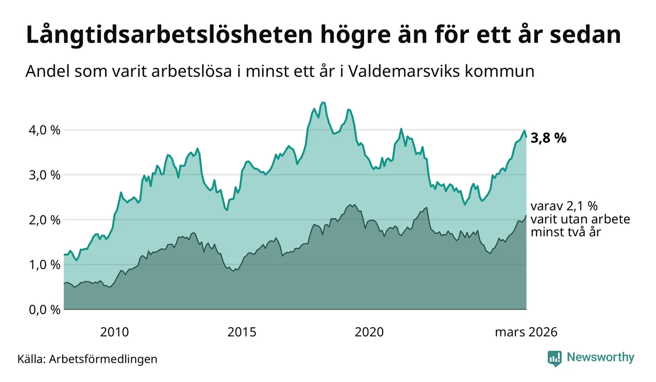 I mars hade 124 Valdemarsviksbor varit arbetslösa i minst ett år, vilket är fem färre än månaden innan. Det är den första månaden sedan maj 2025 som antalet arbetslösa minskar. 124 personer motsvarar 3,8 procent av arbetskraften i kommunen – andelen långtidsarbetslösa är 0,7 procentenheter högre än samma månad för ett år sedan.