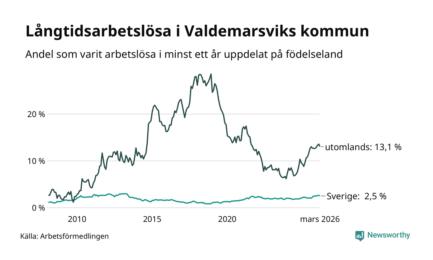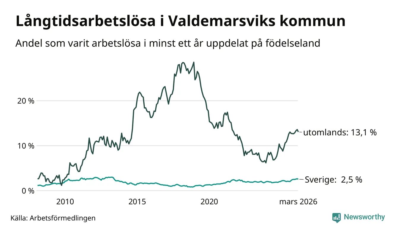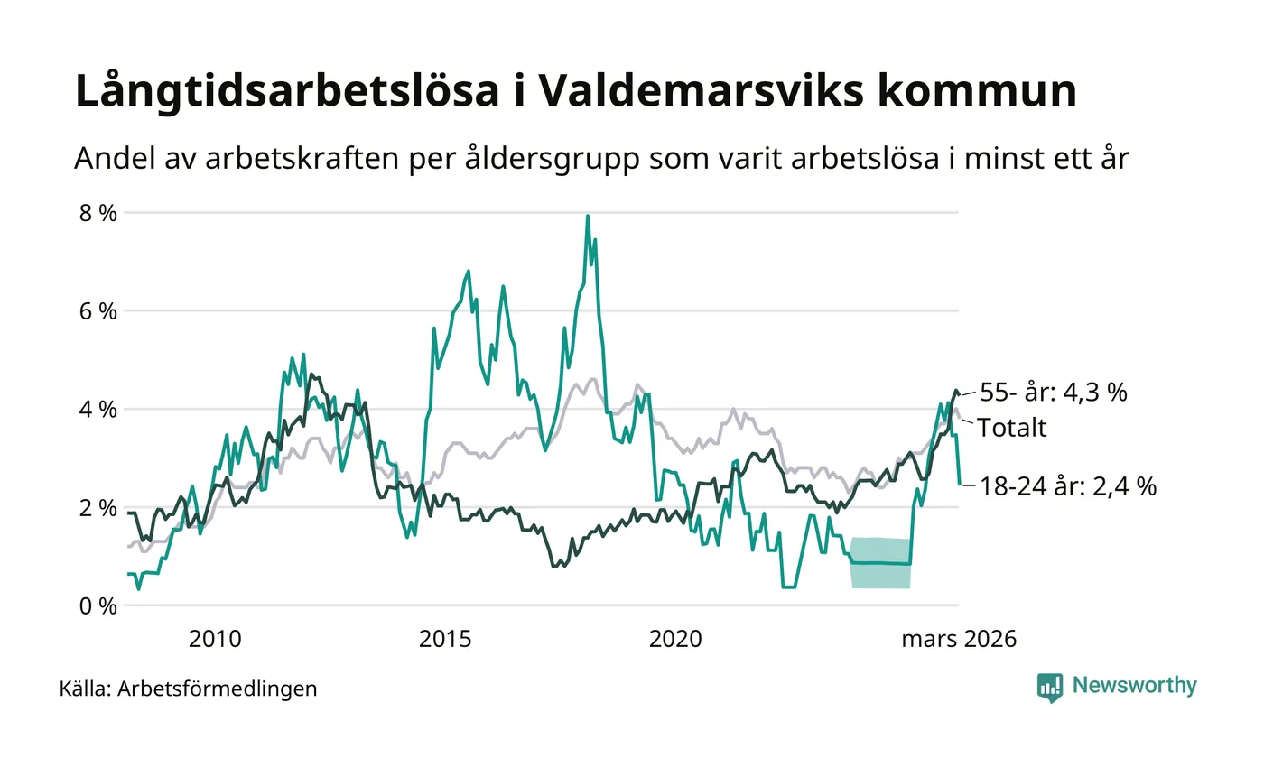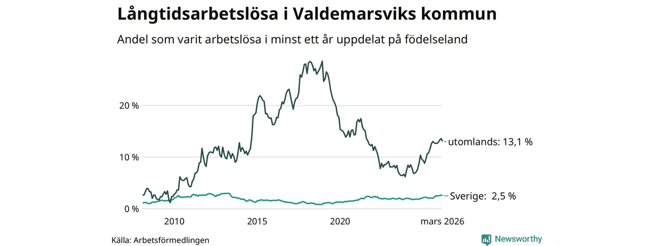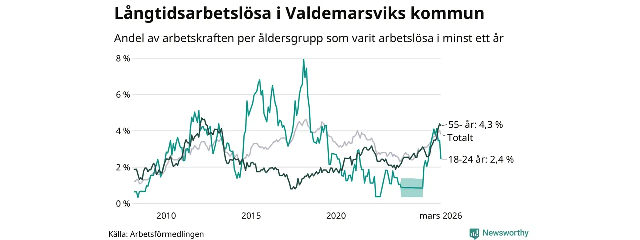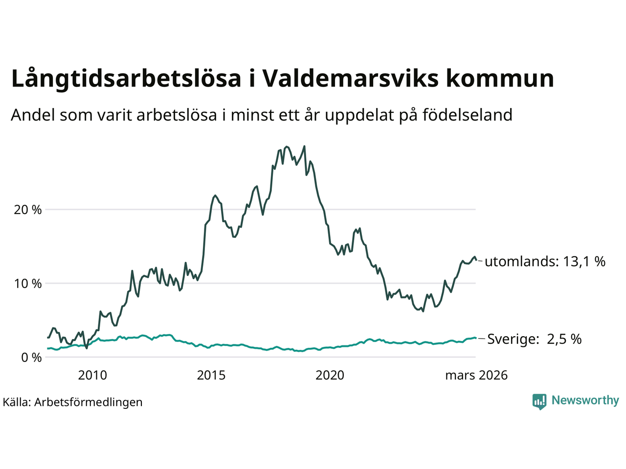 I mars hade 124 Valdemarsviksbor varit arbetslösa i minst ett år, vilket är fem färre än månaden innan. Det är den första månaden sedan maj 2025 som antalet arbetslösa minskar. 124 personer motsvarar 3,8 procent av arbetskraften i kommunen – andelen långtidsarbetslösa är 0,7 procentenheter högre än samma månad för ett år sedan.