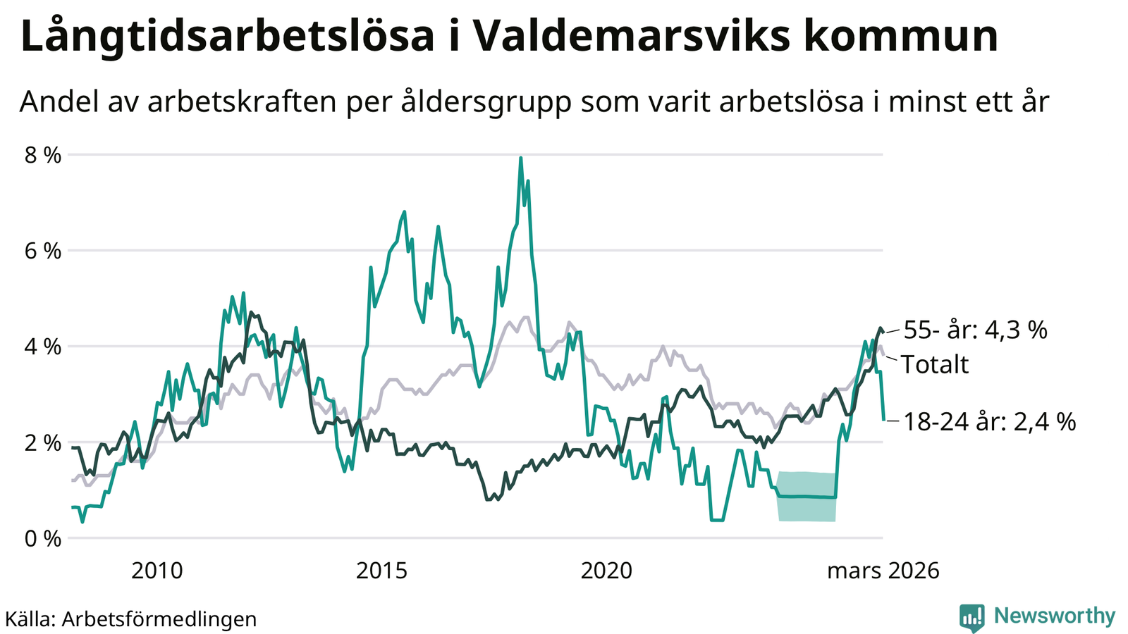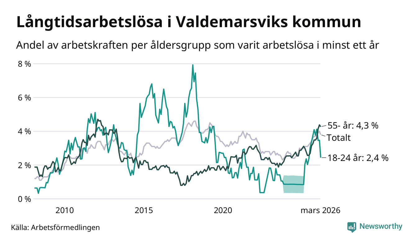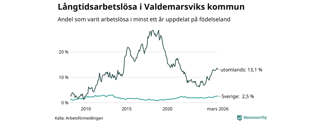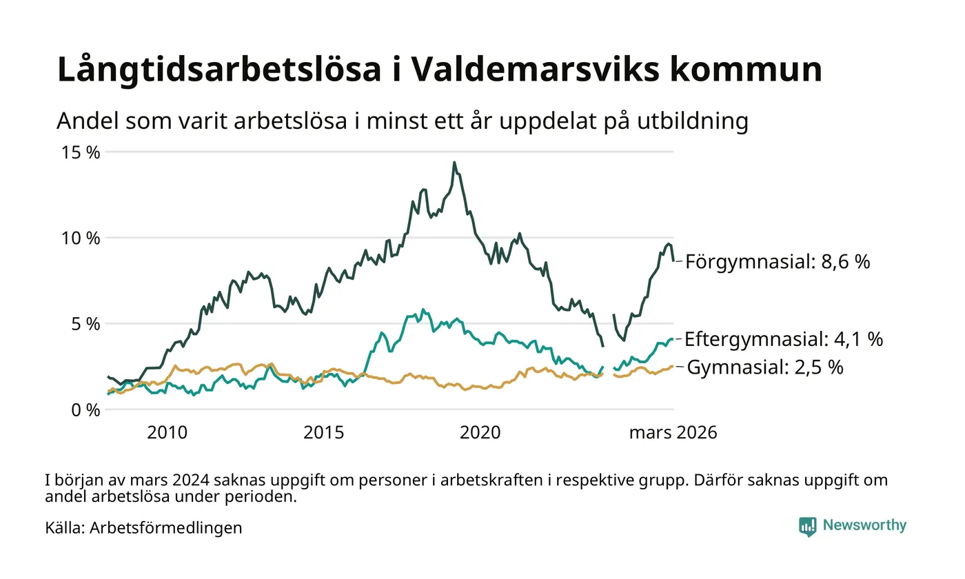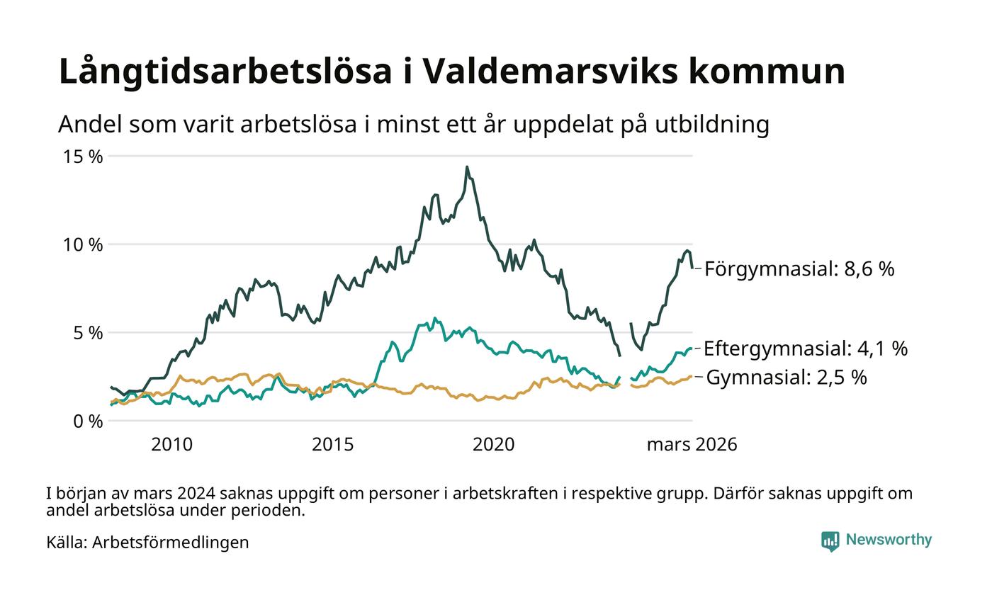 I mars hade 124 Valdemarsviksbor varit arbetslösa i minst ett år, vilket är fem färre än månaden innan. Det är den första månaden sedan maj 2025 som antalet arbetslösa minskar. 124 personer motsvarar 3,8 procent av arbetskraften i kommunen – andelen långtidsarbetslösa är 0,7 procentenheter högre än samma månad för ett år sedan.