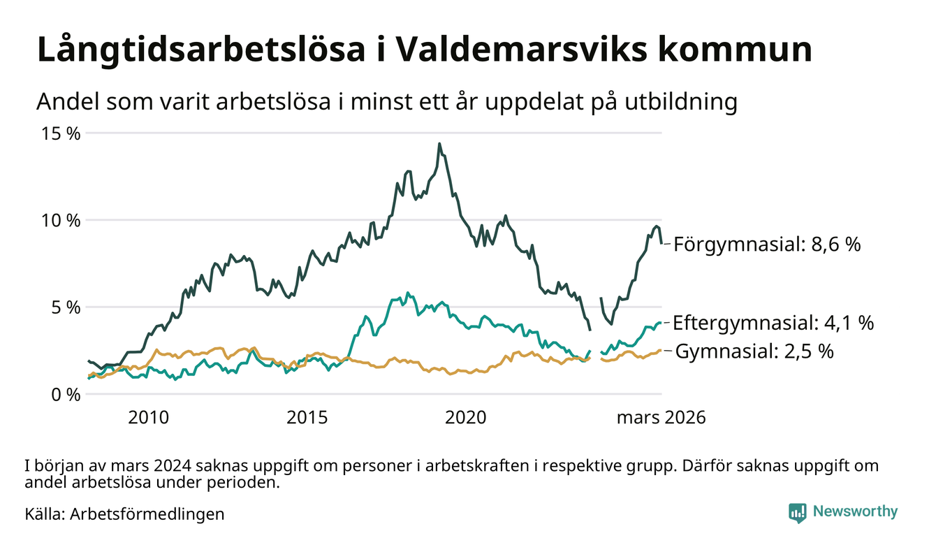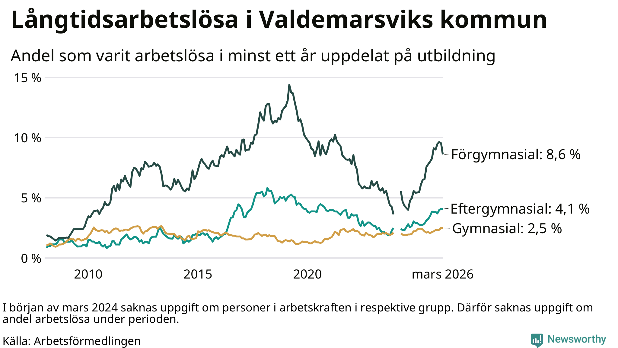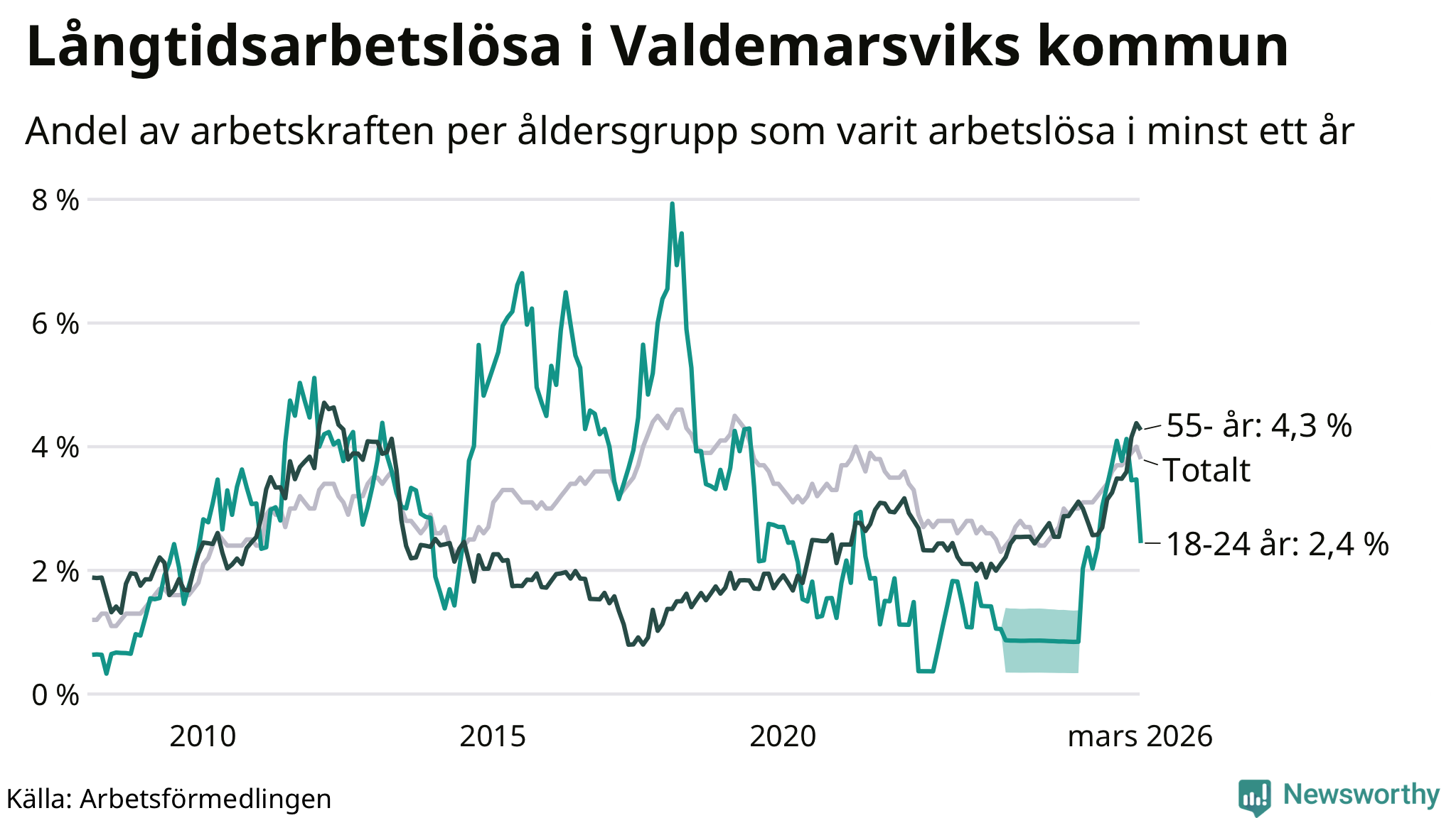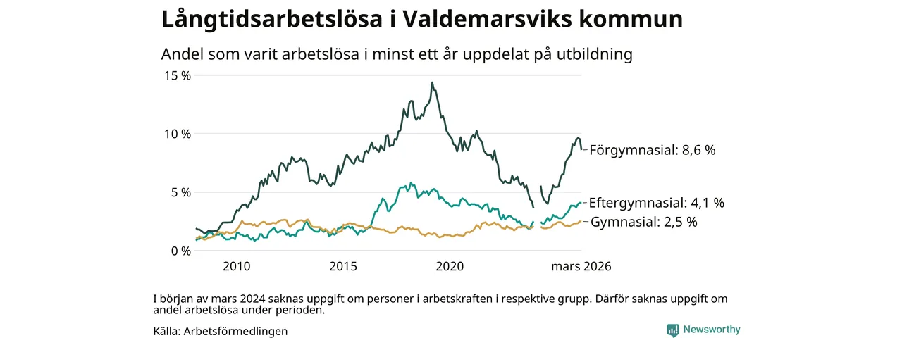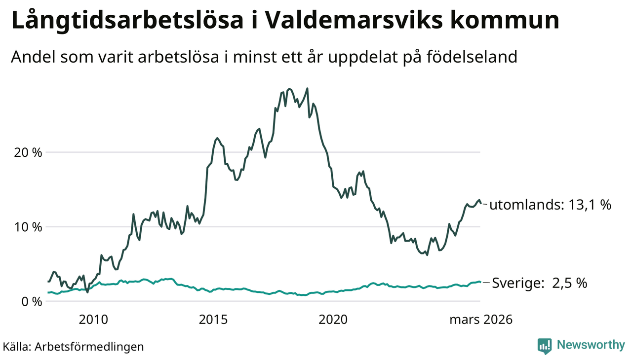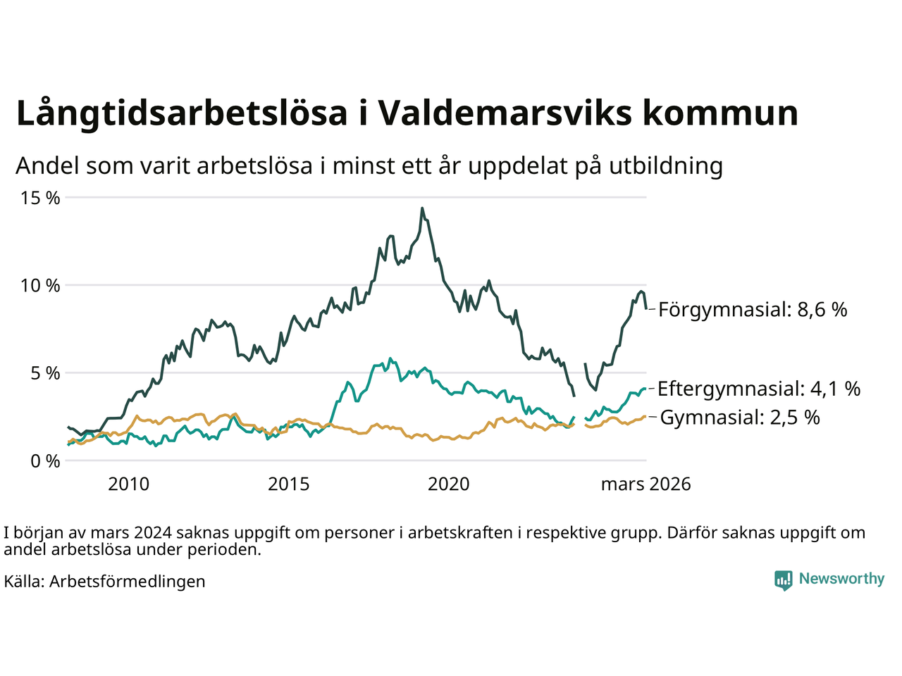 I mars hade 124 Valdemarsviksbor varit arbetslösa i minst ett år, vilket är fem färre än månaden innan. Det är den första månaden sedan maj 2025 som antalet arbetslösa minskar. 124 personer motsvarar 3,8 procent av arbetskraften i kommunen – andelen långtidsarbetslösa är 0,7 procentenheter högre än samma månad för ett år sedan.