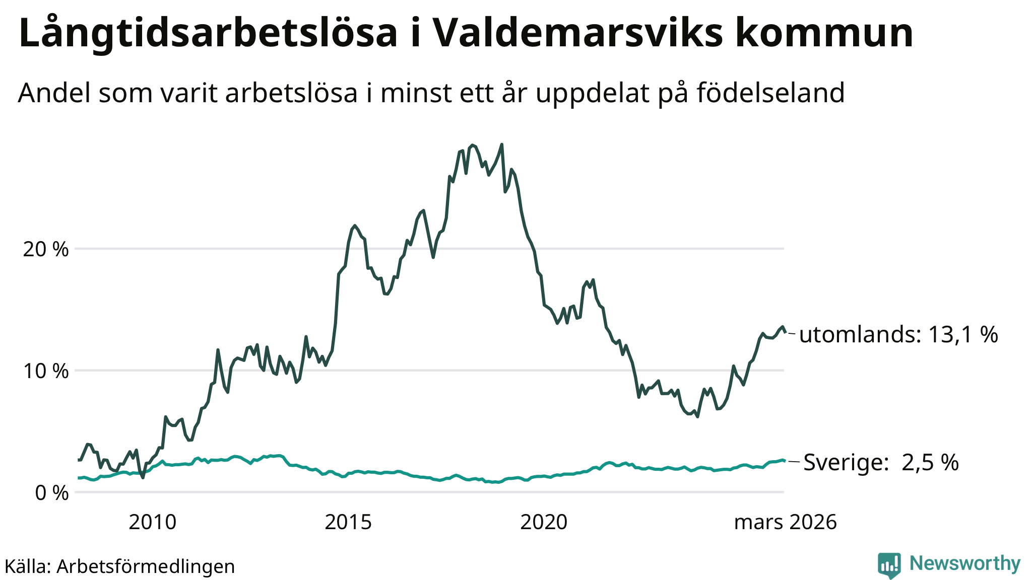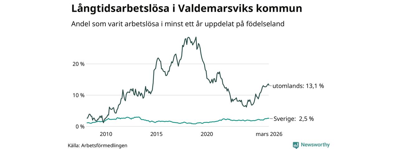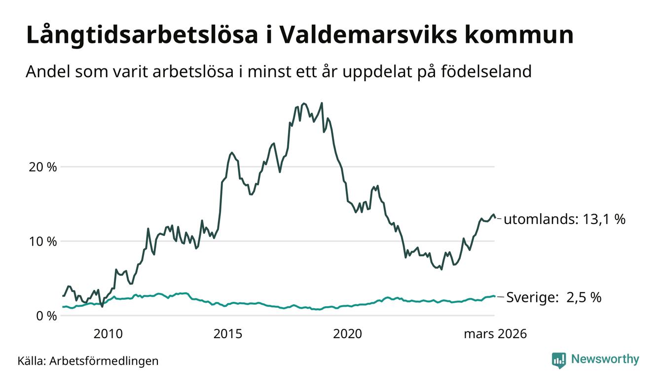 72 av de långtidsarbetslösa i Valdemarsvik är födda i Sverige, medan 52 är födda utomlands. Det innebär att långtidsarbetslösheten bland Sverigefödda är 2,5 procent, medan den är fem gånger så hög – 13,1 procent – bland födda utomlands. Även i riket som helhet är arbetslösheten högre bland utrikesfödda.