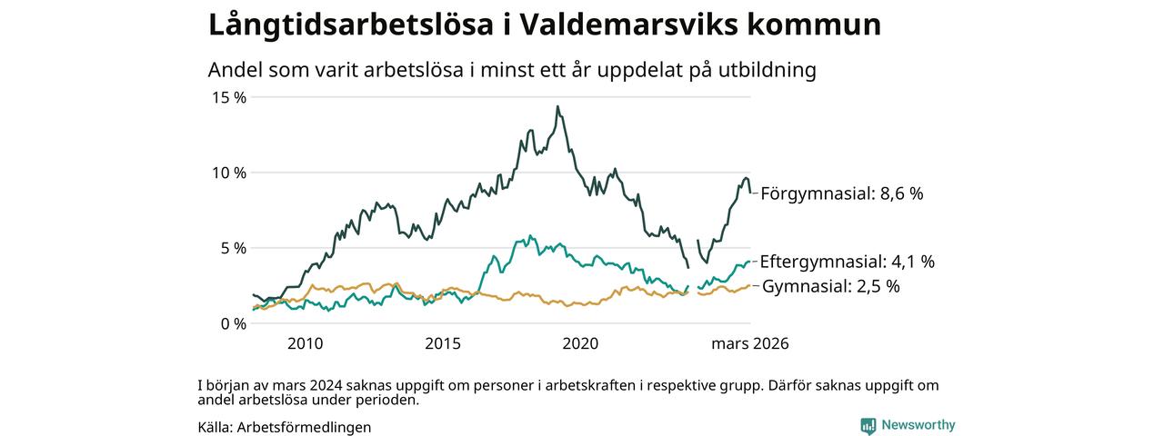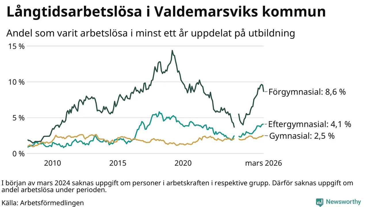 Andelen som varit utan arbete i minst ett år i Valdemarsvik i mars var högre än för ett år sedan. Men jämfört med i februari har antalet långtidsarbetslösa minskat.